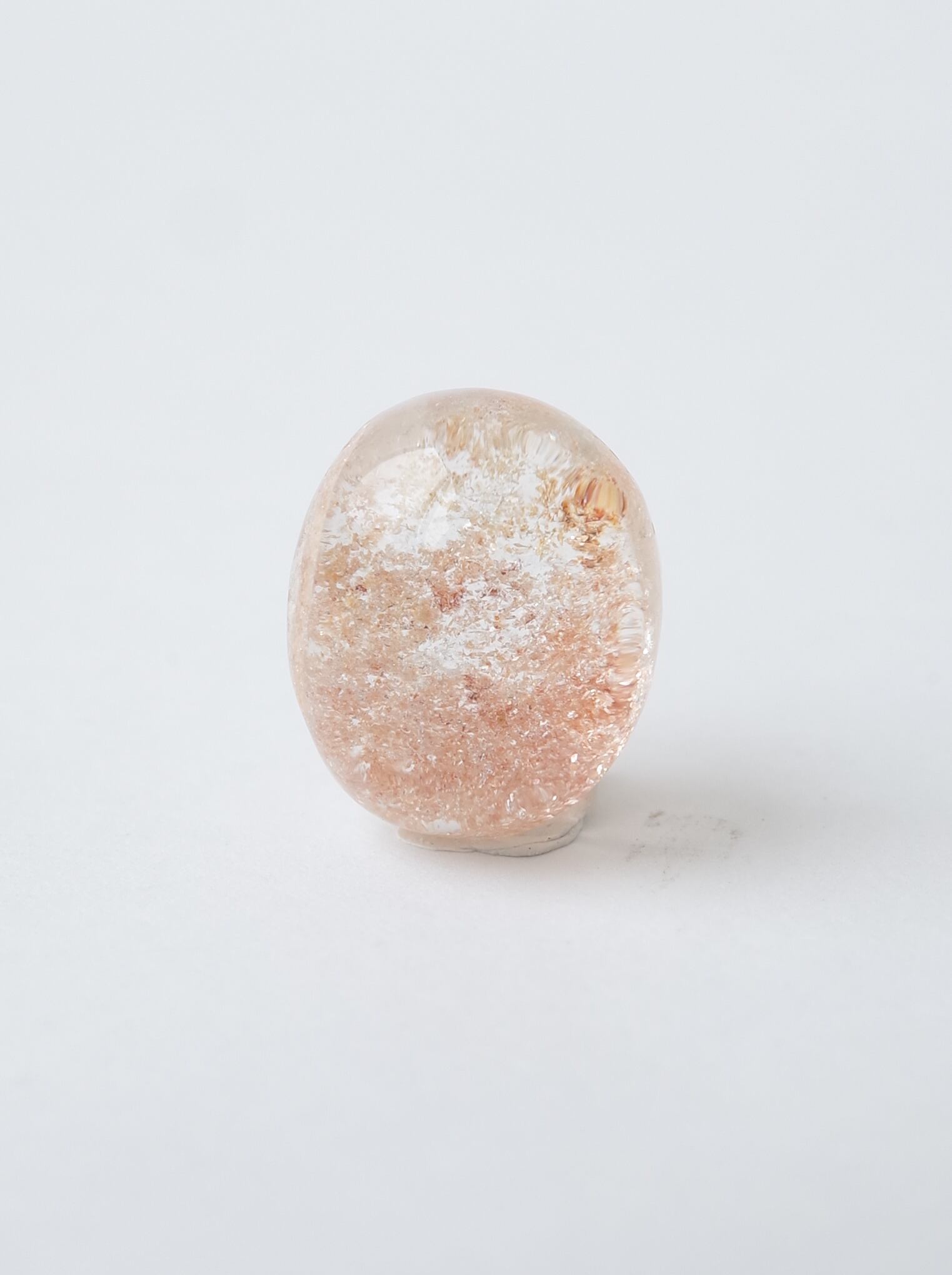 このタイプの石は底の方にイングルージョンを配置しカボションにすることで、水晶のレンズ効果により内包物を拡大させるようにカットされたものが多く、裏面には原石肌が残っているものや、充填処理が施されている石もございます。ご購入前に最後の裏面の写真もご確認ください。また内包物を含んで研磨してあるため面傷の出やすいタイプのルースです。目立つキズは避けていますが、ごく小さなものに関して殆どのルースに入っています。景色の美しさとバランスをみて判断していますので石の特徴としてお考えください。