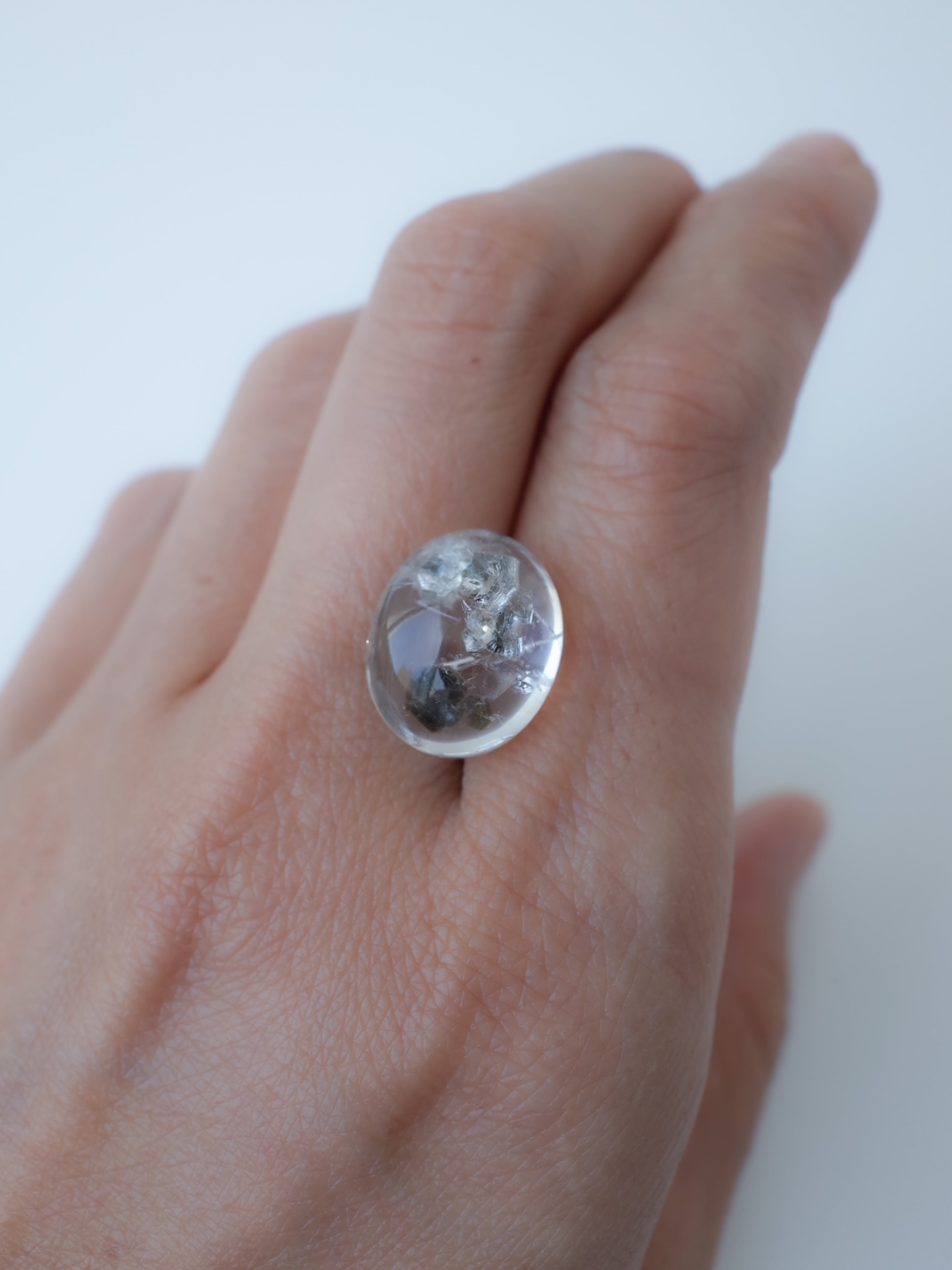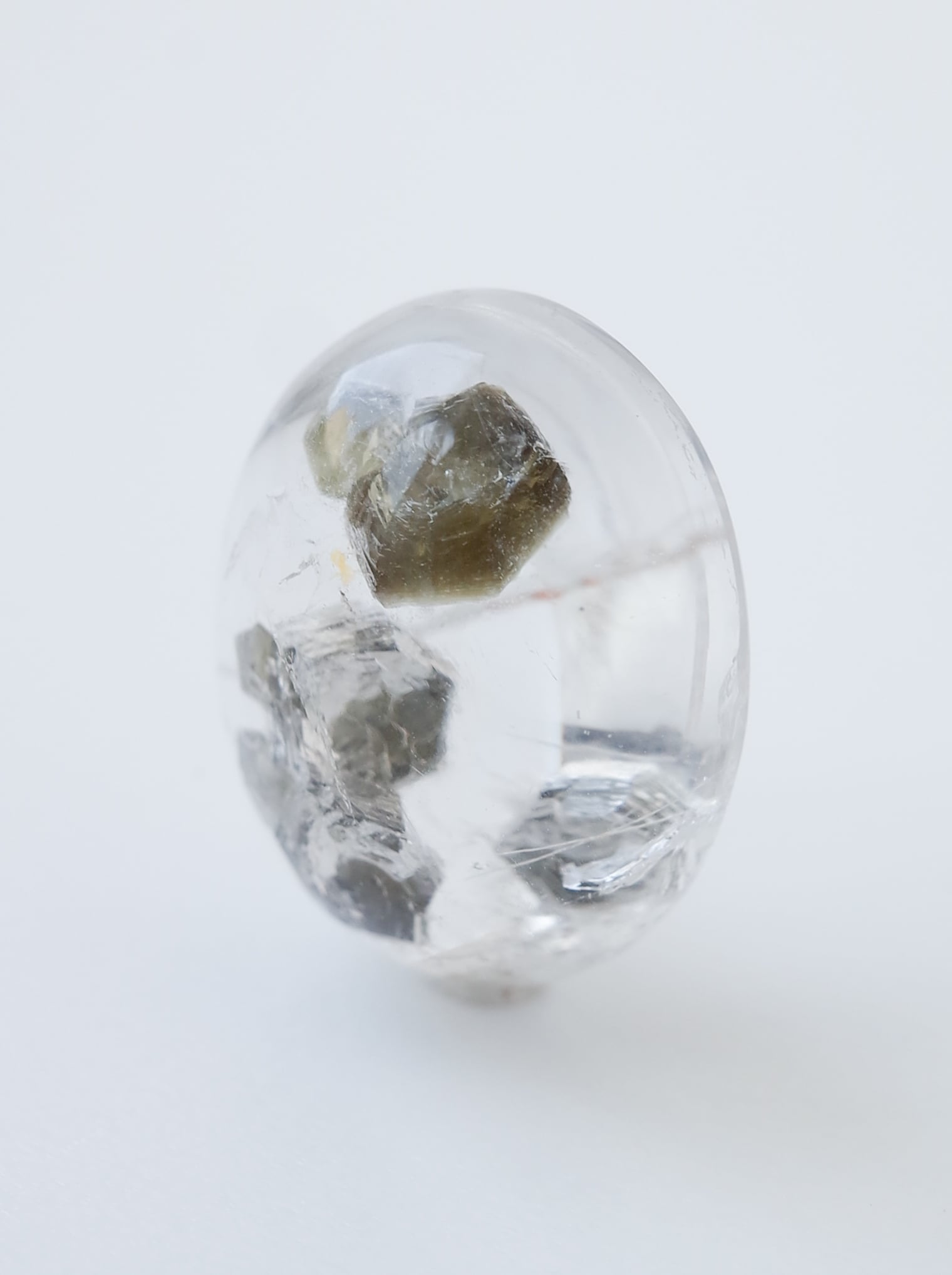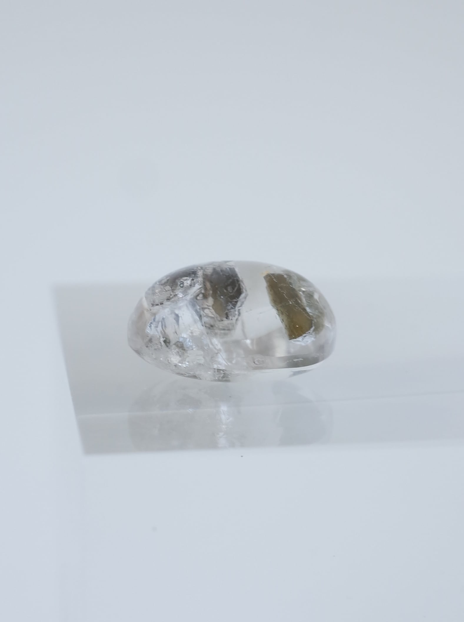 淡いグリーンの雲母の結晶が水晶の中に閉じ込められたグリーンマイカインクォーツ。マイカ(雲母)の微細な結晶がミルフィーユのように層状に重なっており、光を捉えて美しい輝きを放つちます。ルーペを通して見ると、中の結晶が成長する過程で形成される独特な模様を観察することができます。