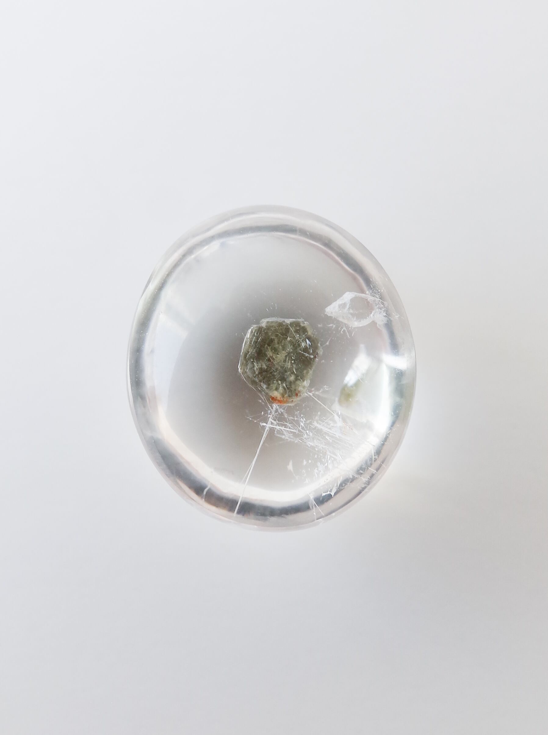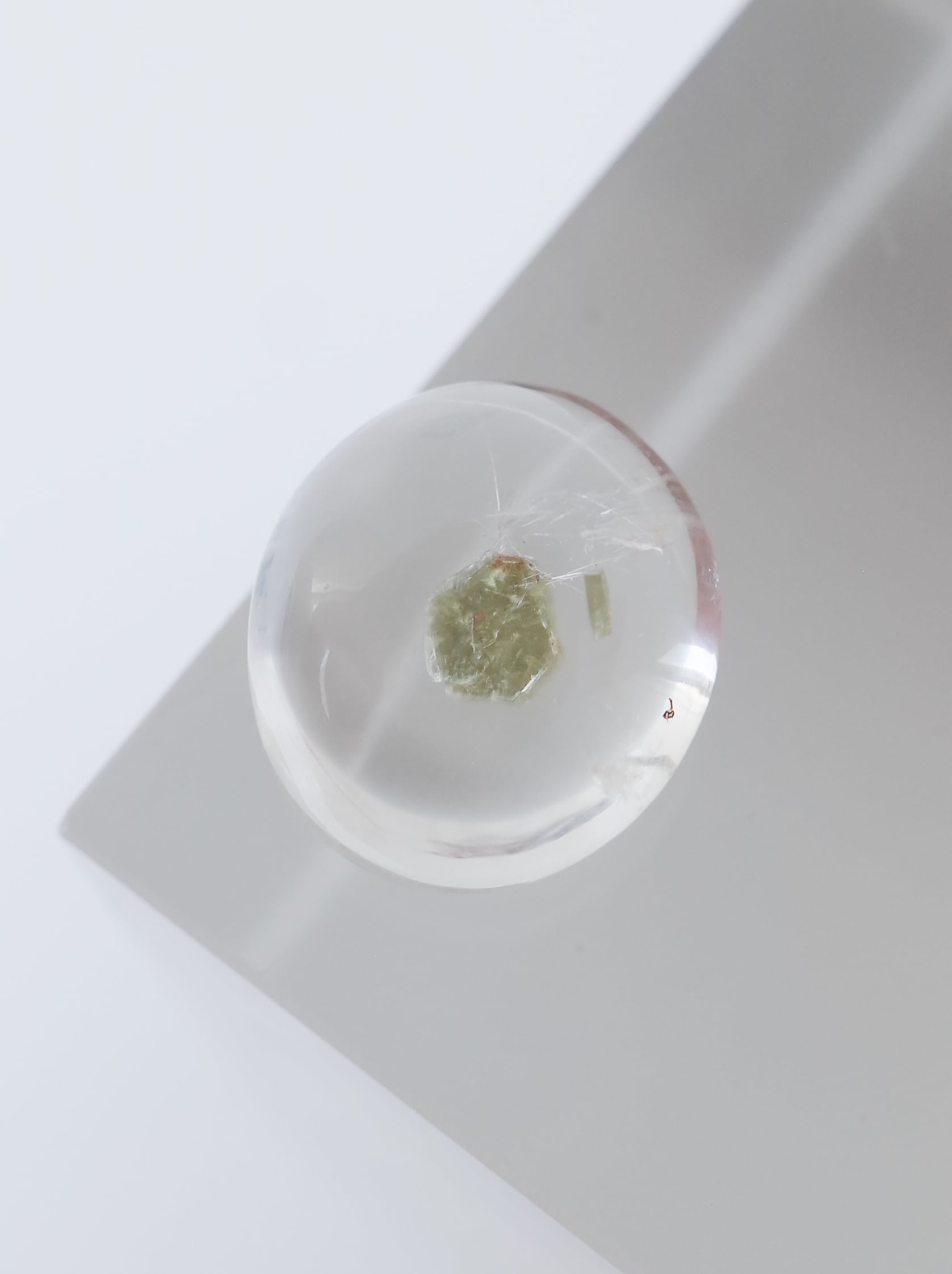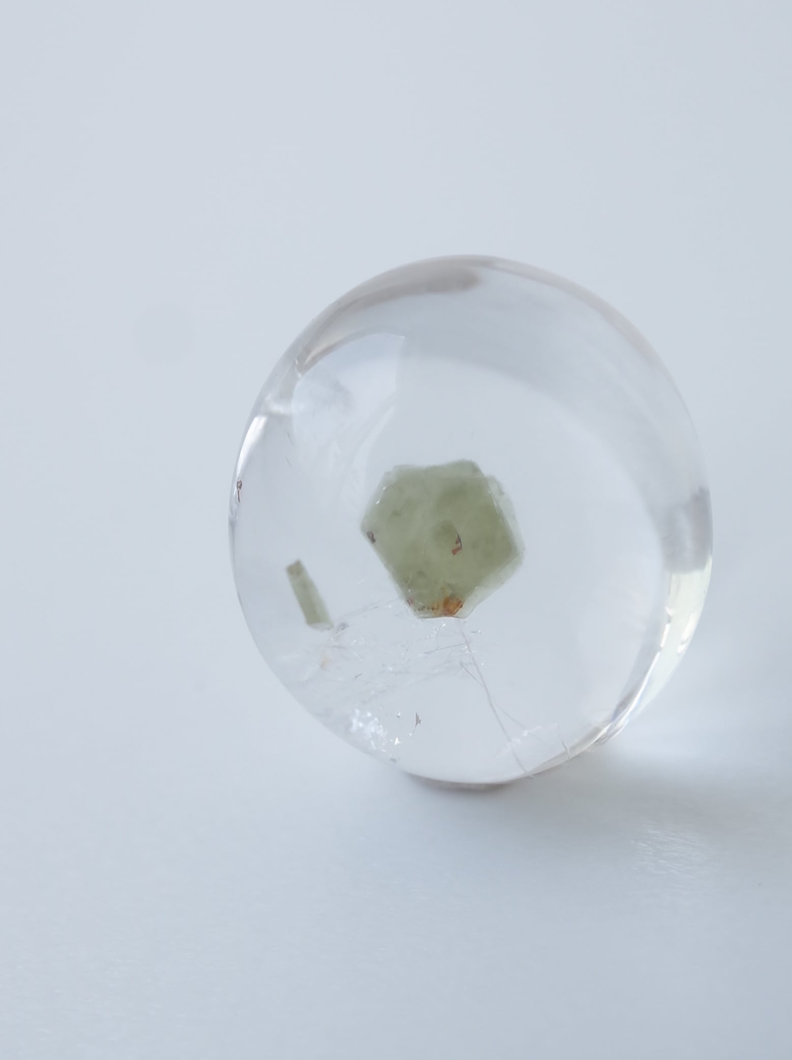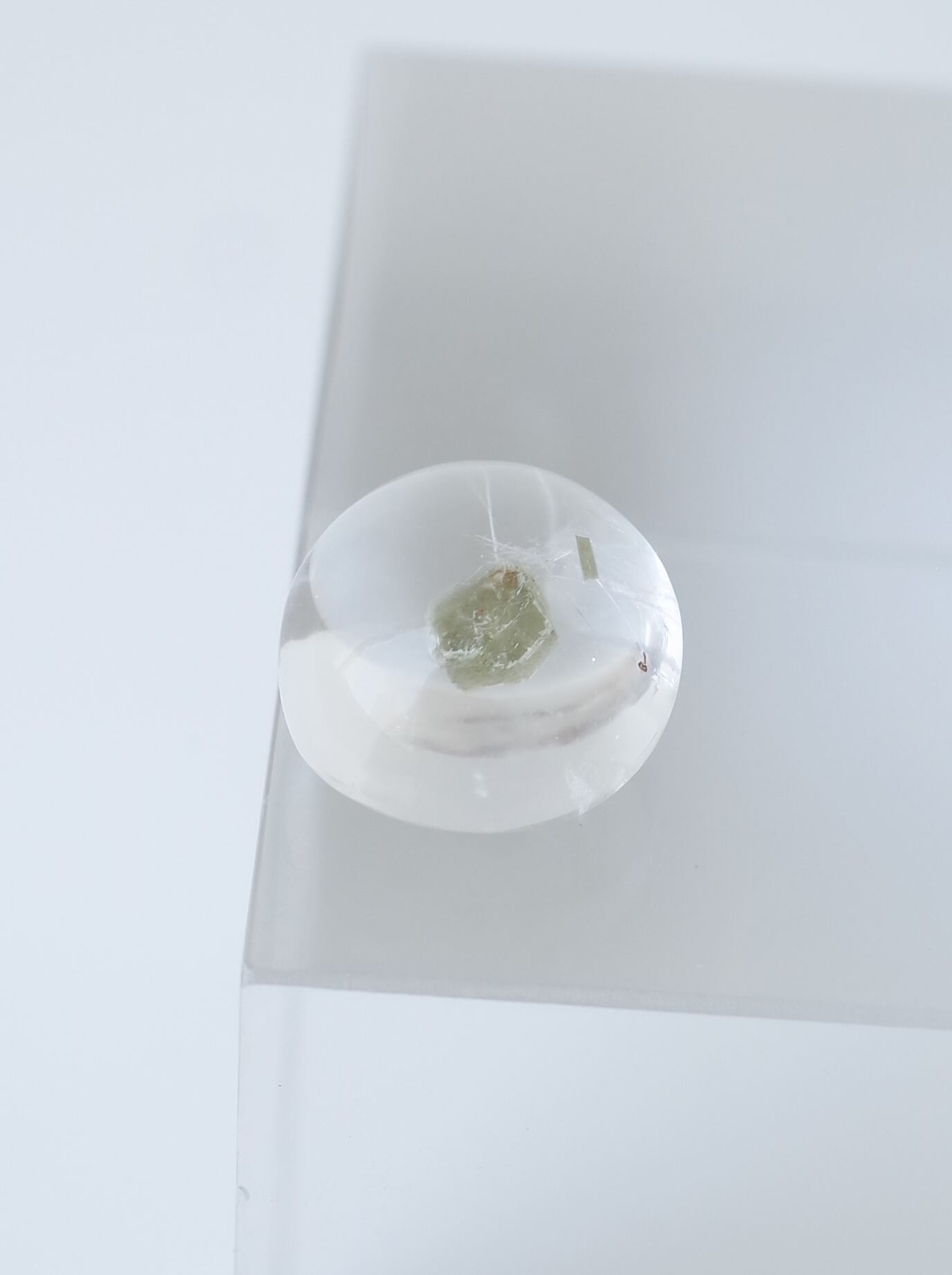 淡いグリーンの雲母の結晶が水晶の中に閉じ込められたグリーンマイカインクォーツ。マイカ(雲母)の微細な結晶がミルフィーユのように層状に重なっており、光を捉えて美しい輝きを放つちます。ルーペを通して見ると、中の結晶が成長する過程で形成される独特な模様を観察することができます。