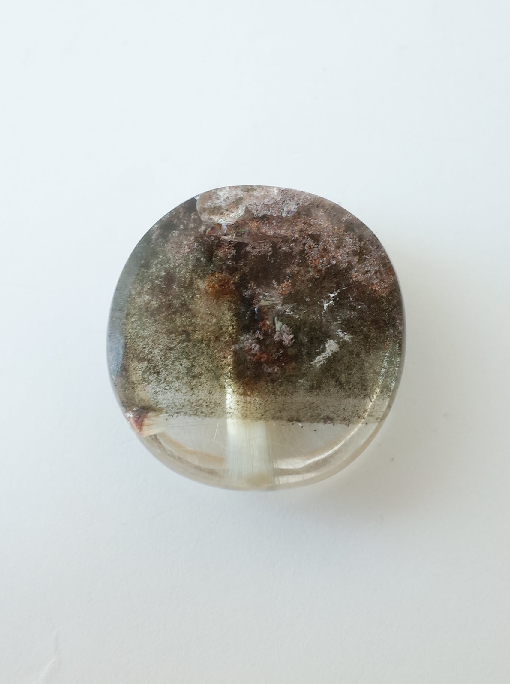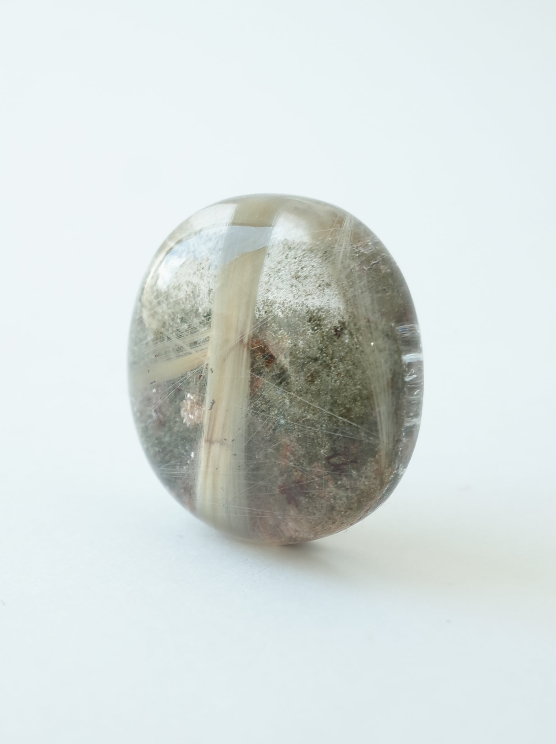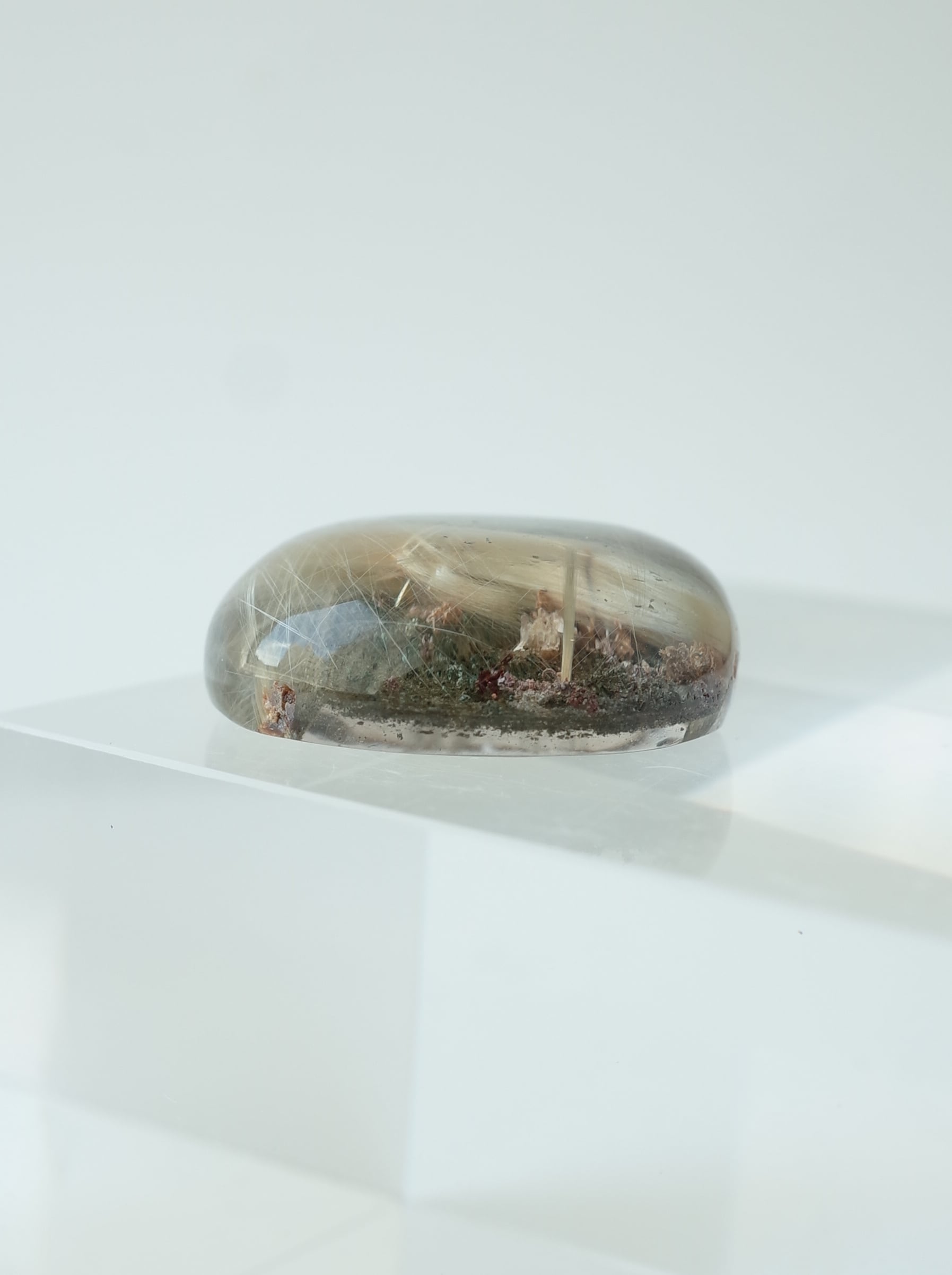「ガーデンルチルクォーツ」とは、クローライトを主成分とするようなガーデンクォーツにルチルの結晶が入り込んだもの。景色を切り取ったようなガーデンに、ルチルの輝きが重なり合い、まるで「自然の庭園」に光が差し込むような神秘的な美しさを持つ一石です。