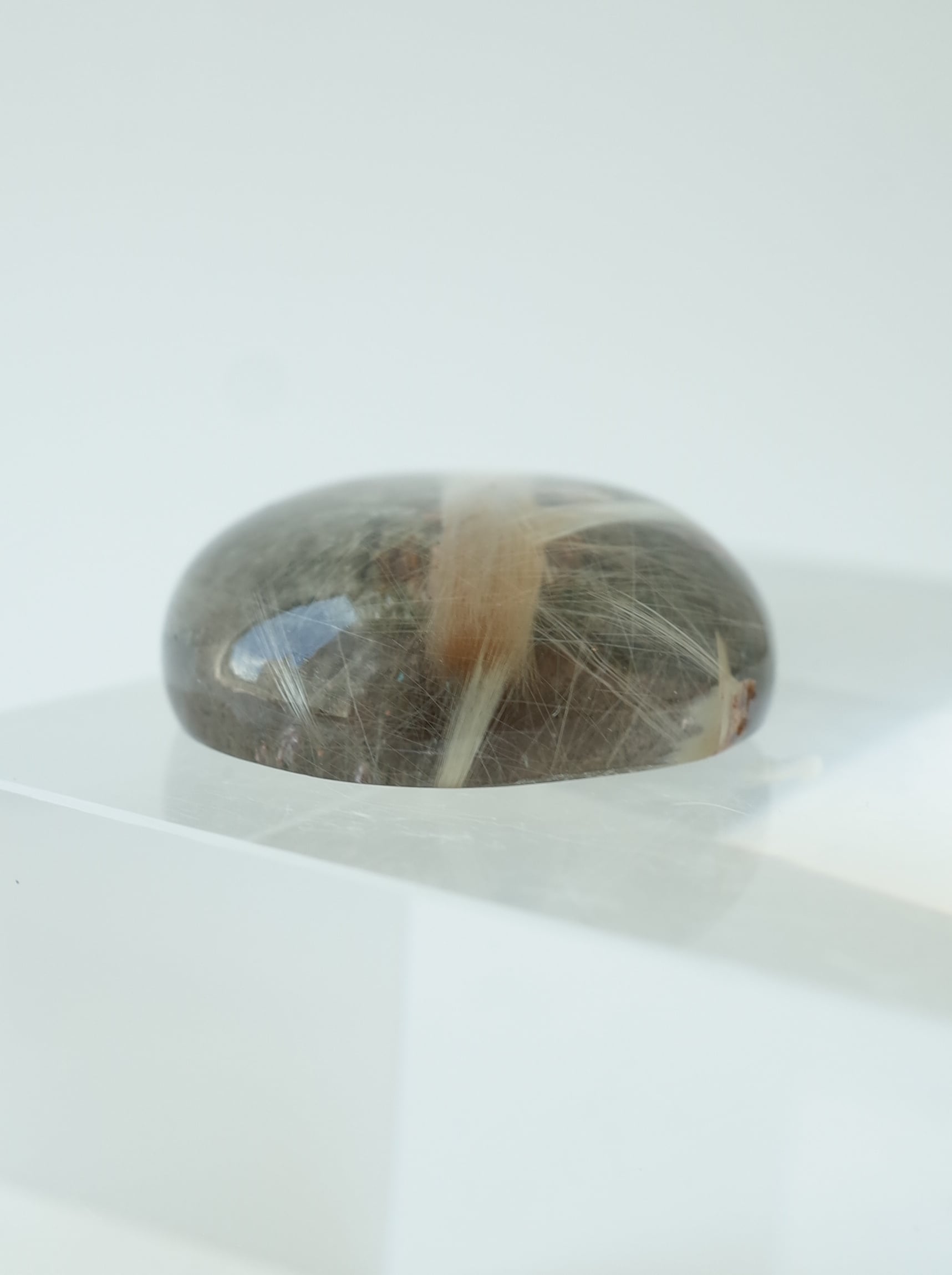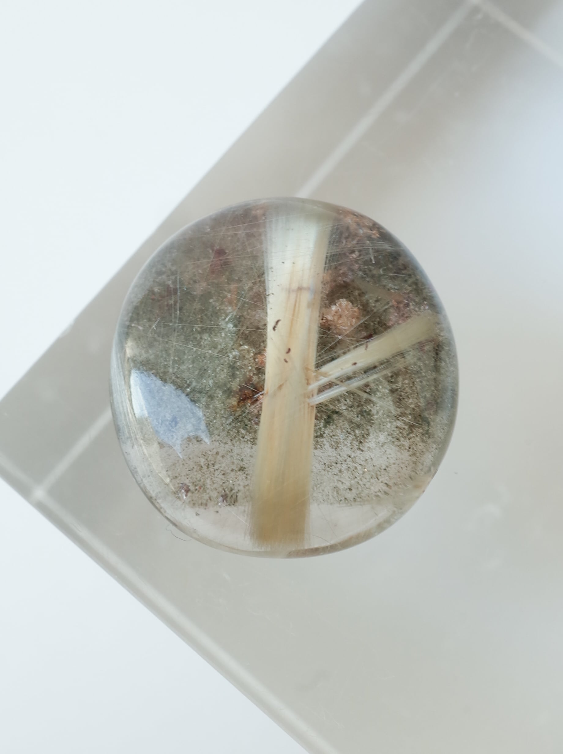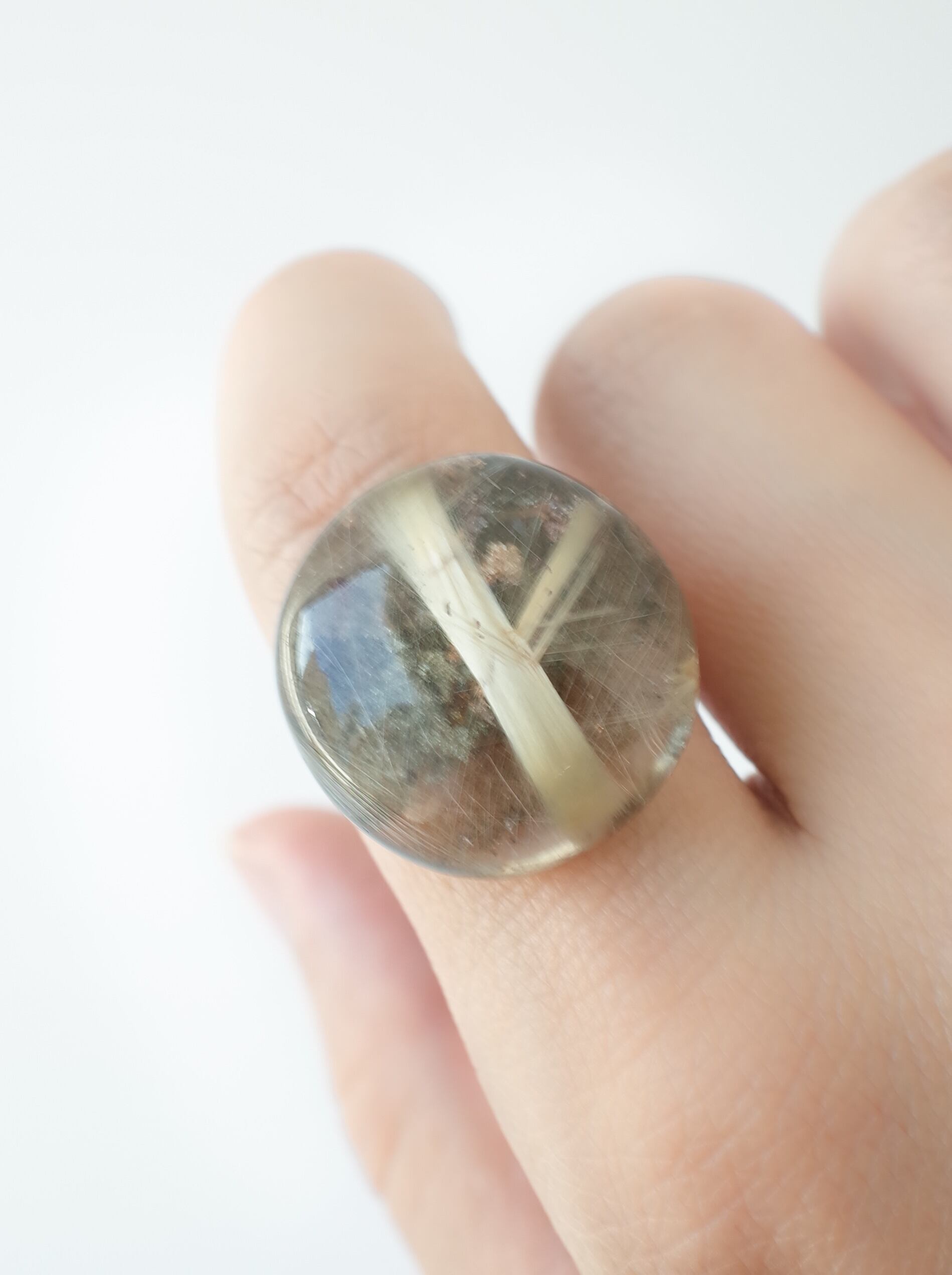 「ガーデンルチルクォーツ」とは、クローライトを主成分とするようなガーデンクォーツにルチルの結晶が入り込んだもの。景色を切り取ったようなガーデンに、ルチルの輝きが重なり合い、まるで「自然の庭園」に光が差し込むような神秘的な美しさを持つ一石です。