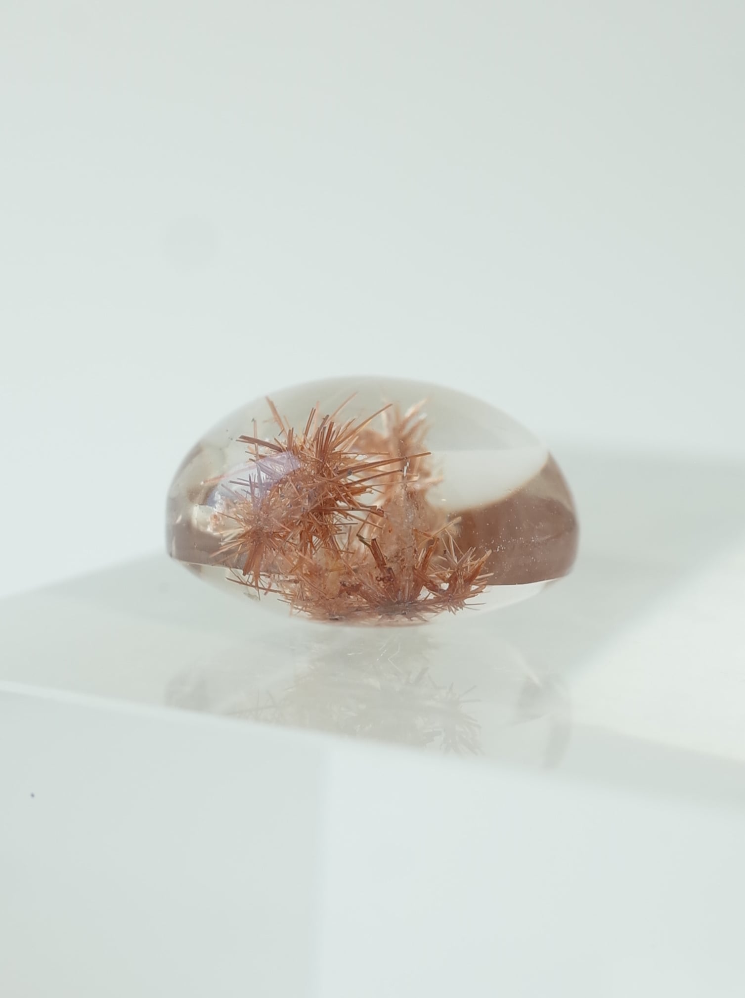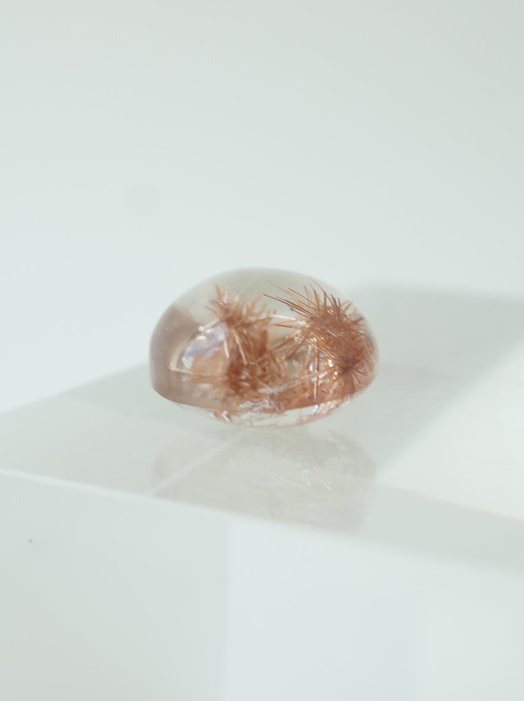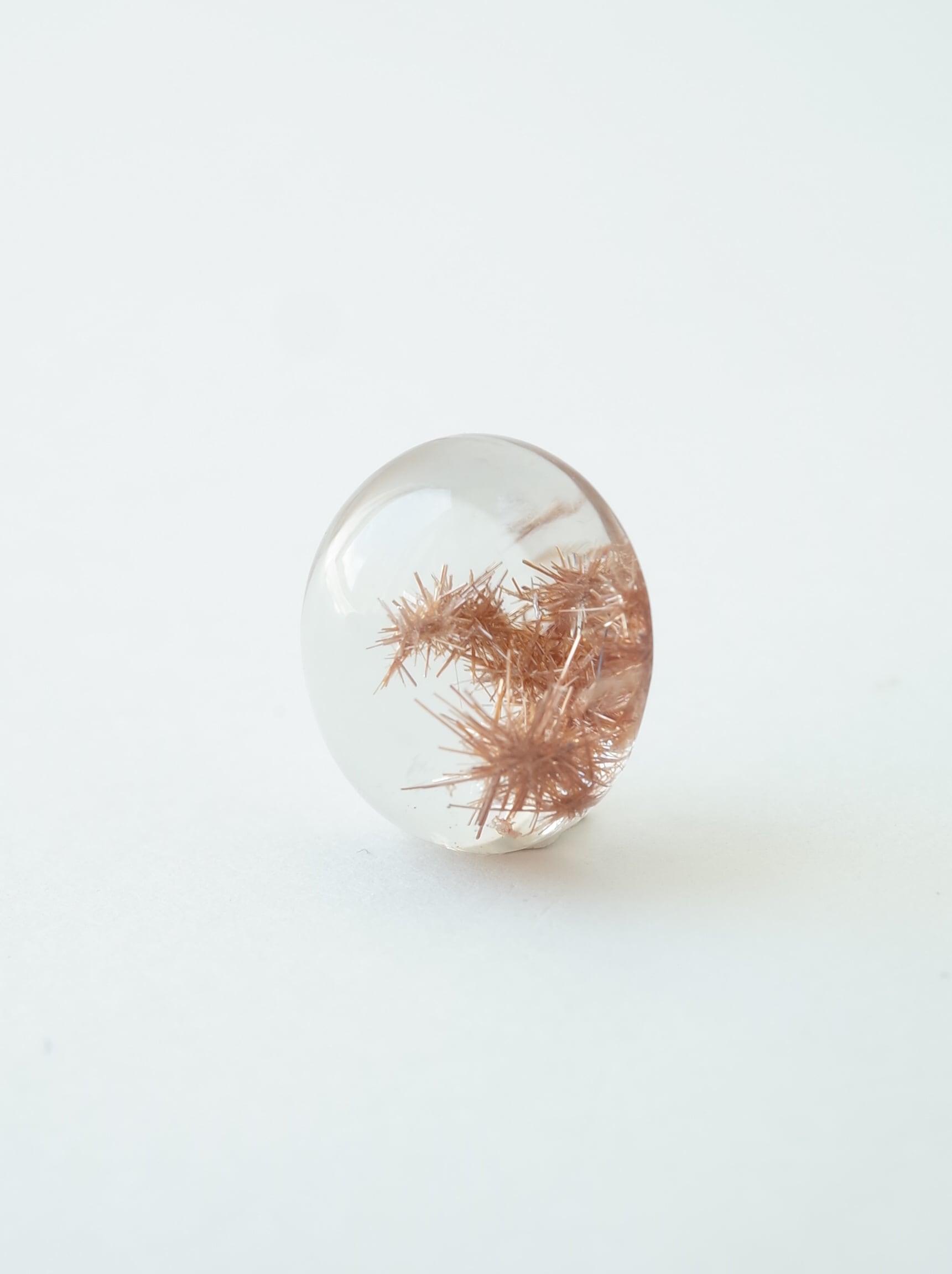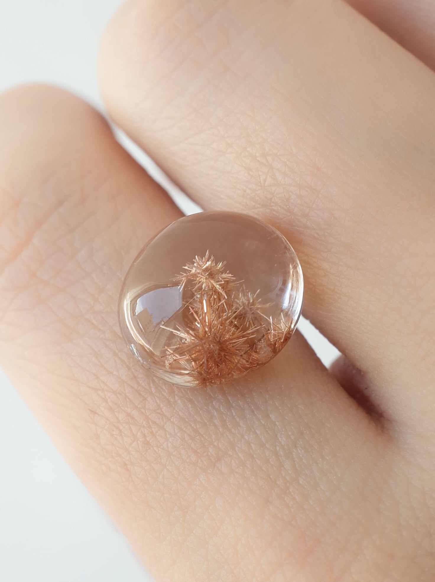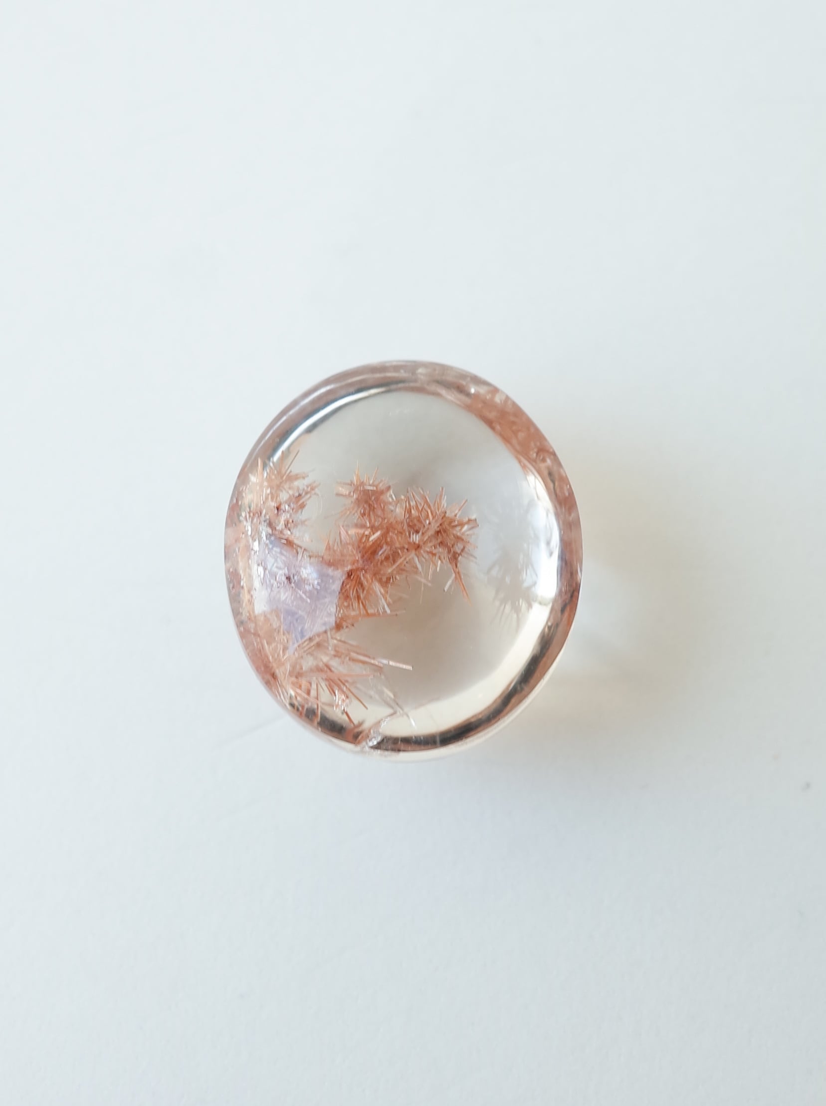 「フラワールチルクォーツ」とは、ルチルクォーツの中でも、小さな放射状のルチルの結晶が沢山集まり、まるで花が咲いたように見える可愛らしいタイプです。ひまわり畑のようだったり、秋の紅葉のようだったり、景色を切り取ったような美しさが魅力です。