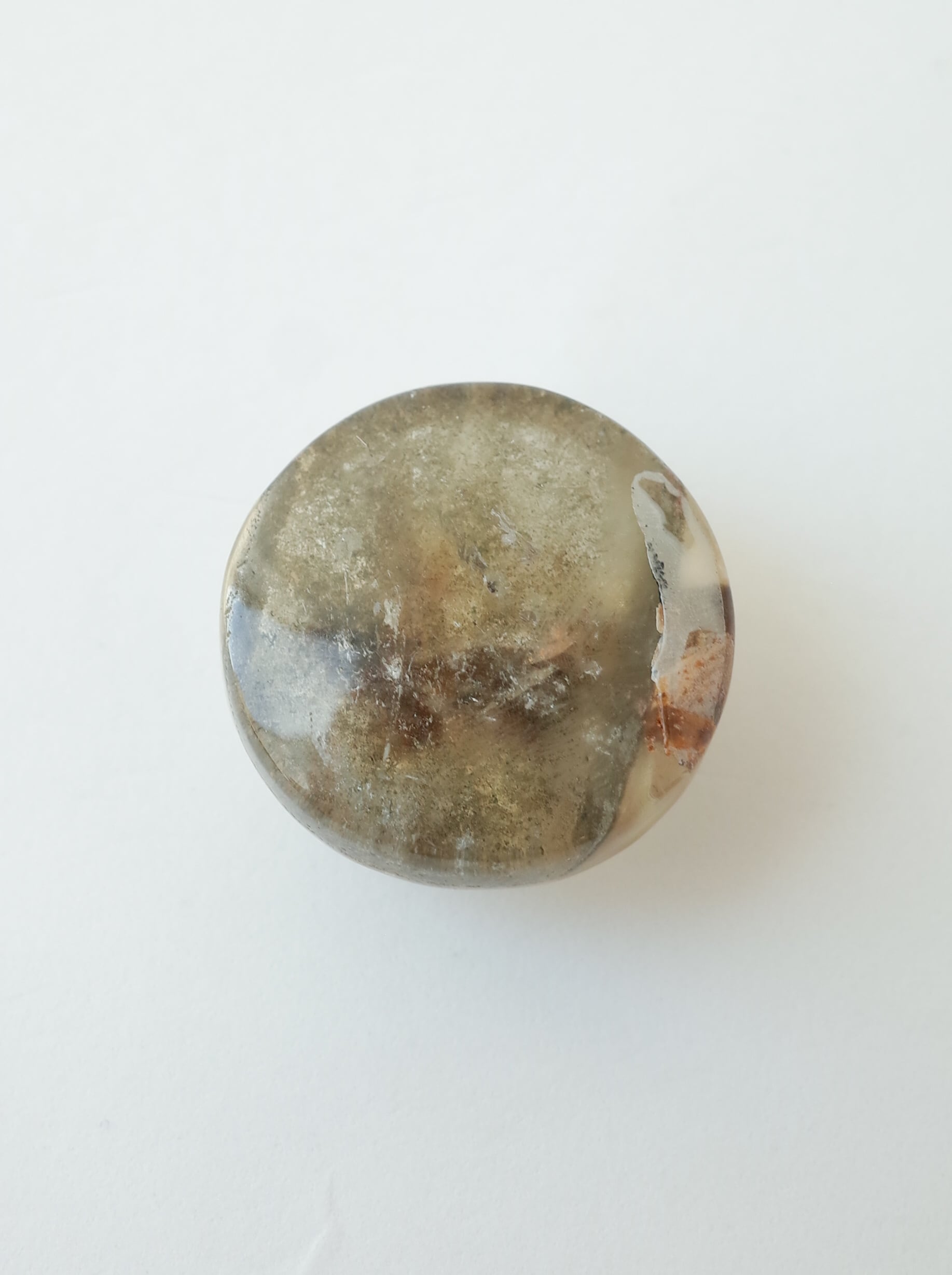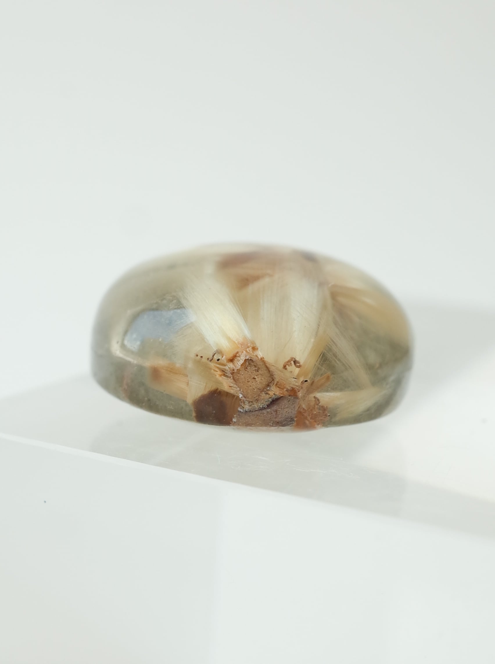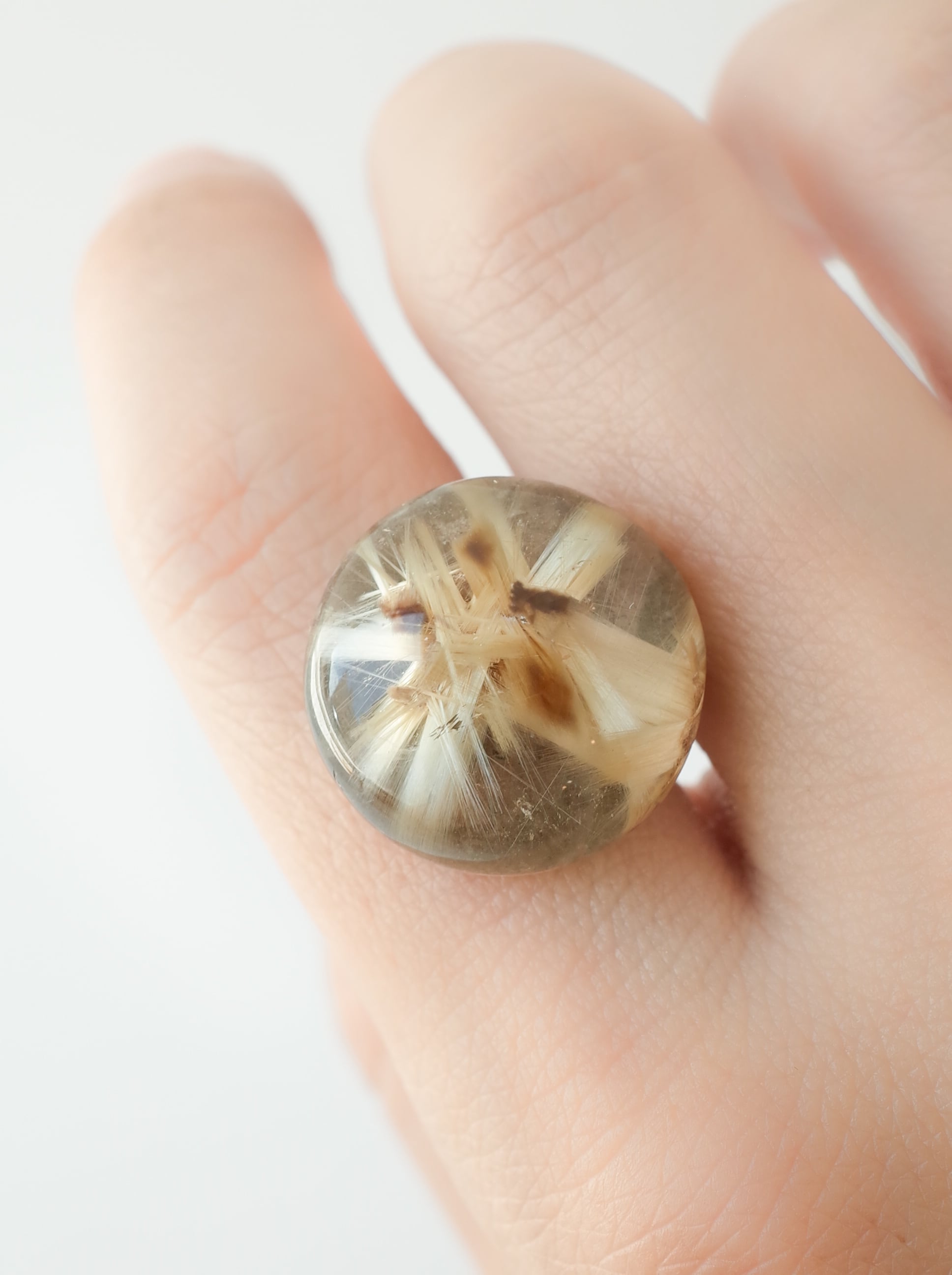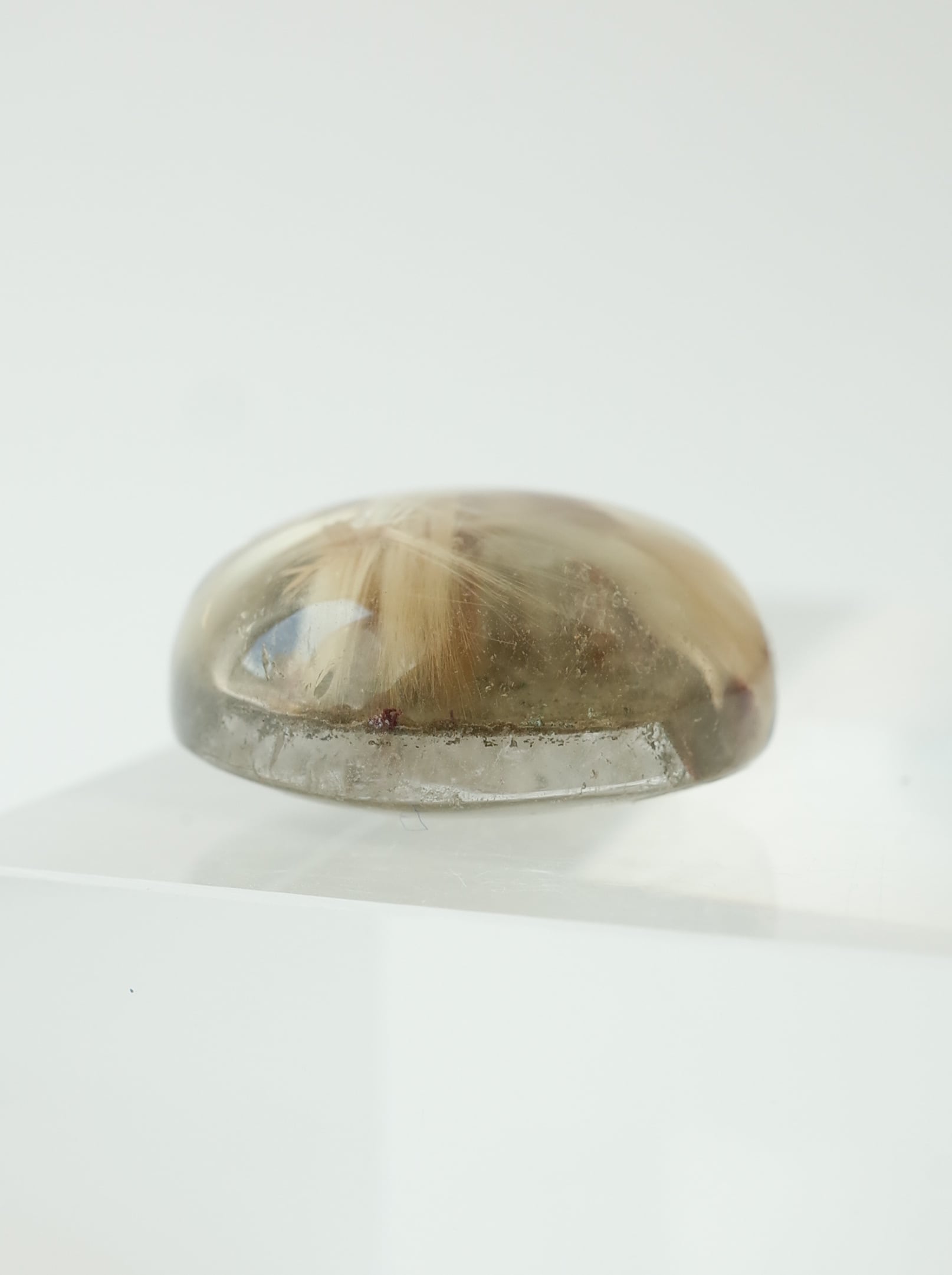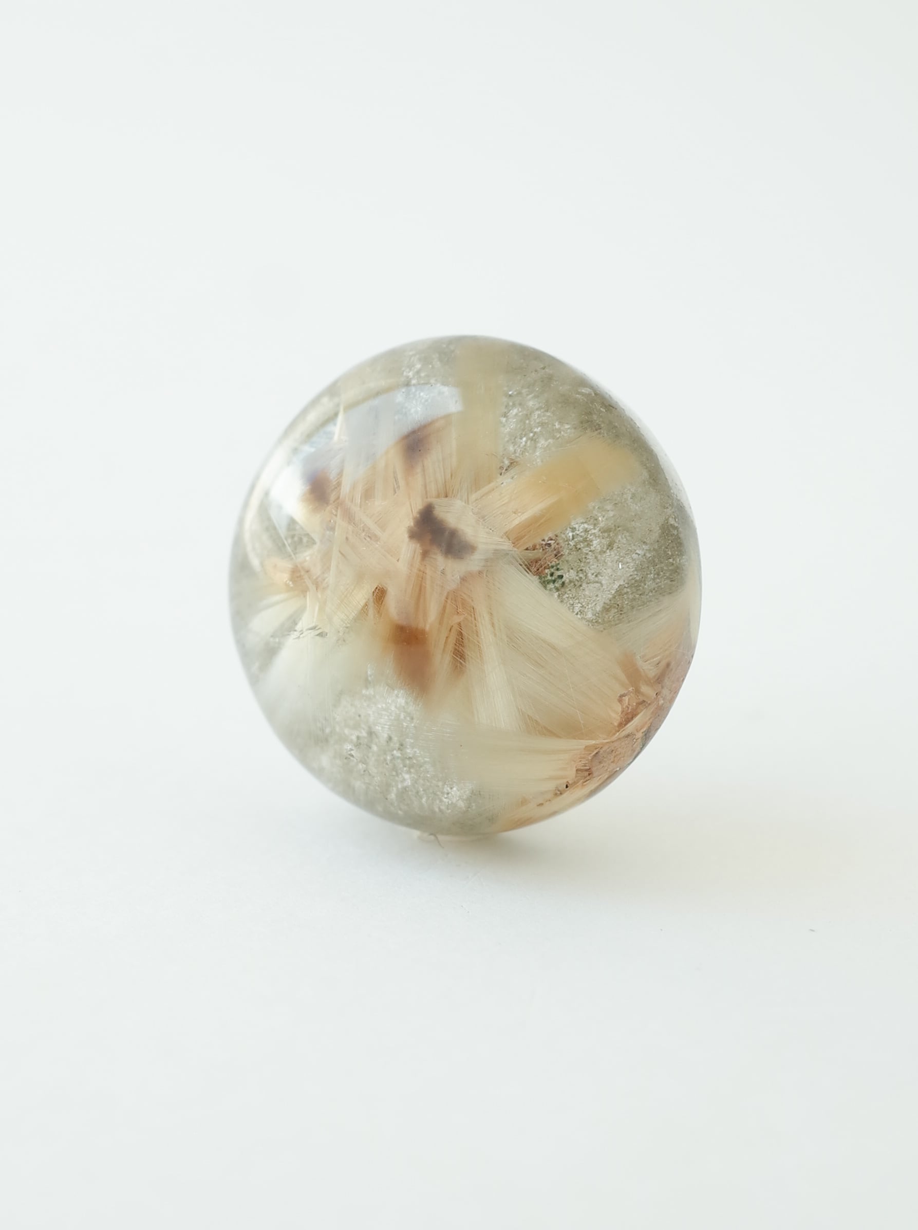「ガーデンルチルクォーツ」とは、クローライトを主成分とするようなガーデンクォーツにルチルの結晶が入り込んだもの。景色を切り取ったようなガーデンに、ルチルの輝きが重なり合い、まるで「自然の庭園」に光が差し込むような神秘的な美しさを持つ一石です。