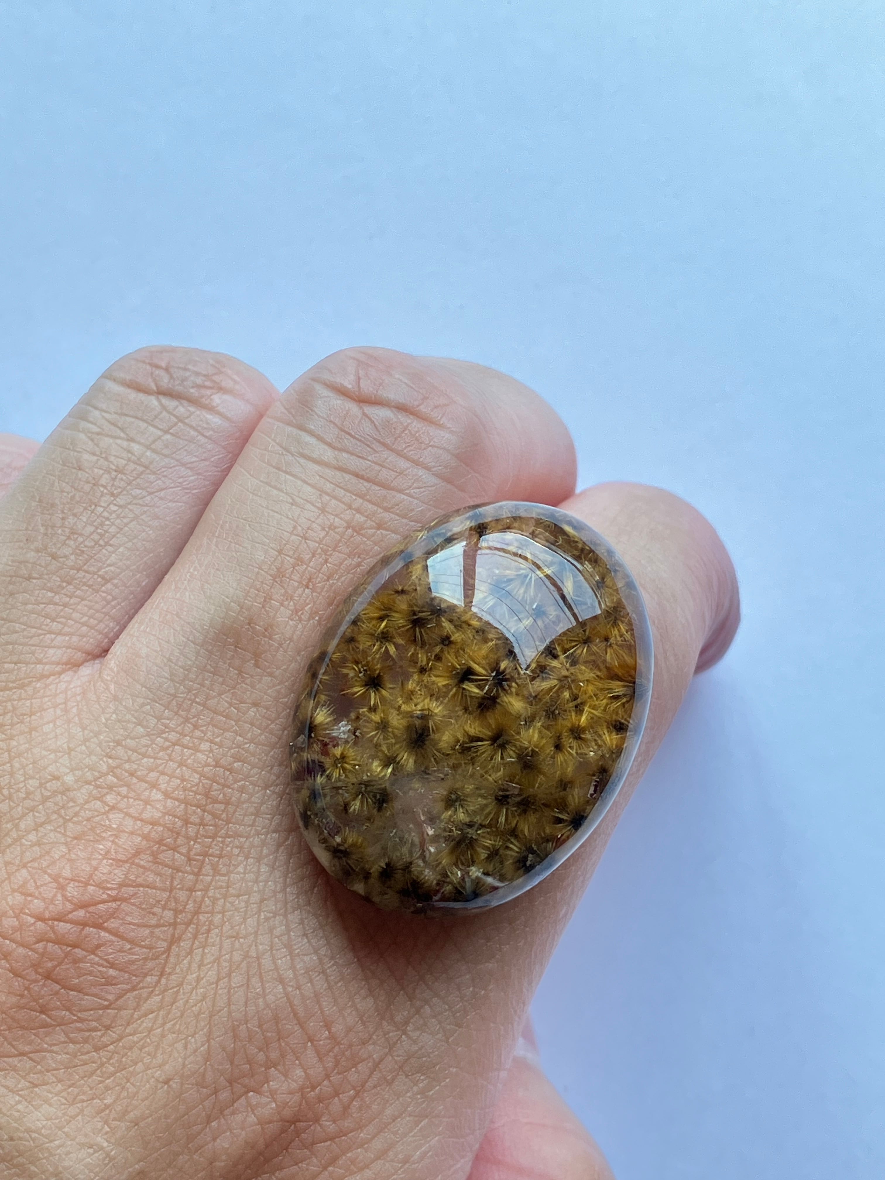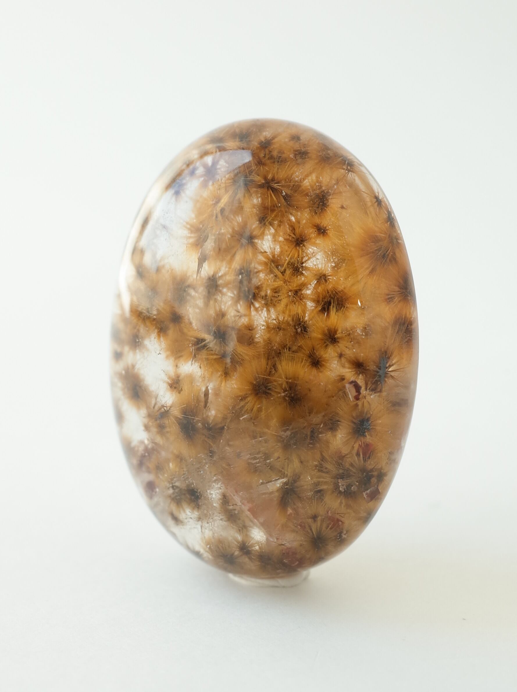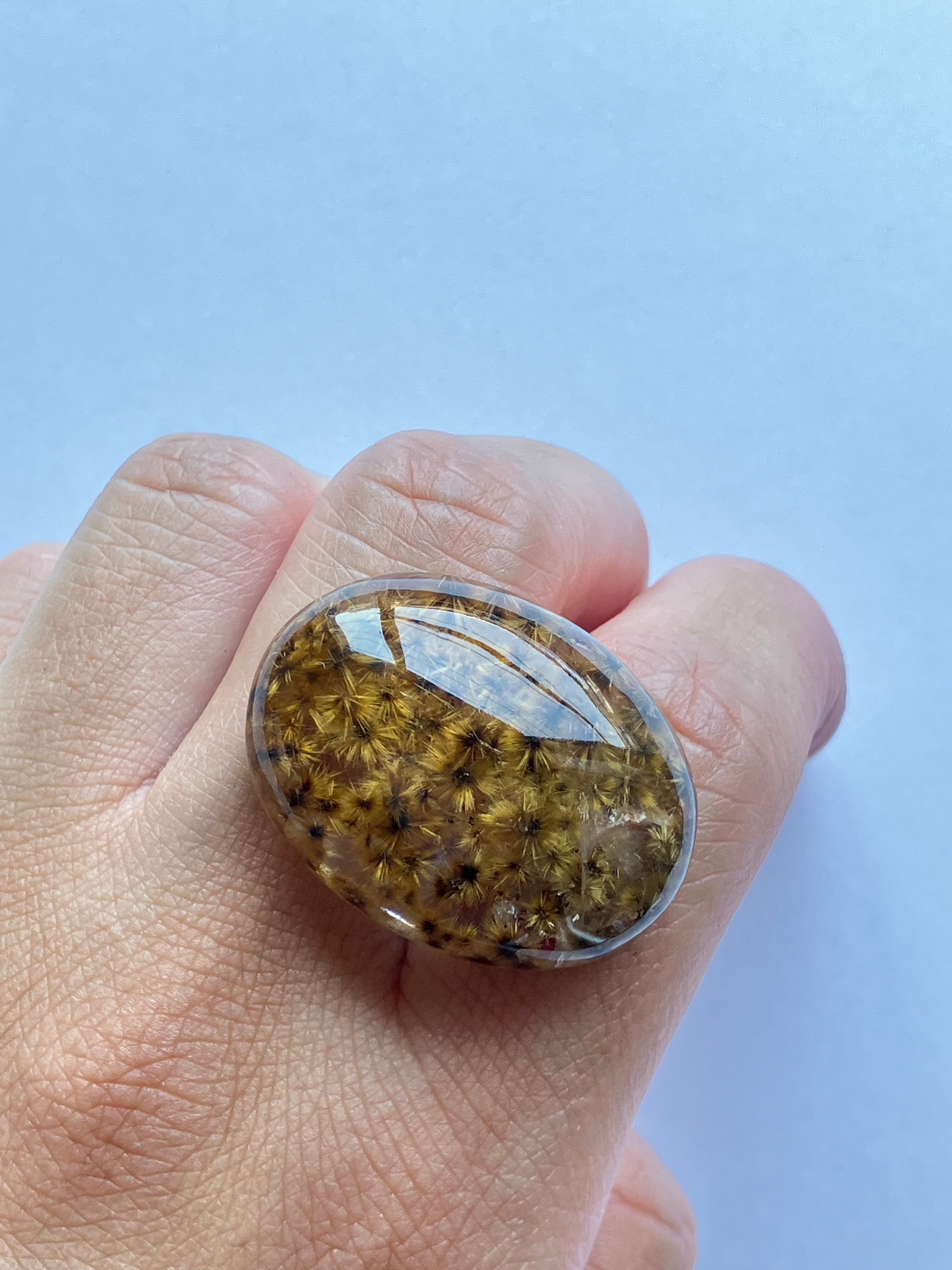 「フラワールチルクォーツ」とは、ルチルクォーツの中でも、小さな放射状のルチルの結晶が沢山集まり、まるで花が咲いたように見える可愛らしいタイプです。ひまわり畑のようだったり、秋の紅葉のようだったり、景色を切り取ったような美しさが魅力です。