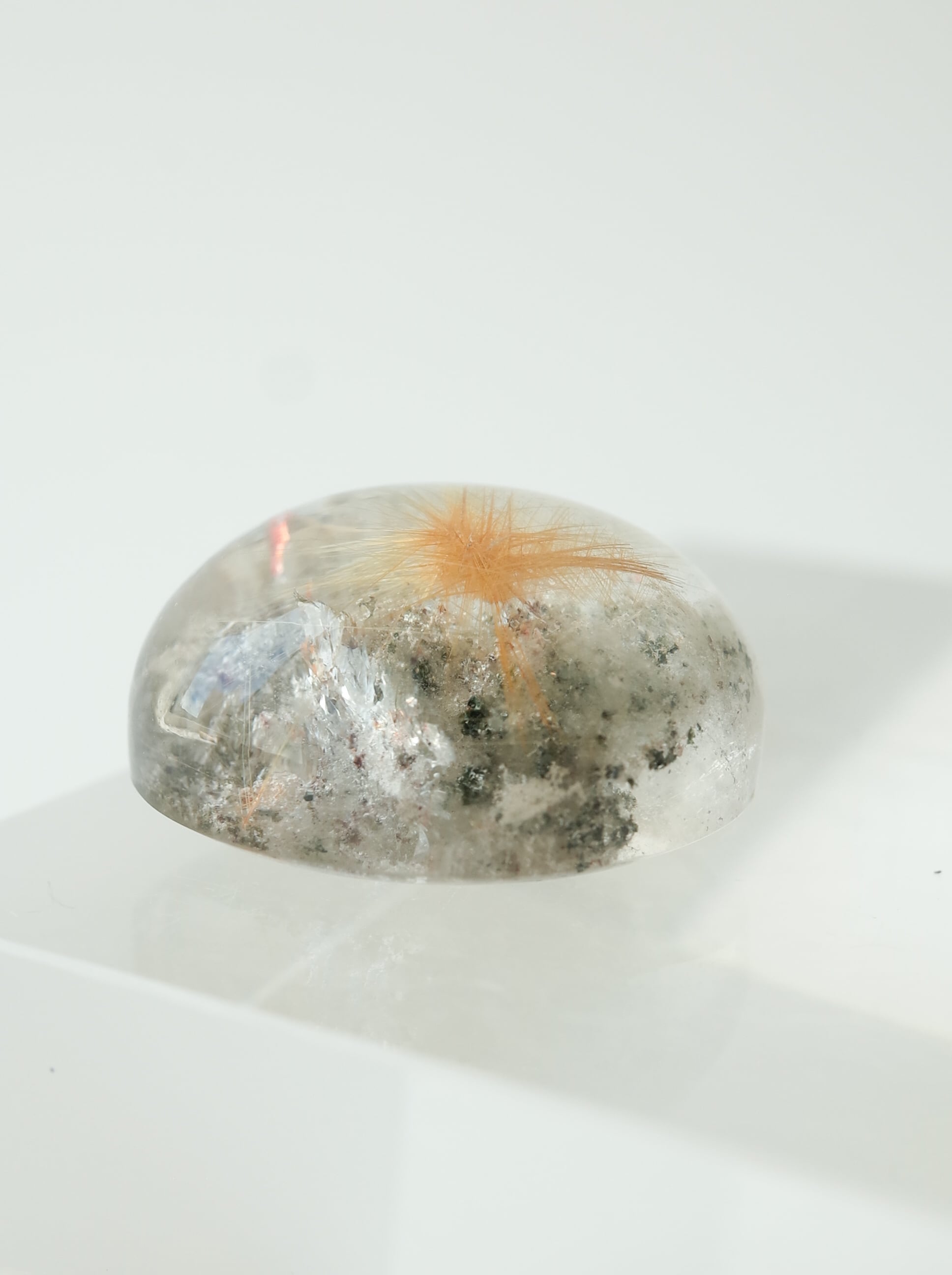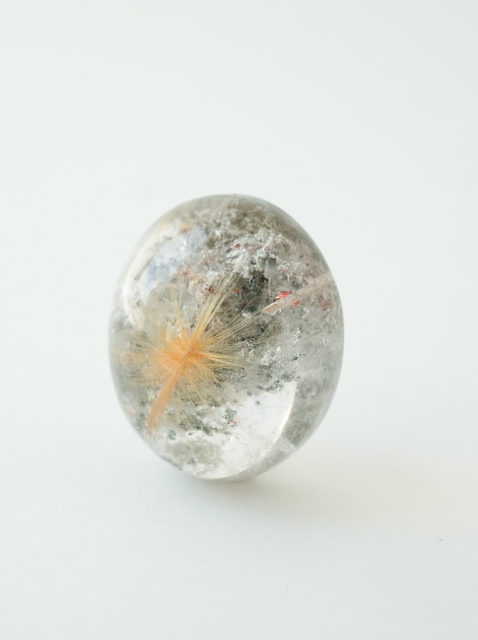 「ガーデンルチルクォーツ」とは、クローライトを主成分とするようなガーデンクォーツにルチルの結晶が入り込んだもの。景色を切り取ったようなガーデンに、ルチルの輝きが重なり合い、まるで「自然の庭園」に光が差し込むような神秘的な美しさを持つ一石です。