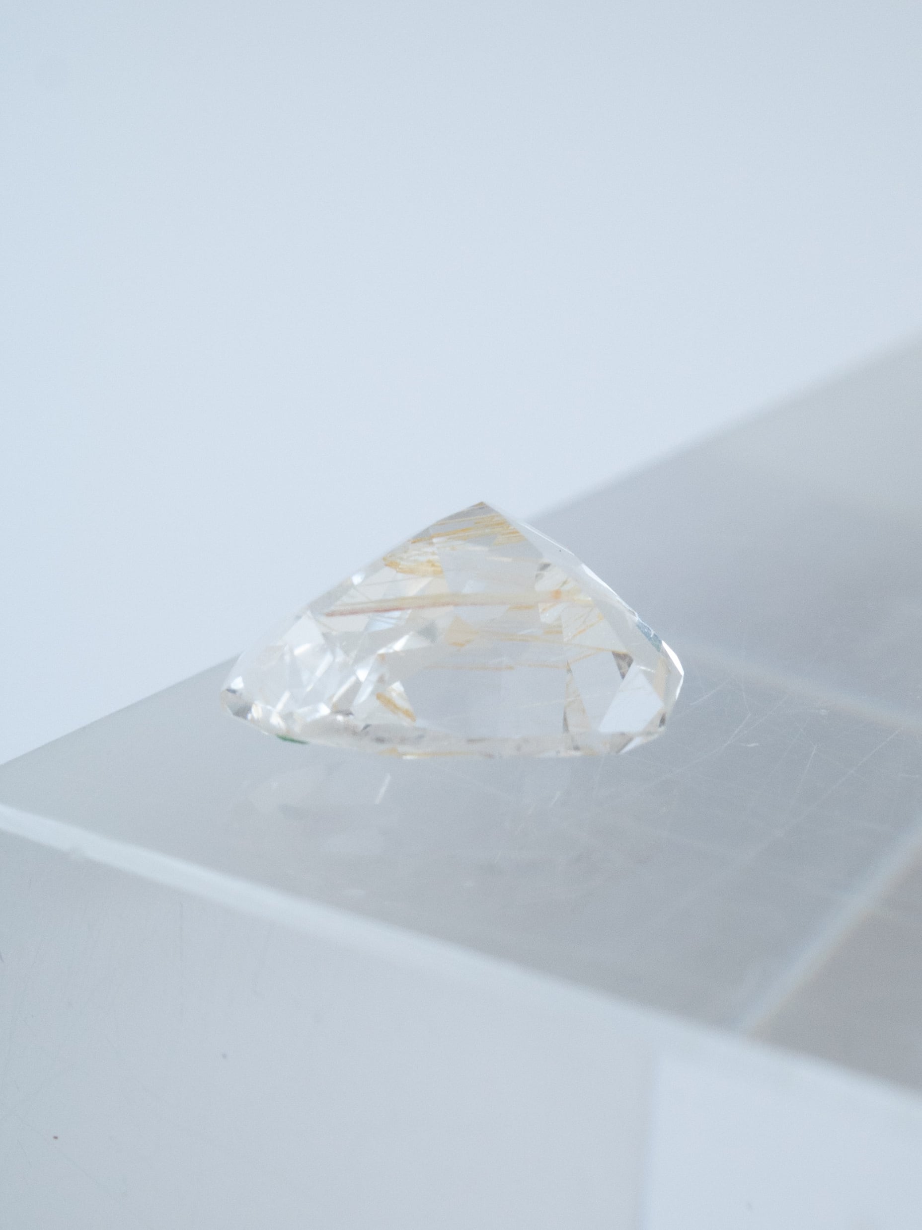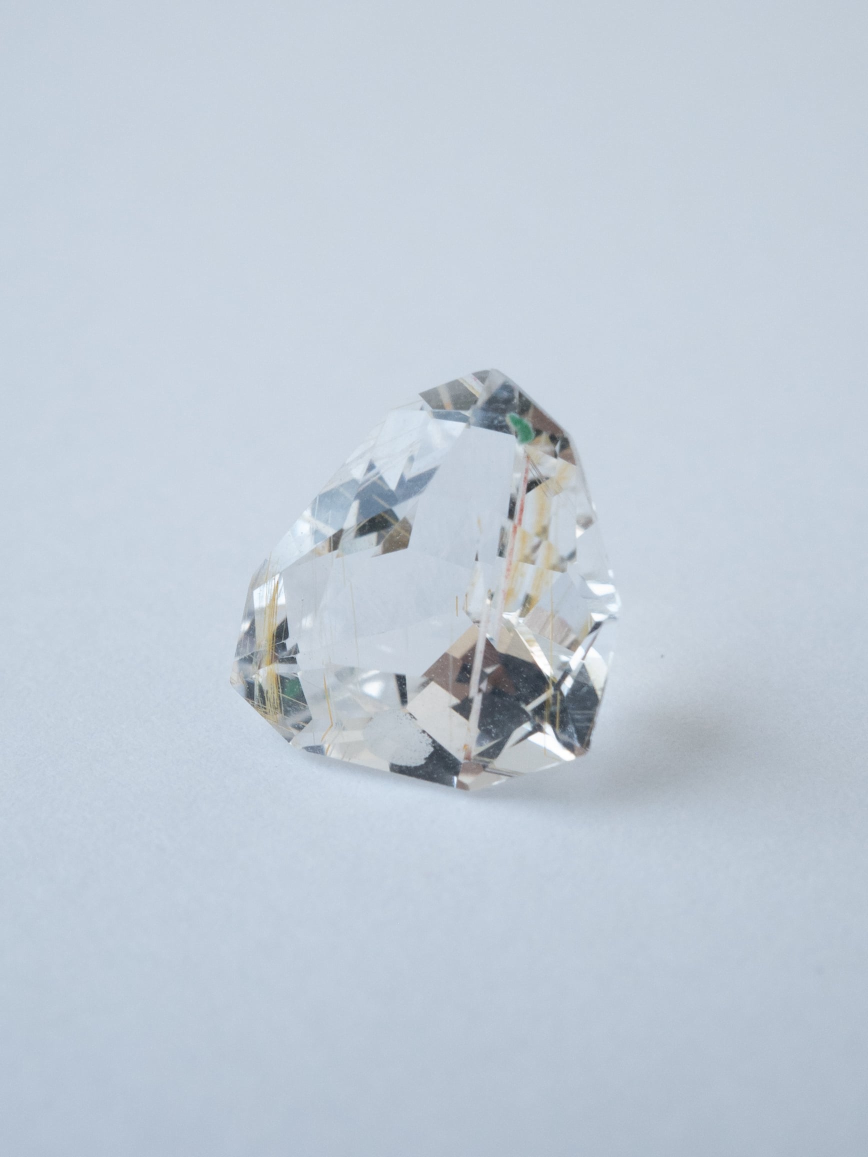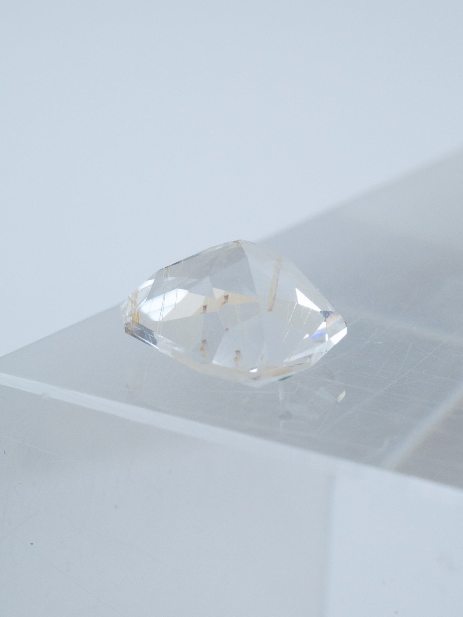 透明度の高いトパーズの中に、黄褐色のライモナイトが内包されたライモナイトイントパーズ。雲一つない空に光が差したような魅力的なルースです。またトパーズは水晶よりも屈折率が高く比重も大きい為、光沢が強く、より艶やかです。