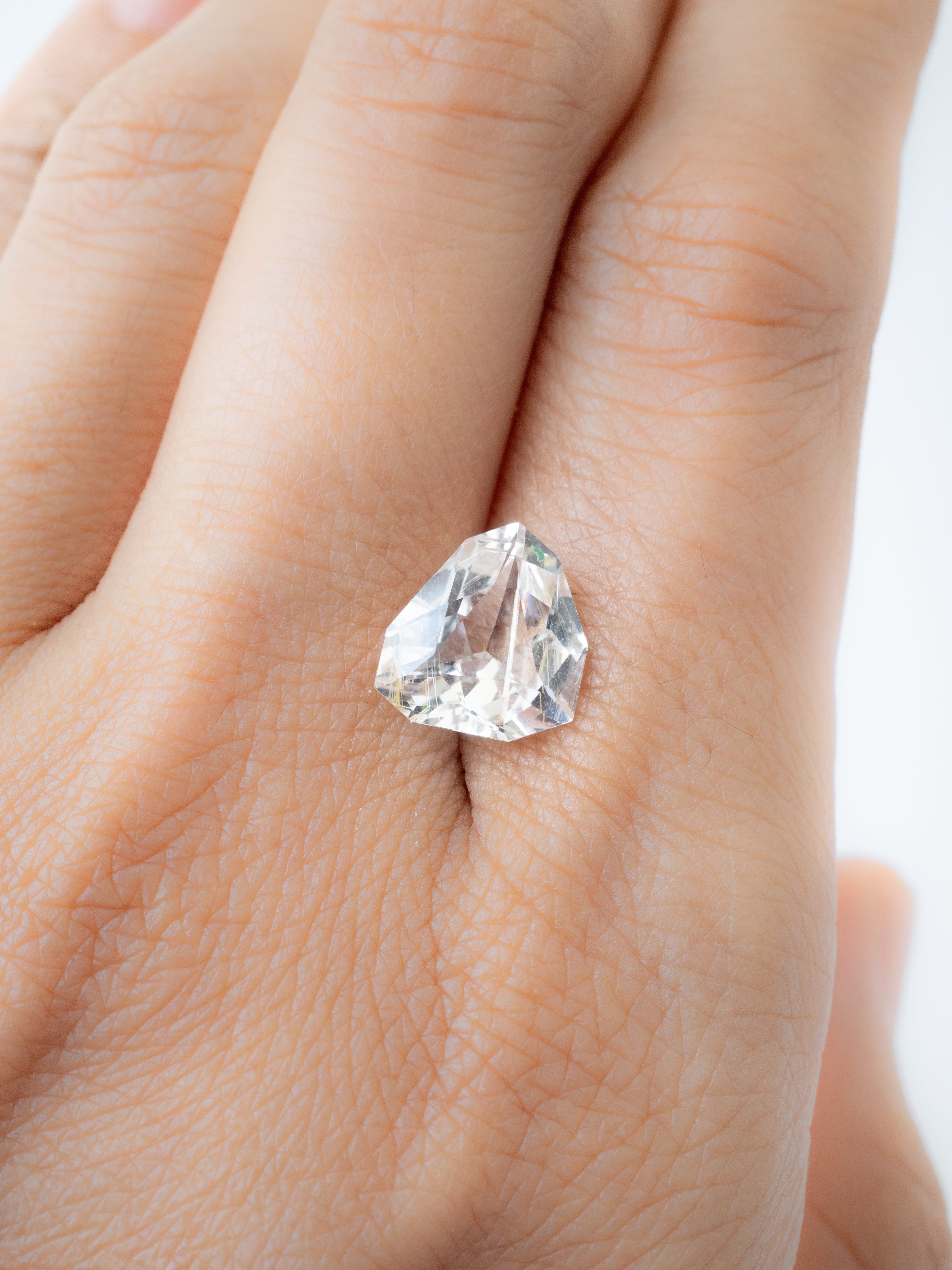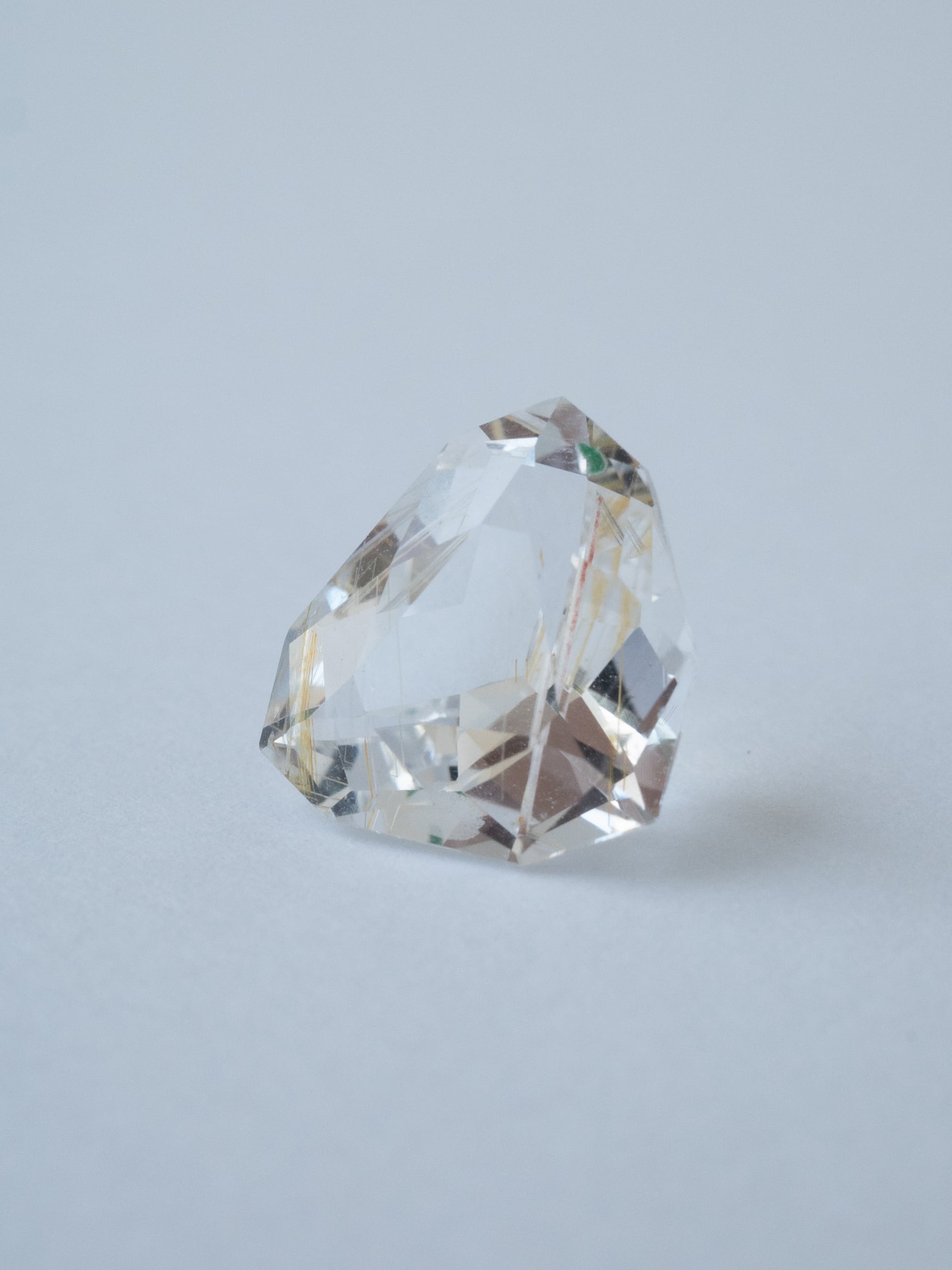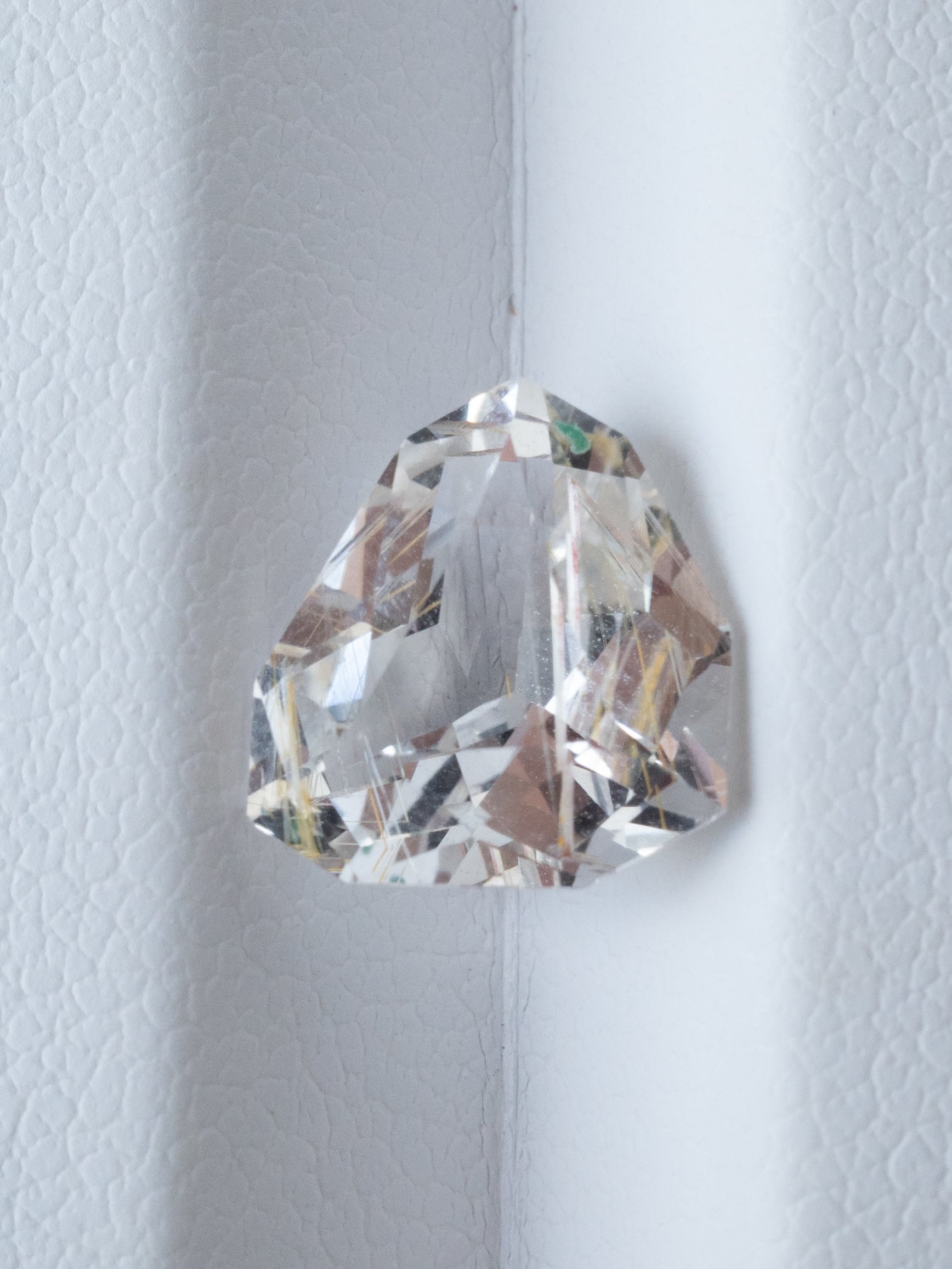透明度の高いトパーズの中に、黄褐色のライモナイトが内包されたライモナイトイントパーズ。雲一つない空に光が差したような魅力的なルースです。またトパーズは水晶よりも屈折率が高く比重も大きい為、光沢が強く、より艶やかです。
