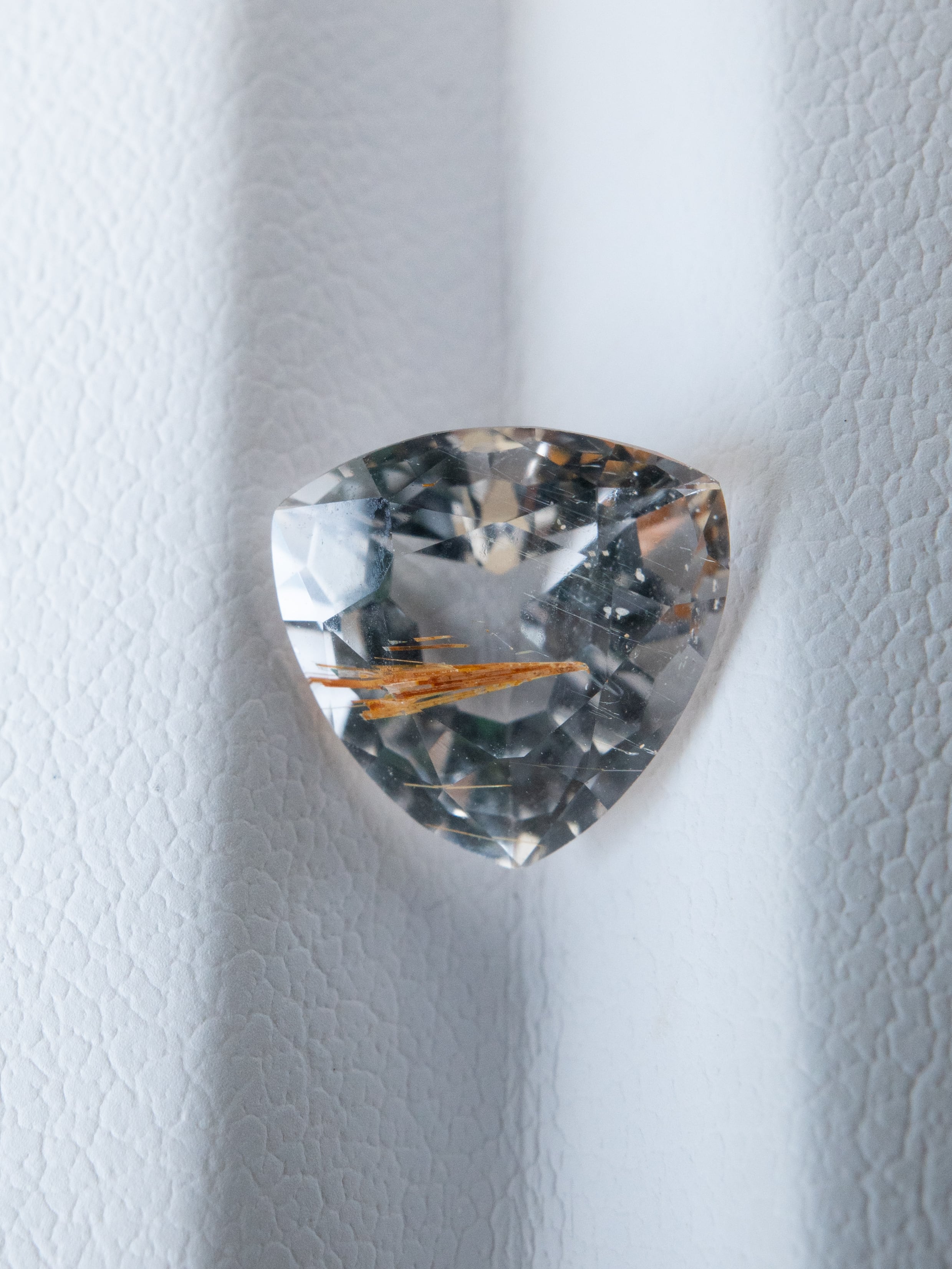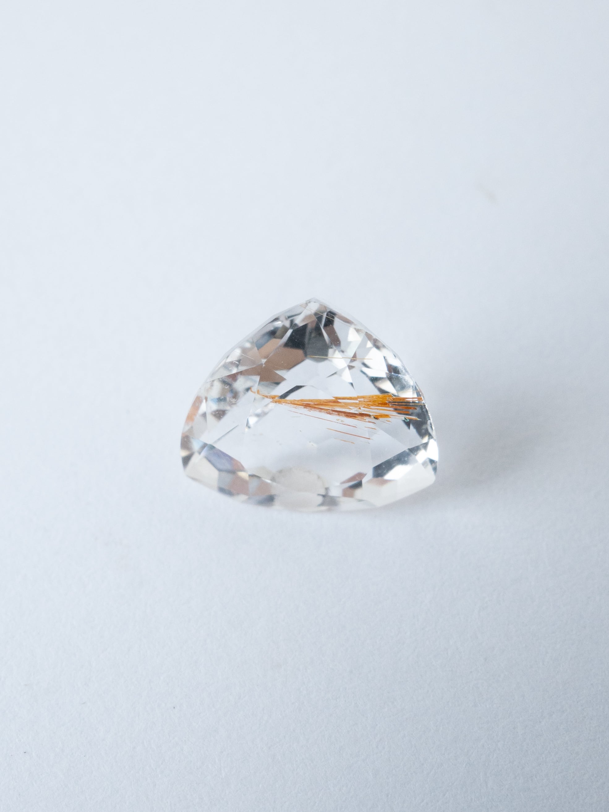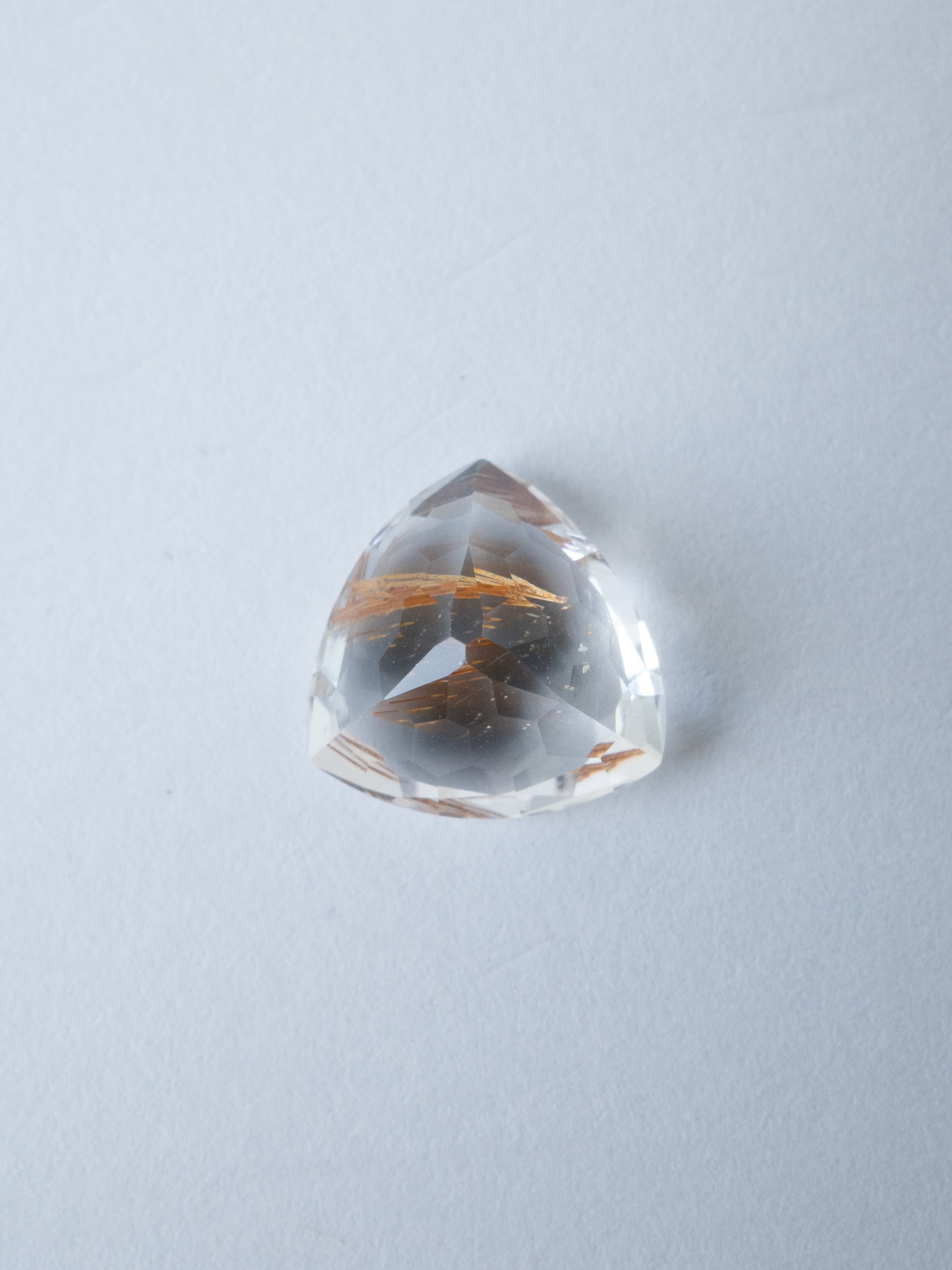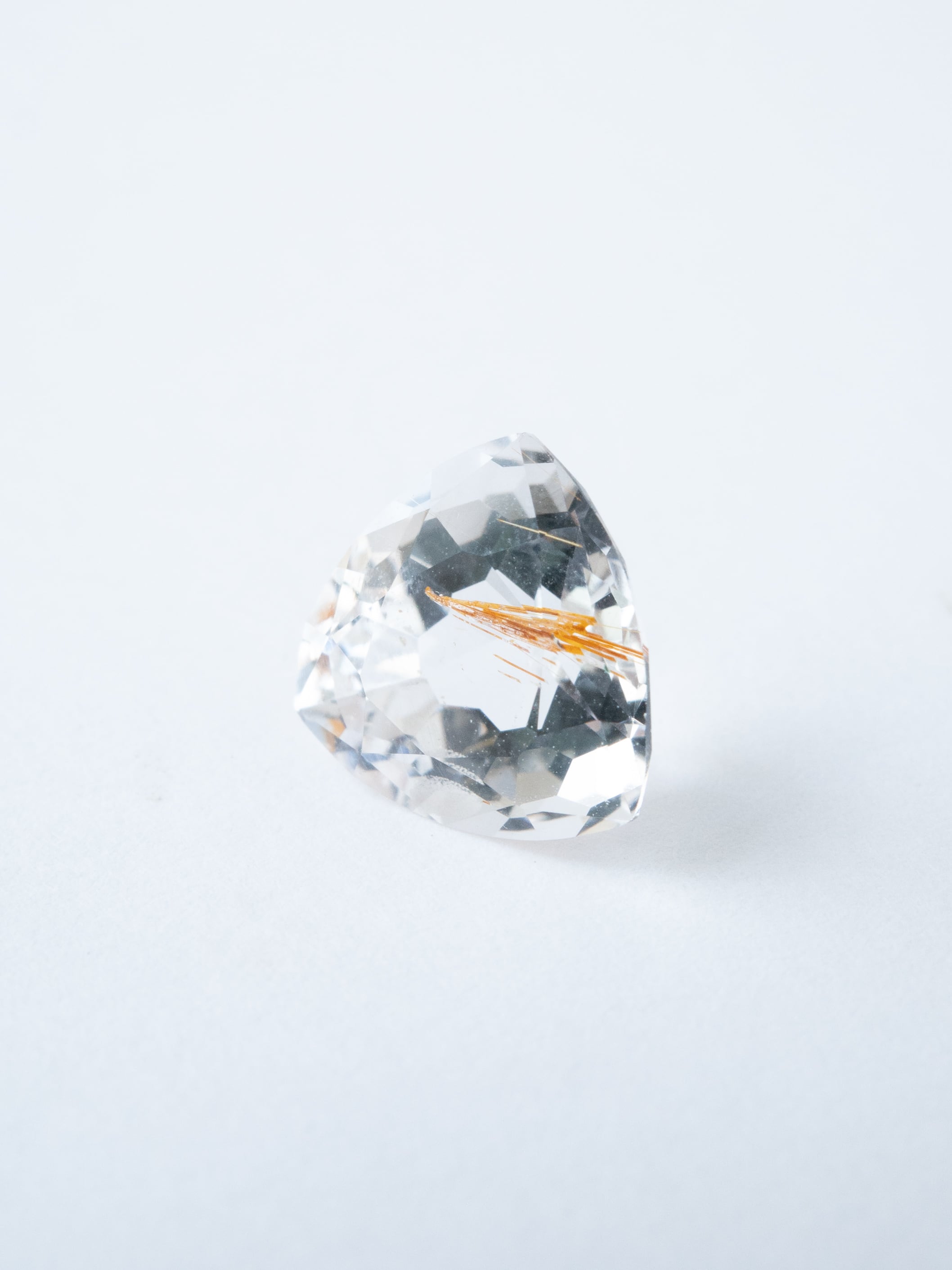 透明度の高いトパーズの中に、黄褐色のライモナイトが内包されたライモナイトイントパーズ。雲一つない空に光が差したような魅力的なルースです。またトパーズは水晶よりも屈折率が高く比重も大きい為、光沢が強く、より艶やかです。