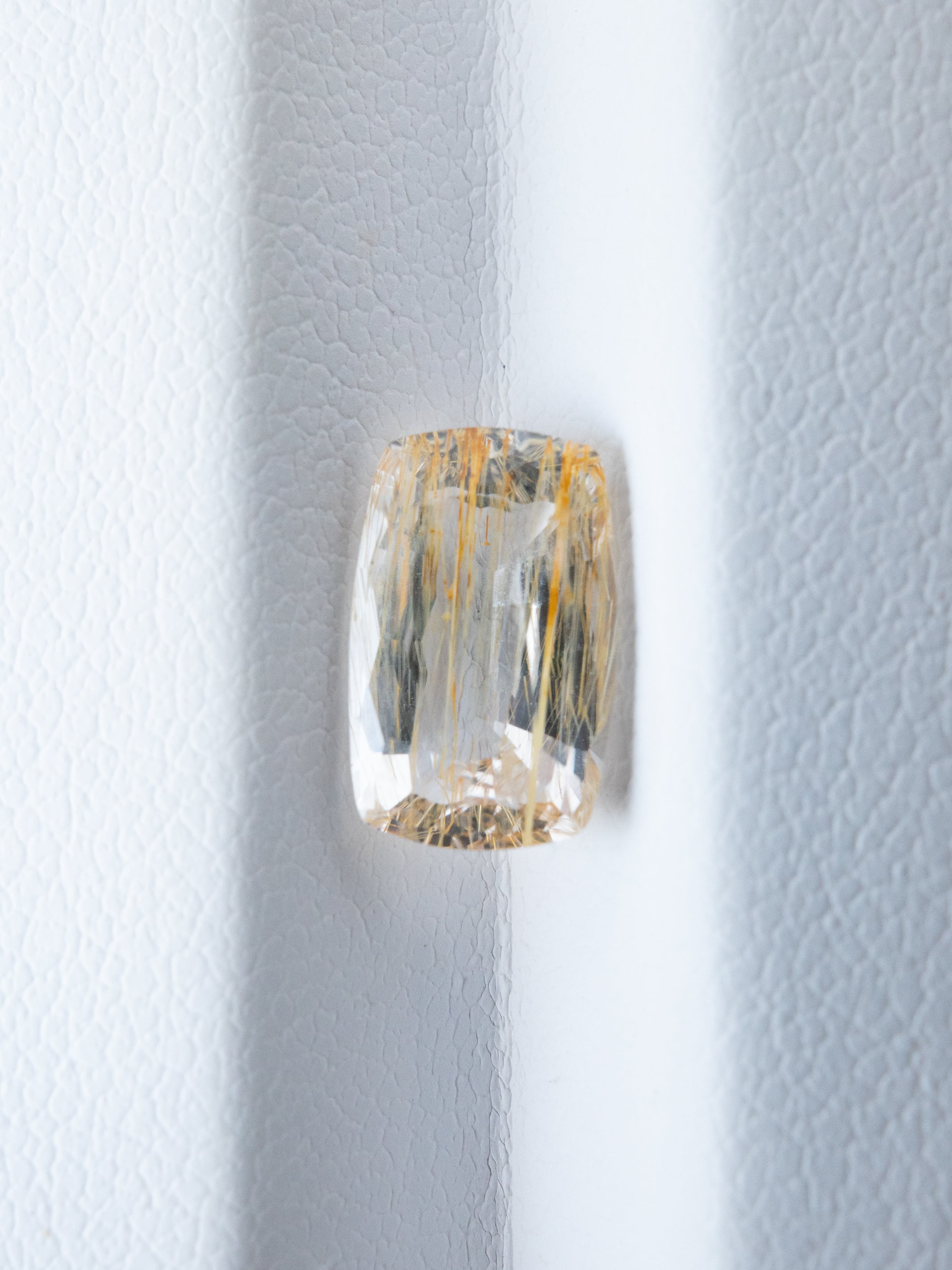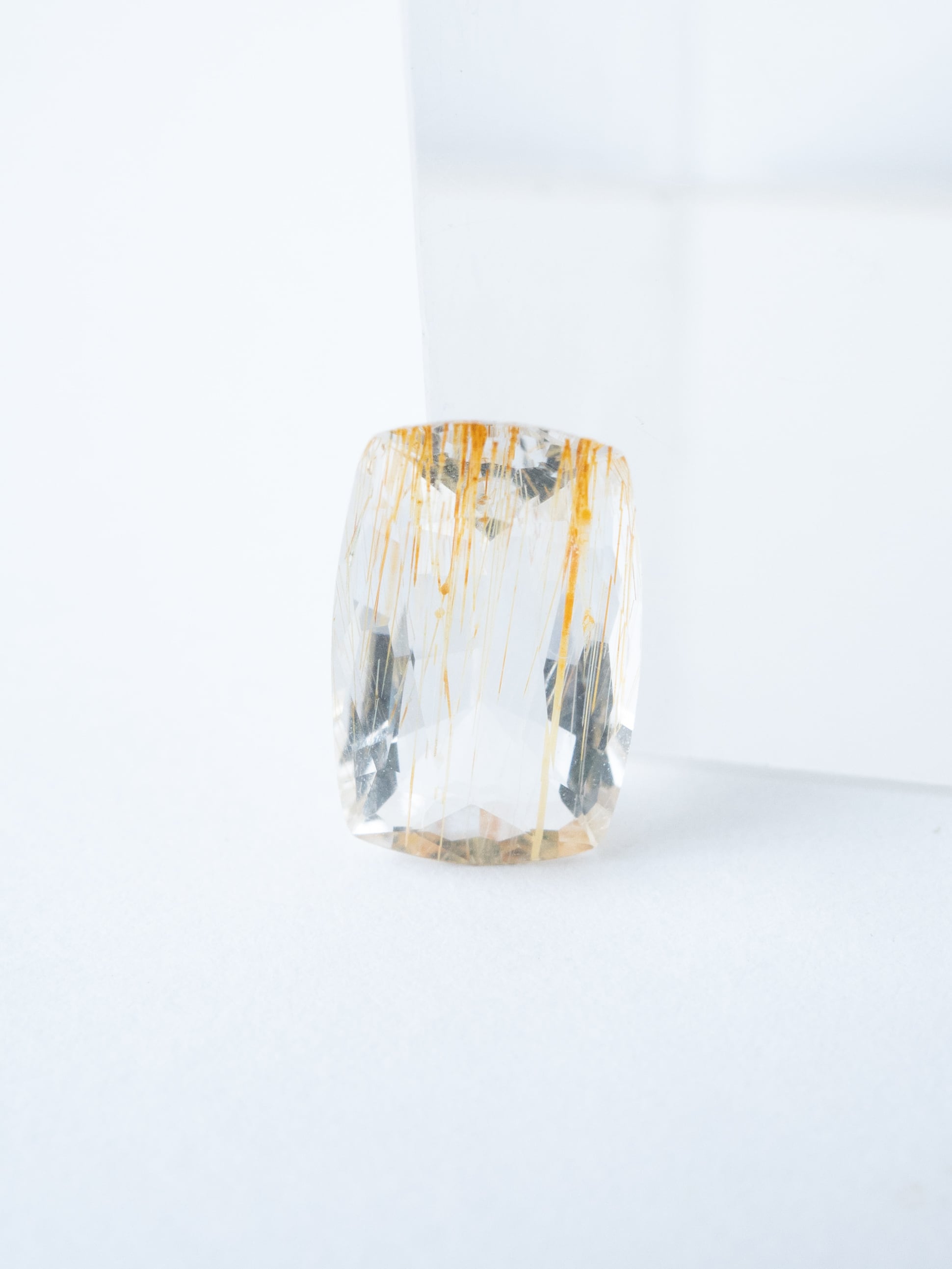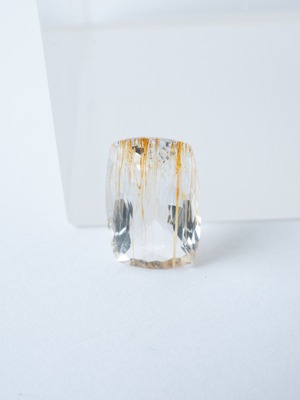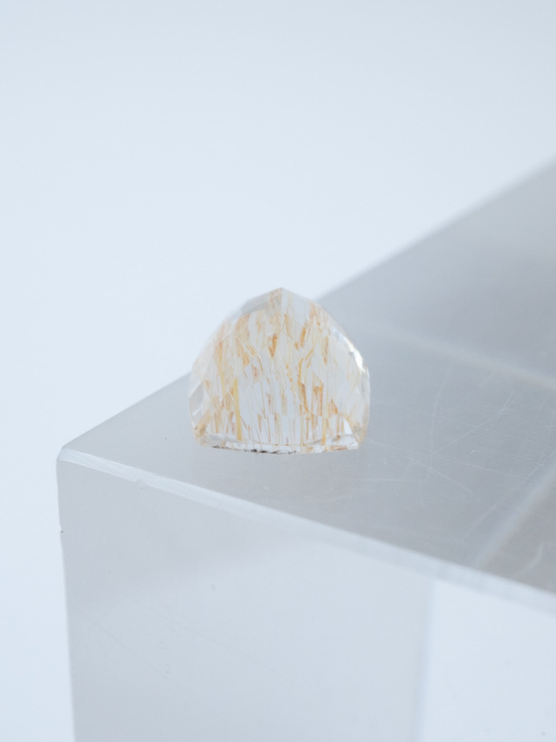 透明度の高いトパーズの中に、黄褐色のライモナイトが内包されたライモナイトイントパーズ。雲一つない空に光が差したような魅力的なルースです。またトパーズは水晶よりも屈折率が高く比重も大きい為、光沢が強く、より艶やかです。