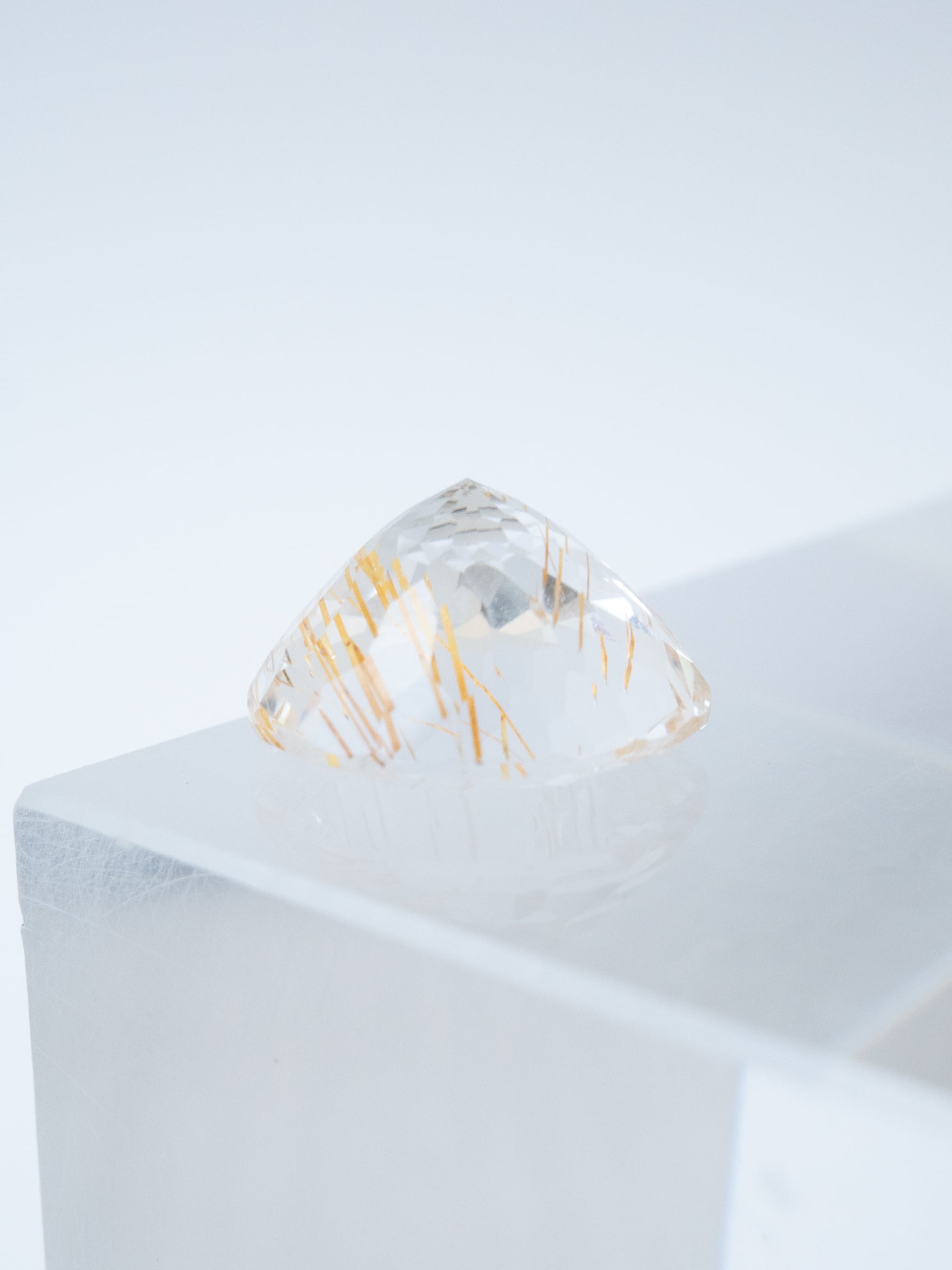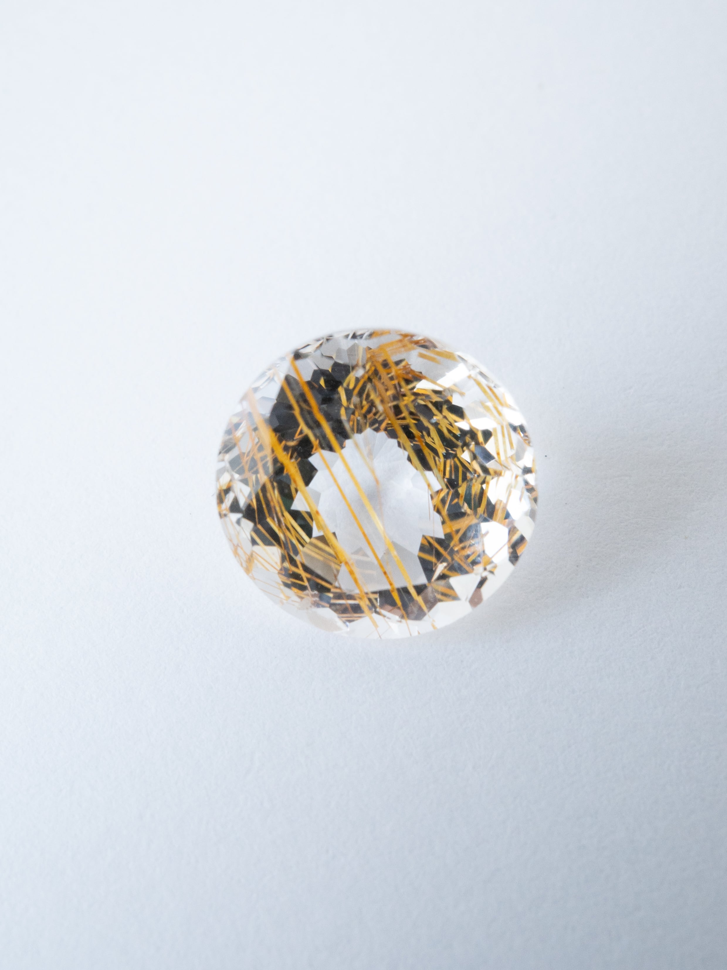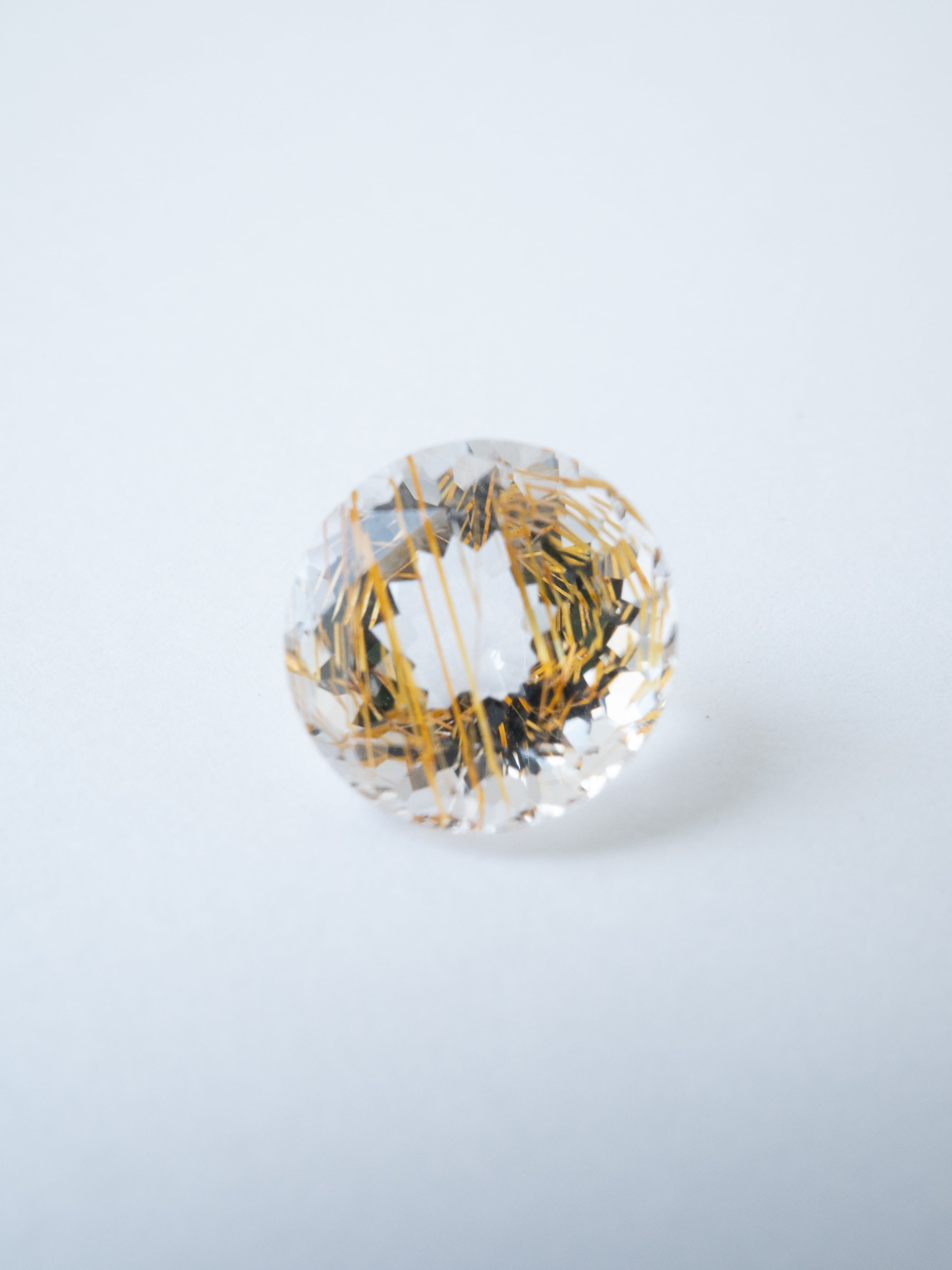 透明度の高いトパーズの中に、黄褐色のライモナイトが内包されたライモナイトイントパーズ。雲一つない空に光が差したような魅力的なルースです。またトパーズは水晶よりも屈折率が高く比重も大きい為、光沢が強く、より艶やかです。