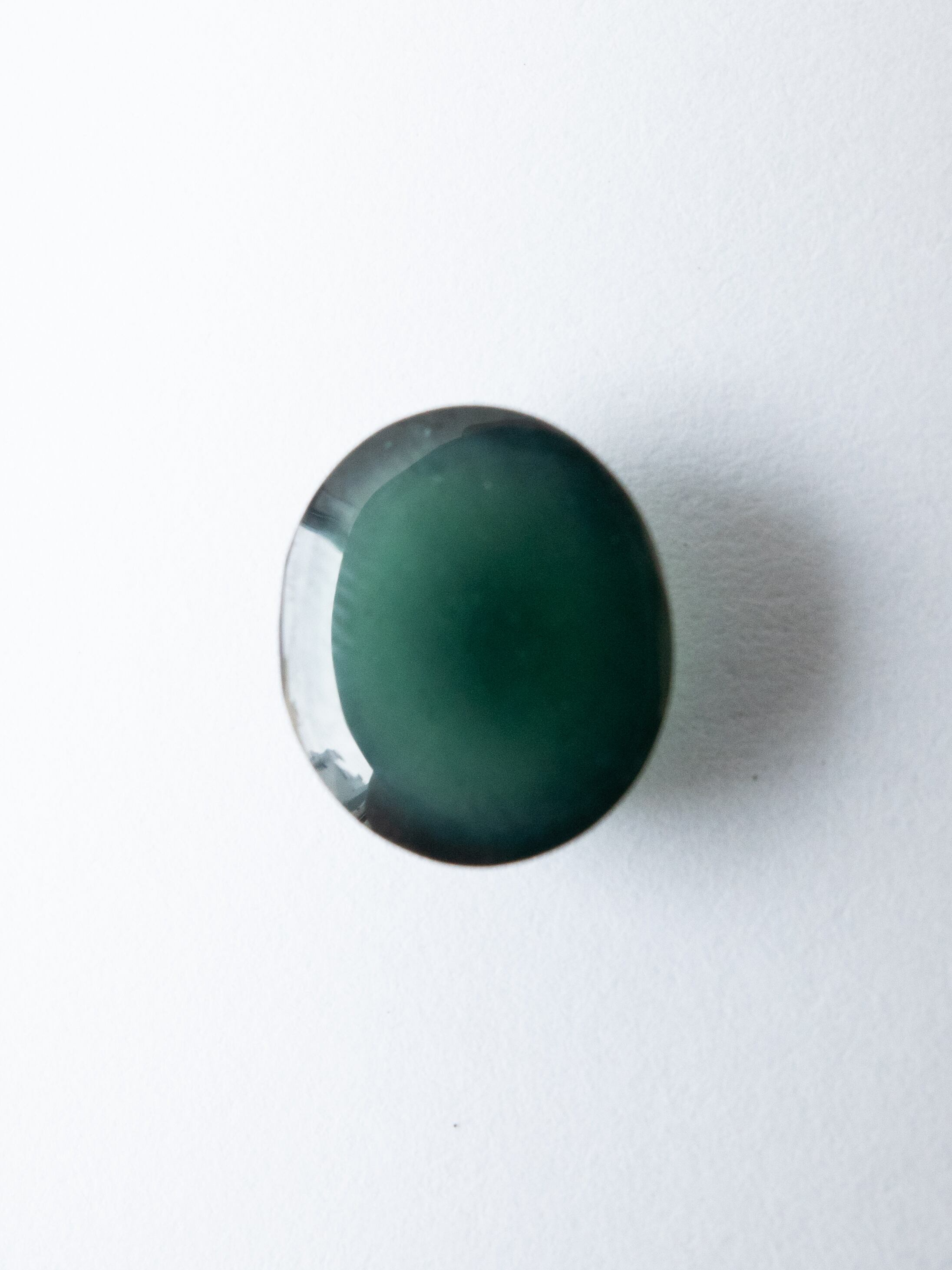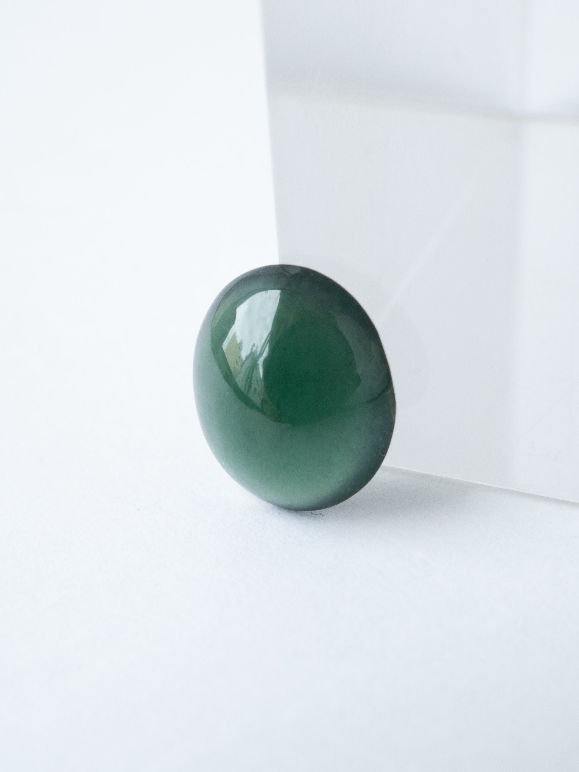 こちらの翡翠は表面の艶を向上させるための通常ワックス加工が施されています。この処理は、ほとんどの翡翠ルースの仕上げとして行われている工程です。内部まで樹脂を浸透させた含浸処理とは異なりますので、安心してご購入ください。