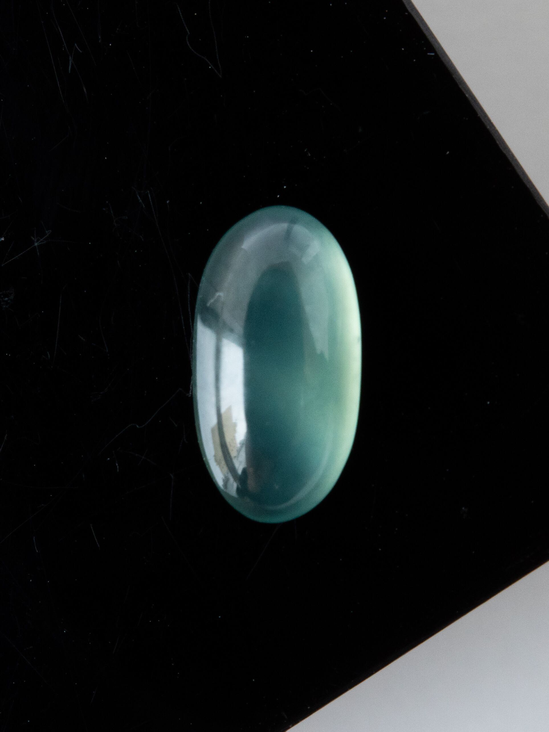 こちらの翡翠は表面の艶を向上させるための通常ワックス加工が施されています。この処理は、ほとんどの翡翠ルースの仕上げとして行われている工程です。内部まで樹脂を浸透させた含浸処理とは異なりますので、安心してご購入ください。