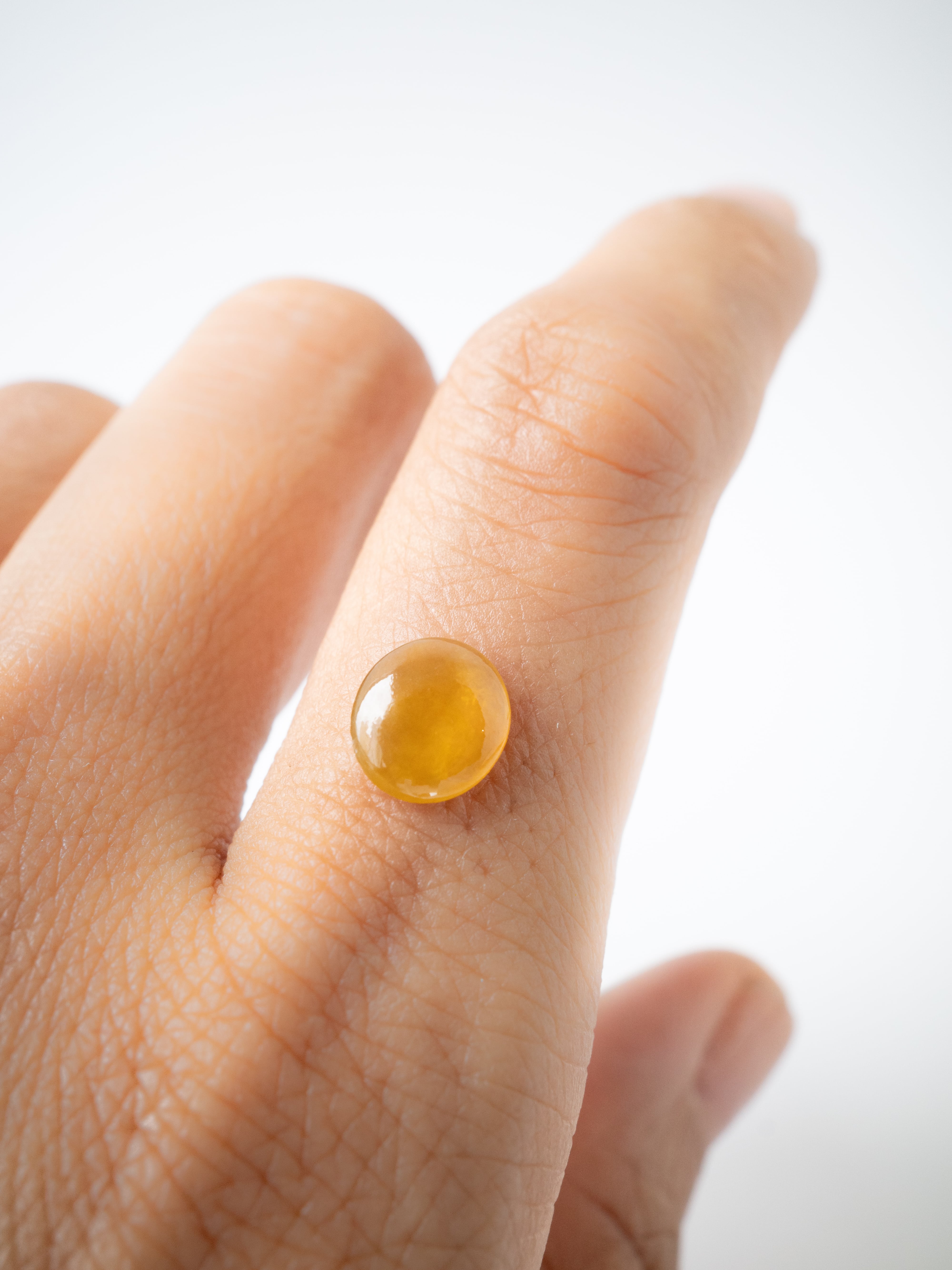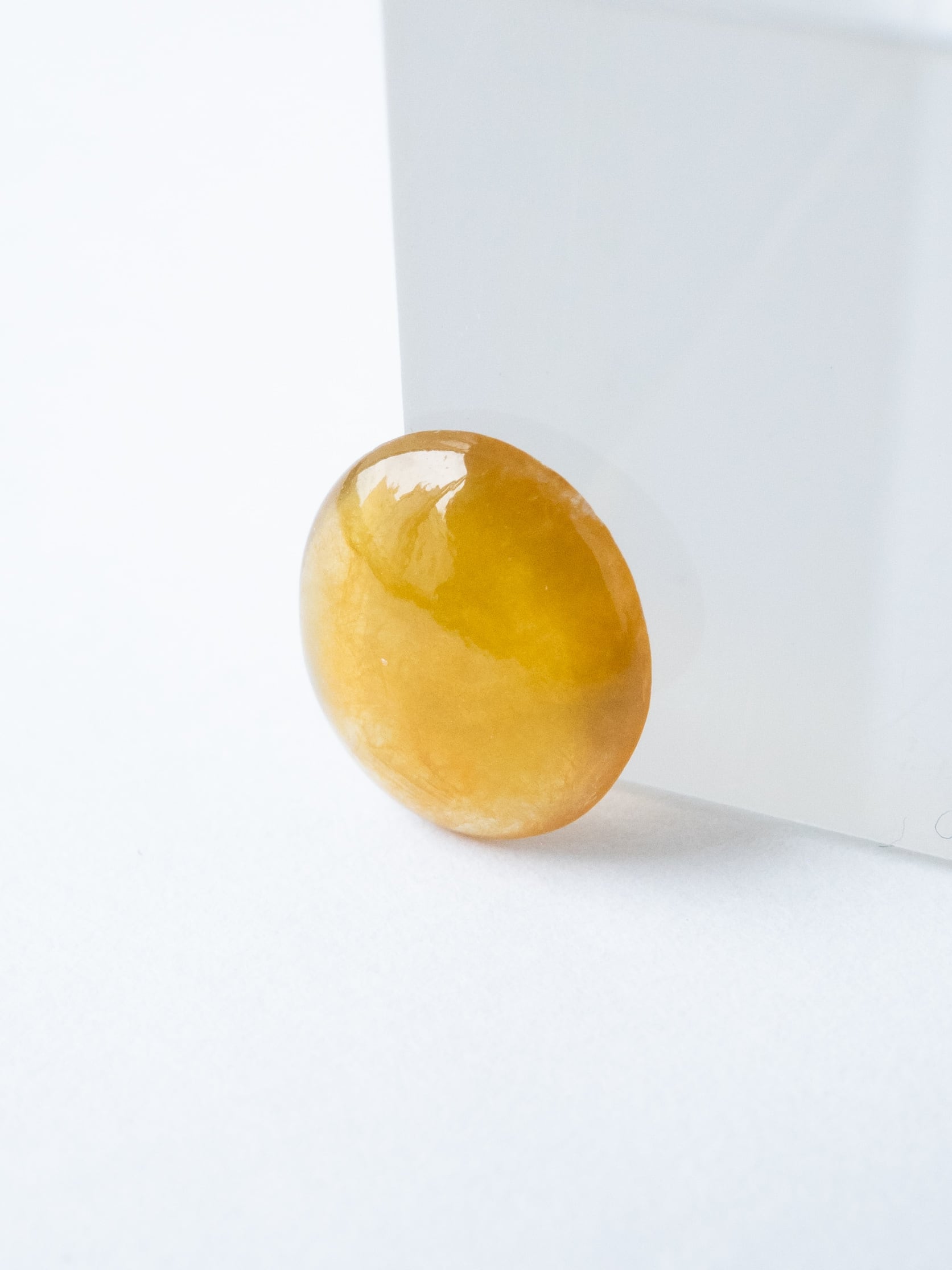 こちらの翡翠は表面の艶を向上させるための通常ワックス加工が施されています。この処理は、ほとんどの翡翠ルースの仕上げとして行われている工程です。内部まで樹脂を浸透させた含浸処理とは異なりますので、安心してご購入ください。