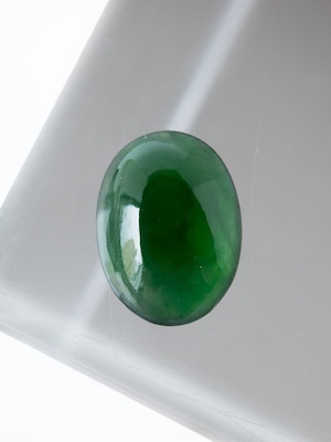 こちらの翡翠は表面の艶を向上させるための通常ワックス加工が施されています。この処理は、ほとんどの翡翠ルースの仕上げとして行われている工程です。内部まで樹脂を浸透させた含浸処理とは異なりますので、安心してご購入ください。