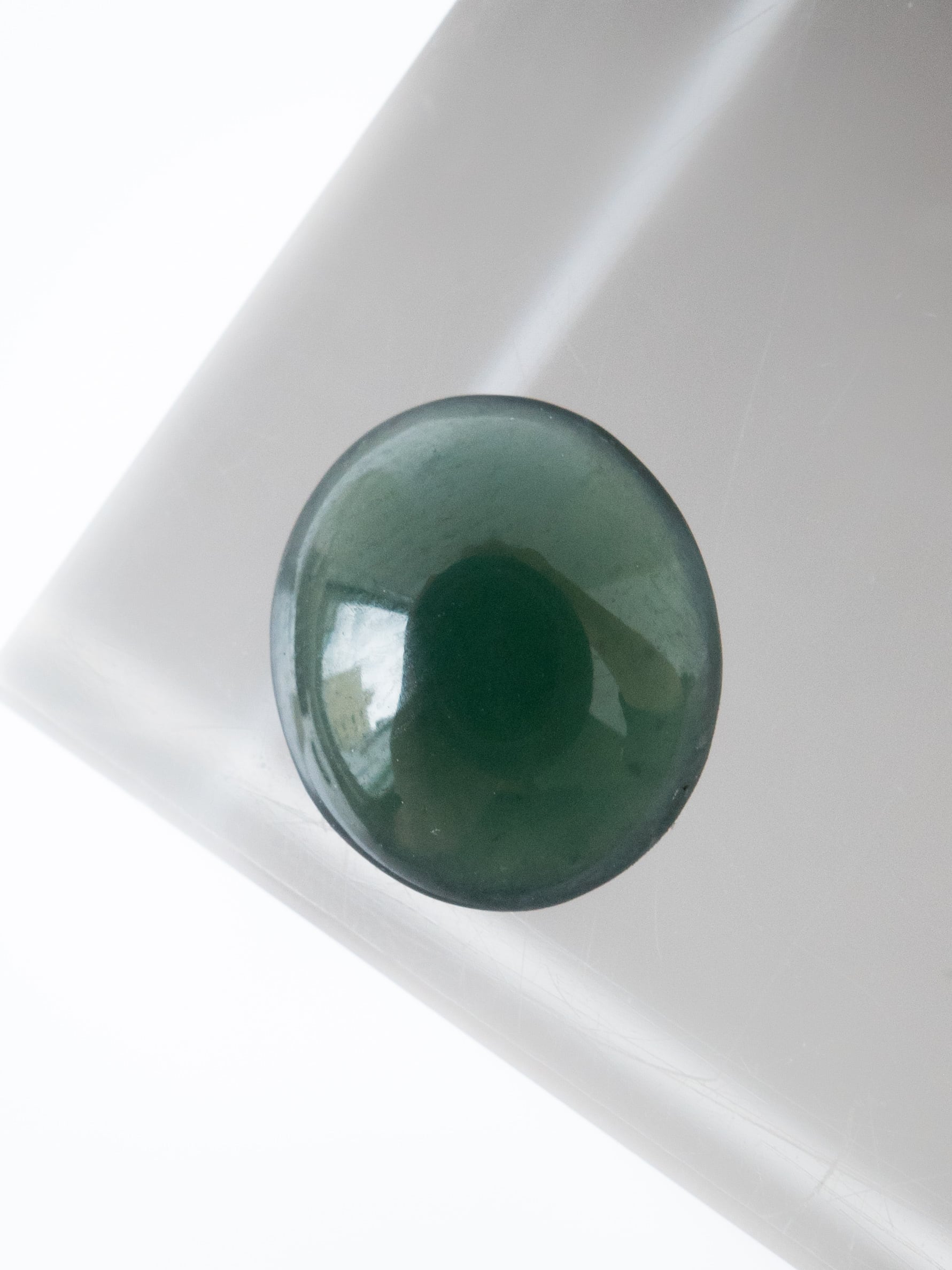 こちらの翡翠は表面の艶を向上させるための通常ワックス加工が施されています。この処理は、ほとんどの翡翠ルースの仕上げとして行われている工程です。内部まで樹脂を浸透させた含浸処理とは異なりますので、安心してご購入ください。