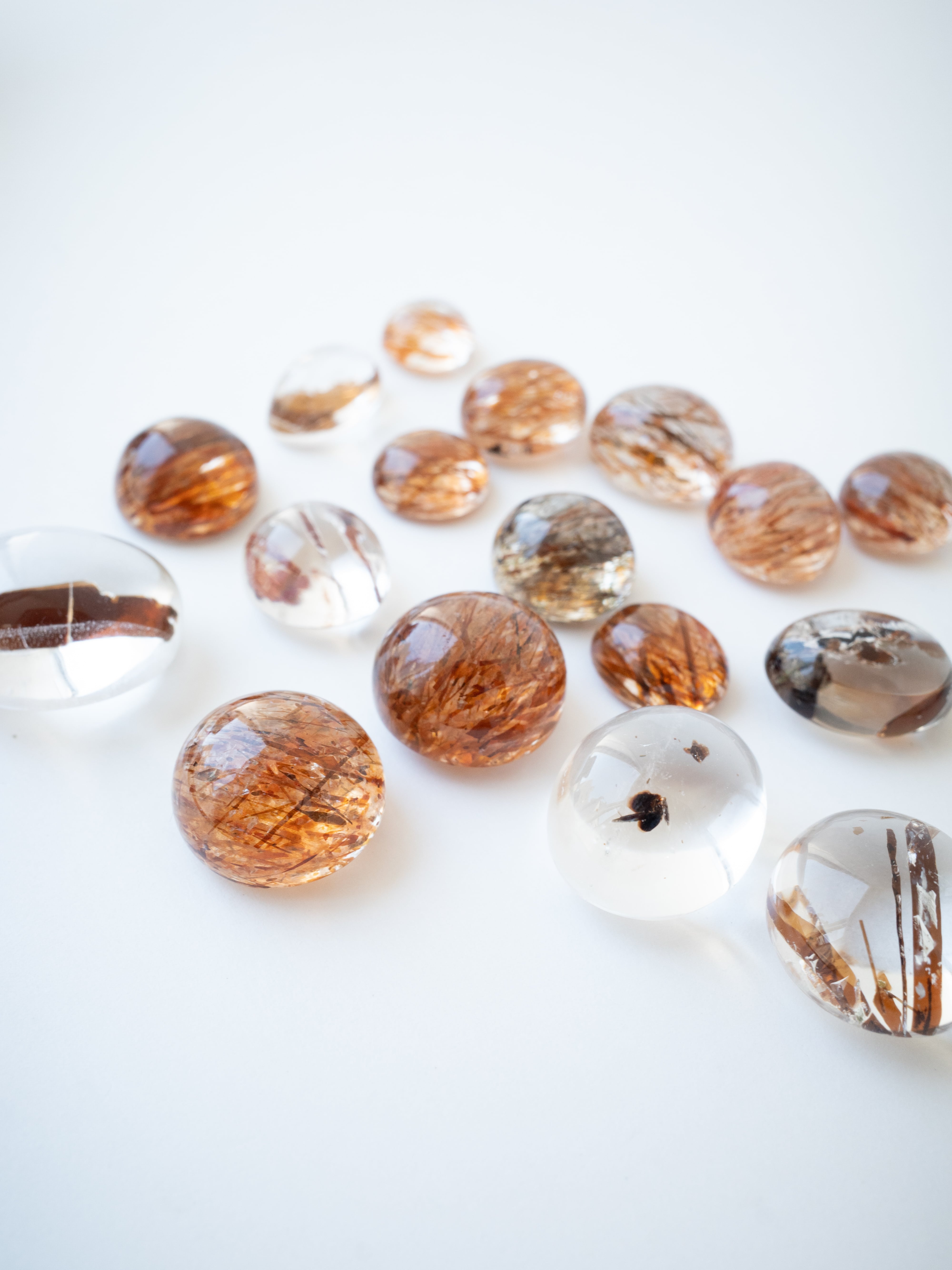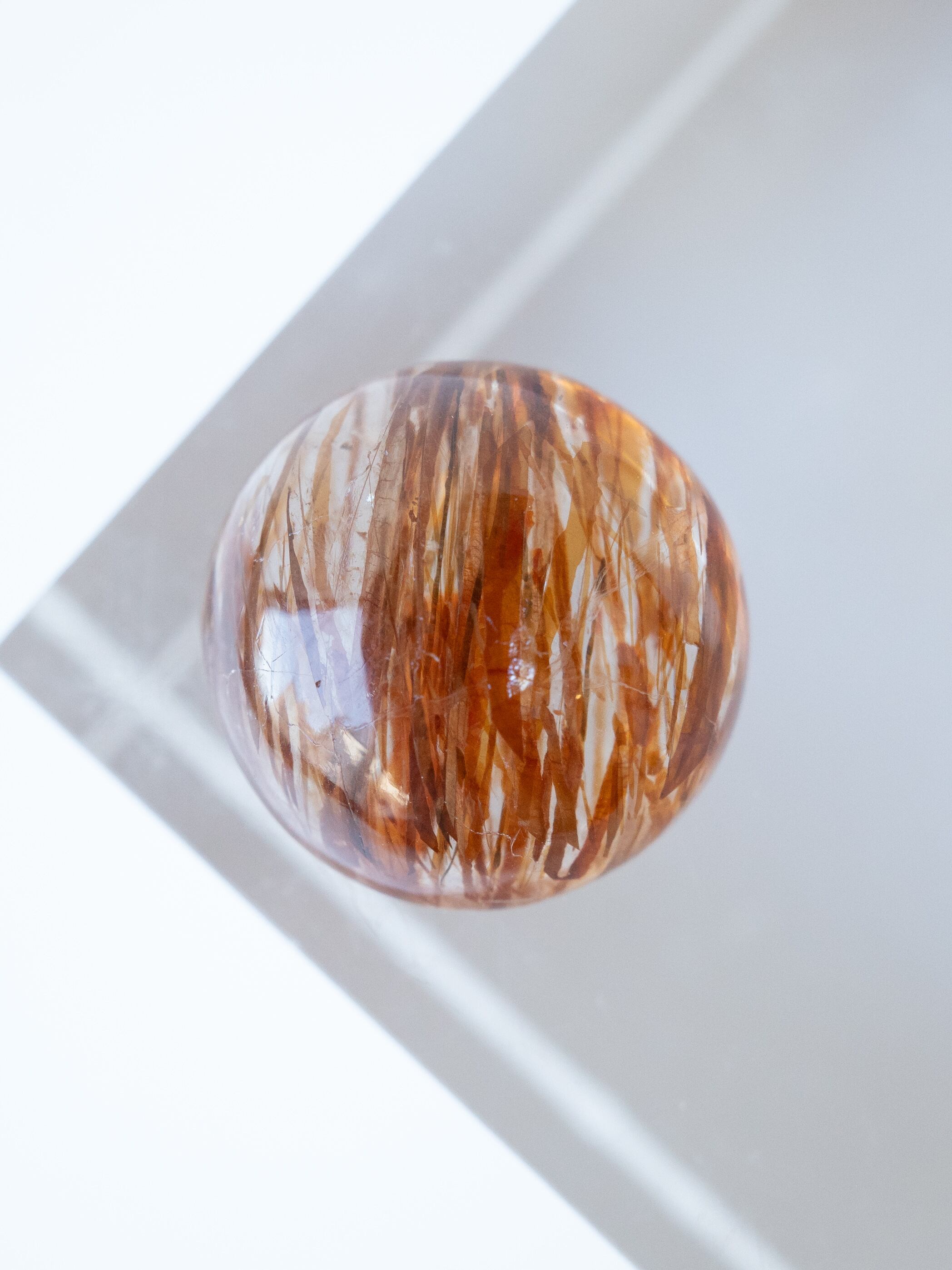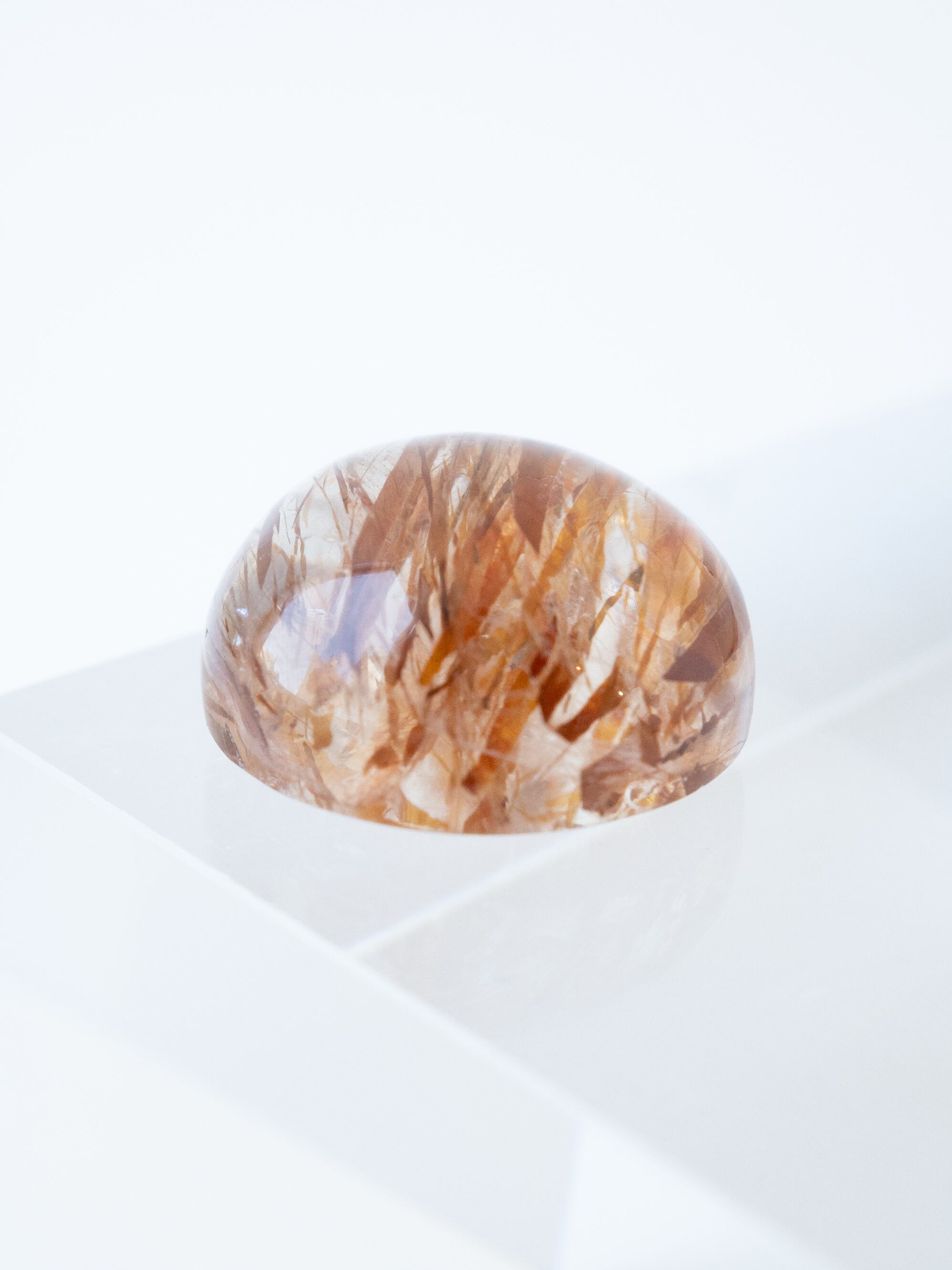 コニャックカラーのような赤みのあるブラウンが魅力のバイオタイトインクォーツ。この茶色いインクルージョンをベースに、まるでサンストーンのようにキラキラとメタリックな輝きを放つ部分は、「ヘマタイト」という鑑別が出ております。