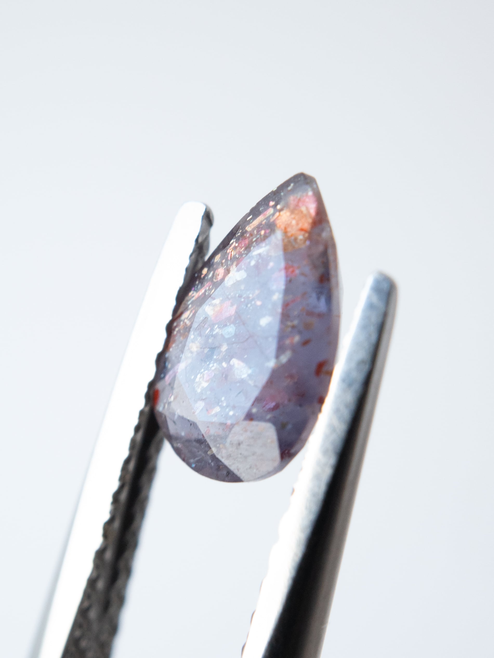 群青色のアイオライトに、細かな銅の結晶がキラキラと美しく輝く「ブラッドショットアイオライト」。その赤く煌めく様子から「充血した、血走った」という意味のブラドショット ( Bloodshot ) という名前で呼ばれるようになりました。