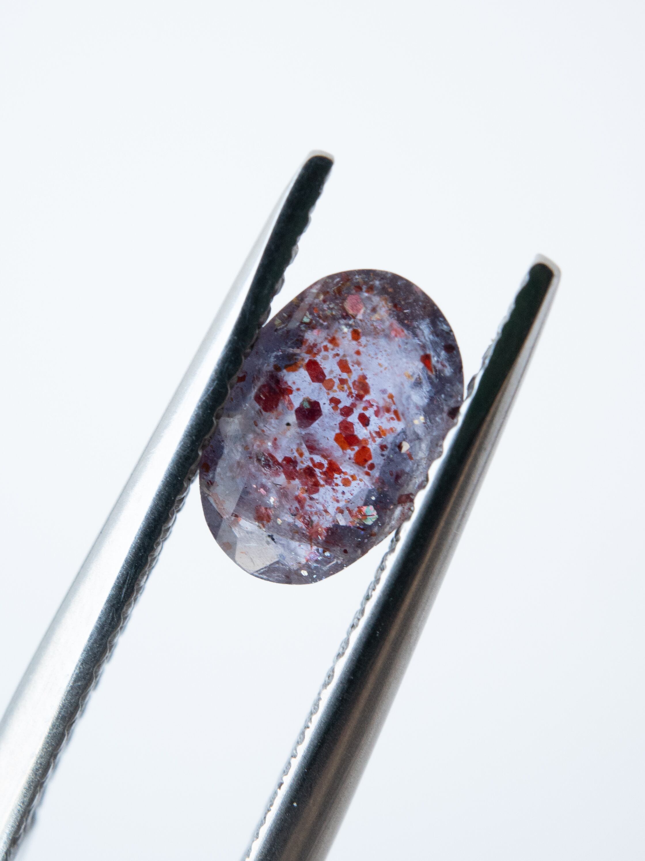 群青色のアイオライトに、細かな銅の結晶がキラキラと美しく輝く「ブラッドショットアイオライト」。その赤く煌めく様子から「充血した、血走った」という意味のブラドショット ( Bloodshot ) という名前で呼ばれるようになりました。