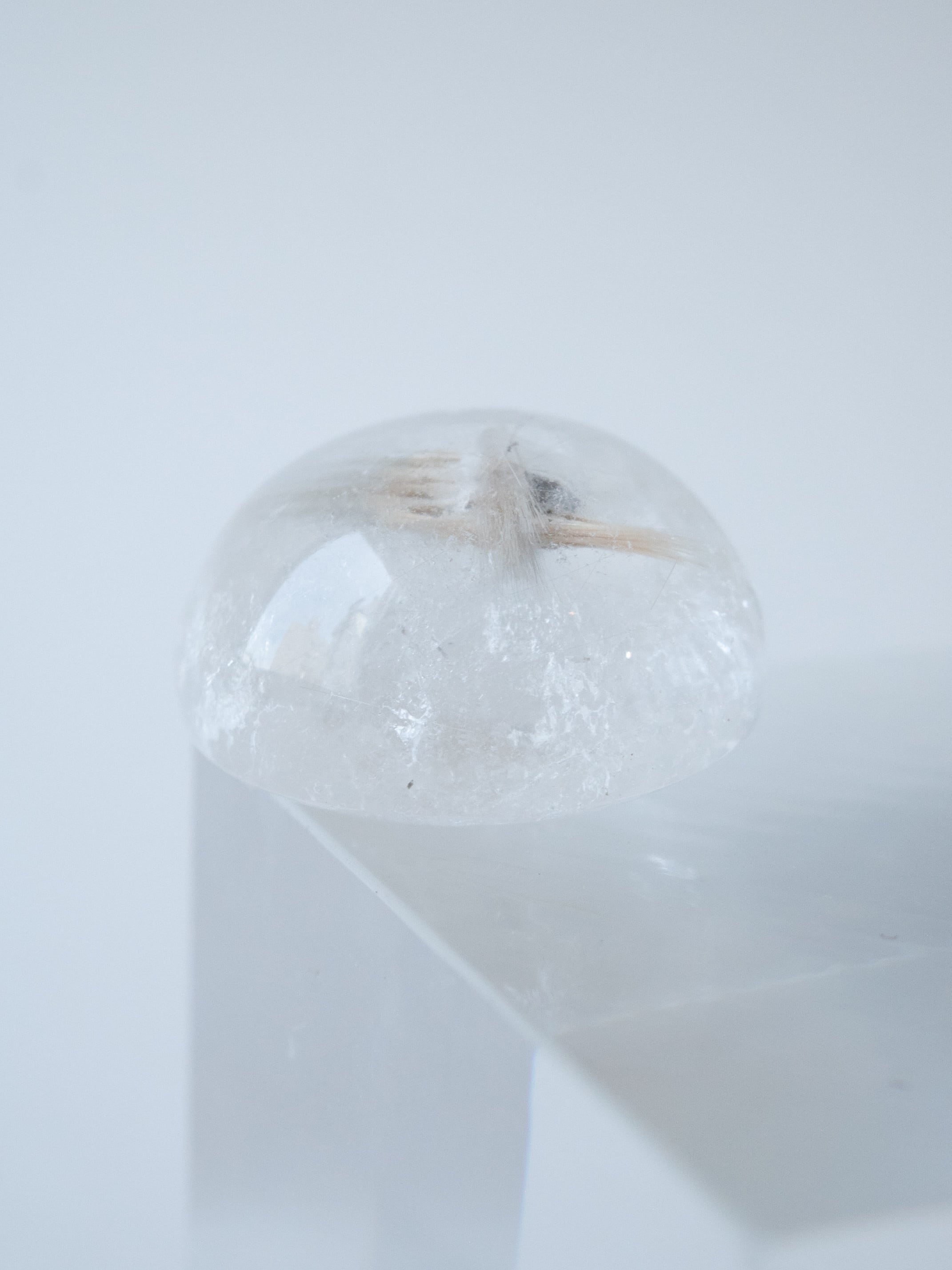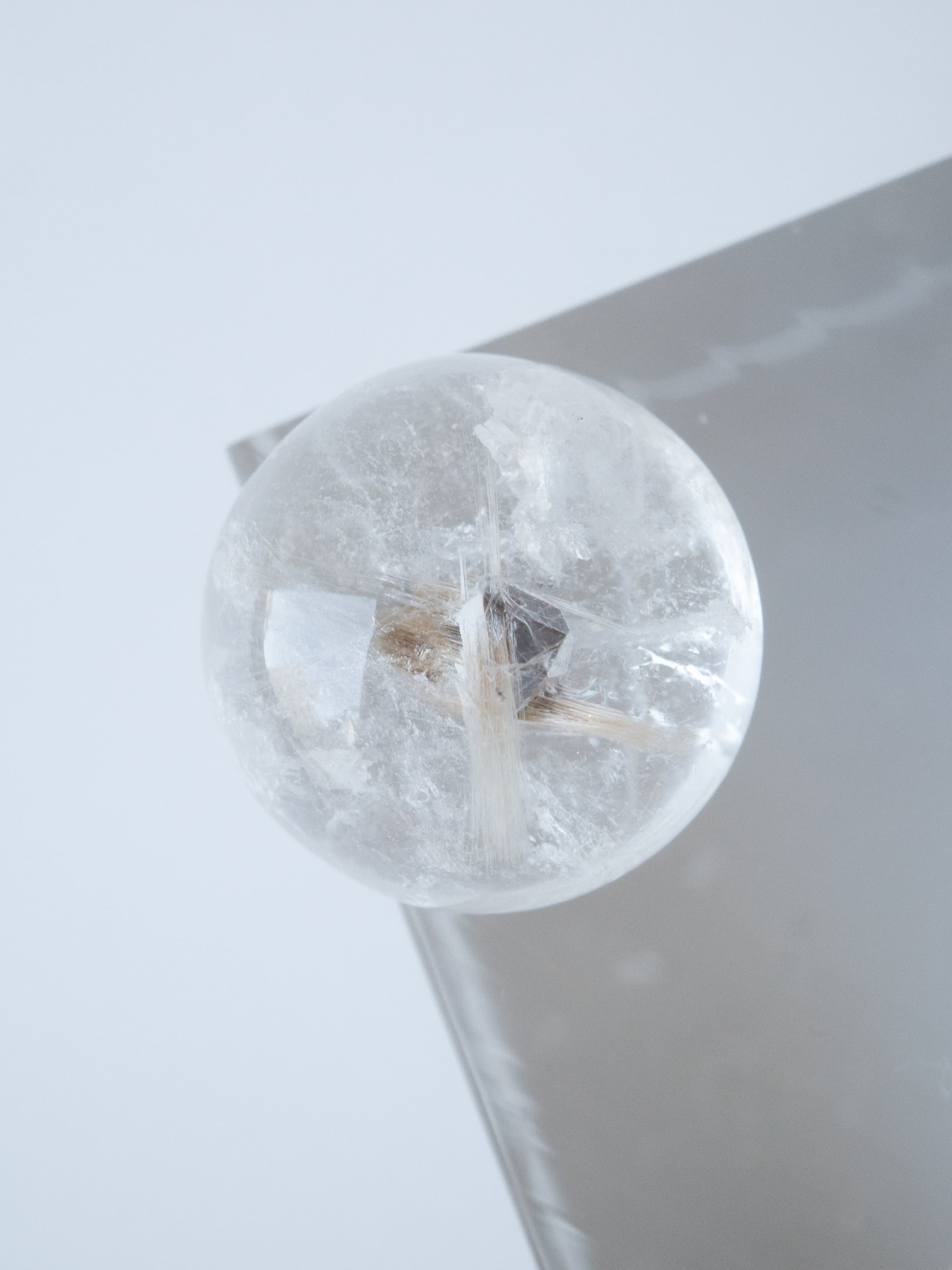 アナテース(鋭錐石)の結晶を内包した「アナテースインクォーツ」。アナテースはルチルやブルッカイトとの同じ酸化チタンから成り、形状の違う同質異像の鉱物です。産出量が少ないコレクターアイテム。是非内部の結晶を観察してお楽しみください。