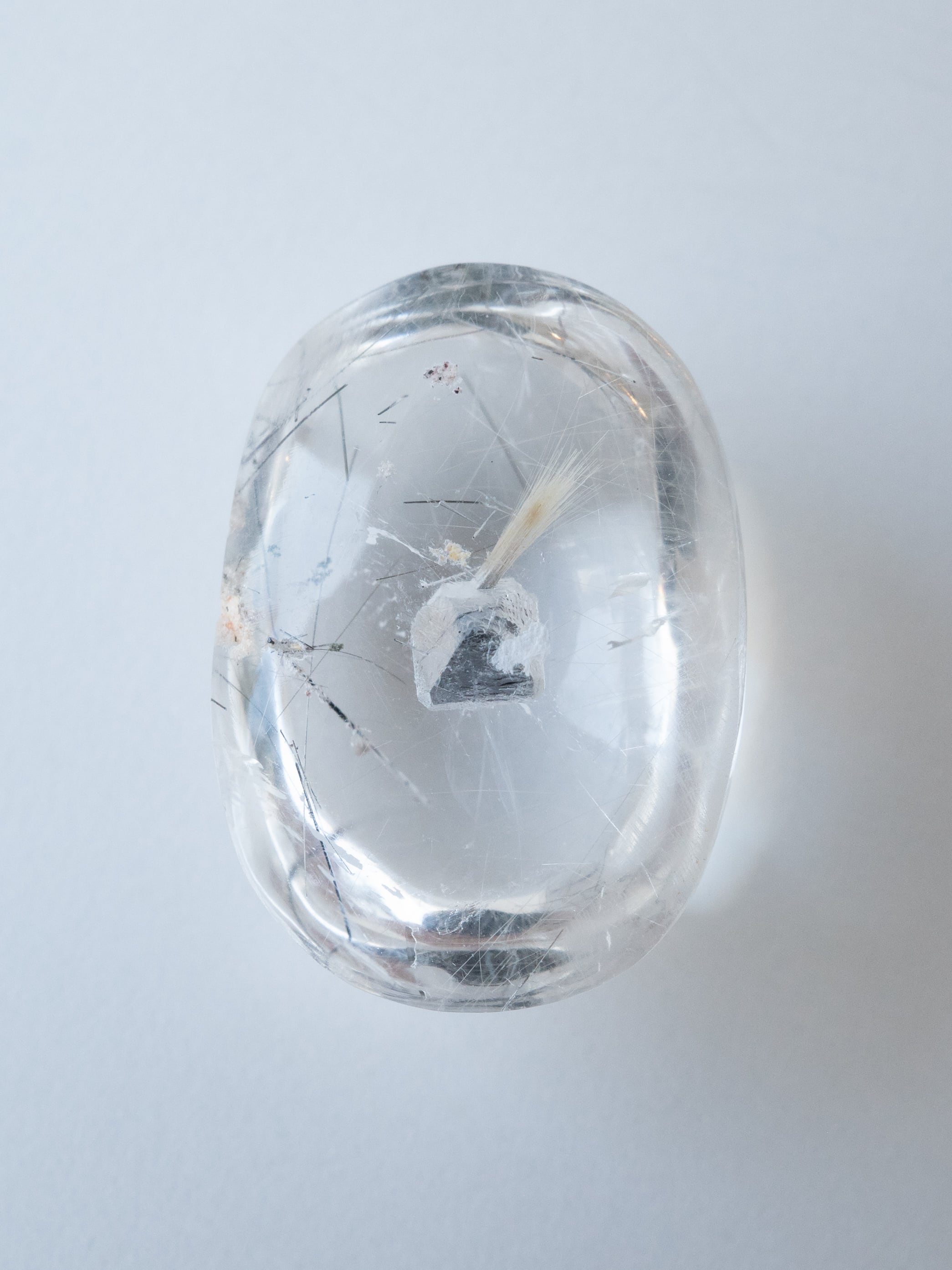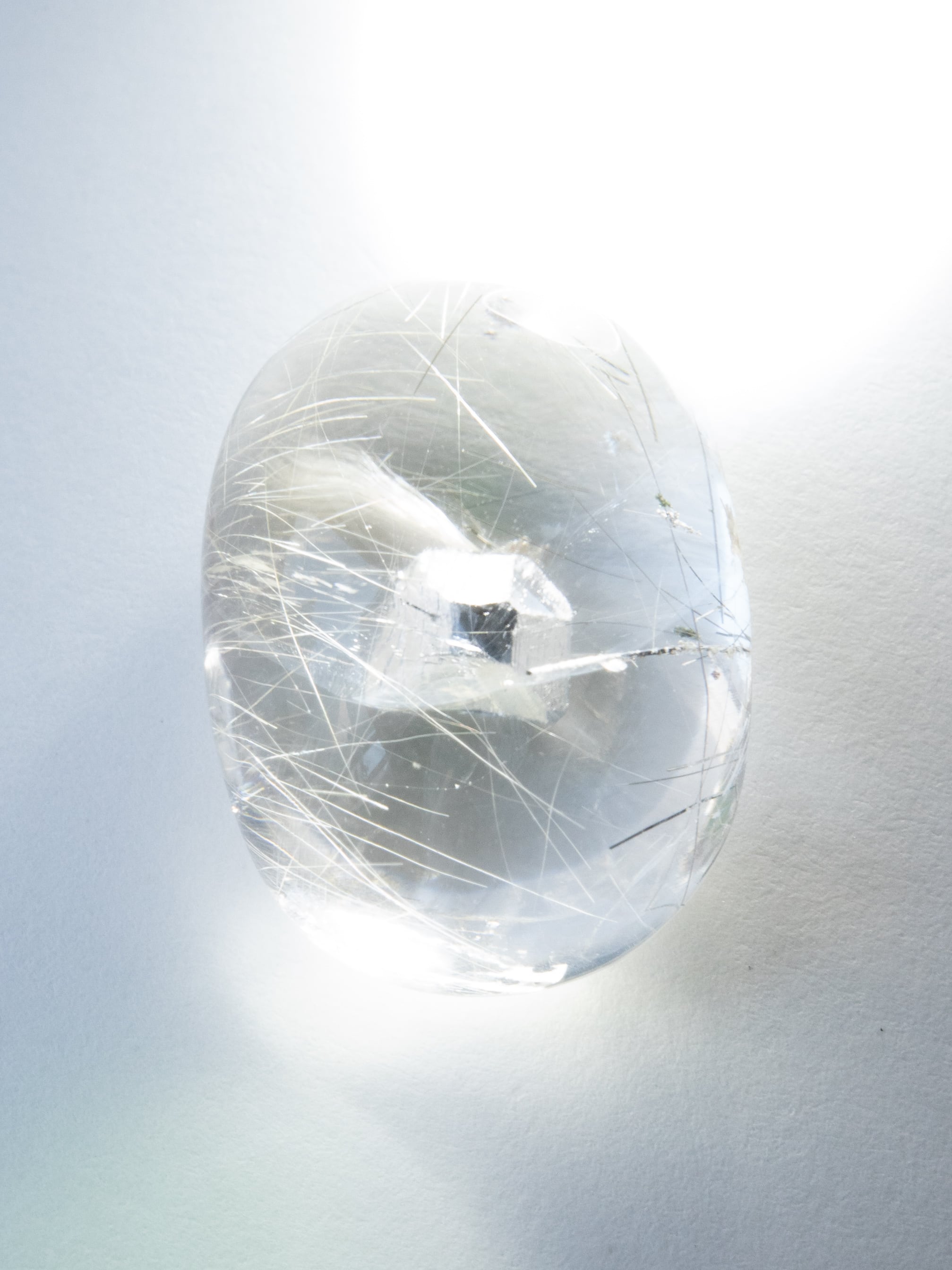 アナテース(鋭錐石)の結晶を内包した「アナテースインクォーツ」。アナテースはルチルやブルッカイトとの同じ酸化チタンから成り、形状の違う同質異像の鉱物です。産出量が少ないコレクターアイテム。是非内部の結晶を観察してお楽しみください。