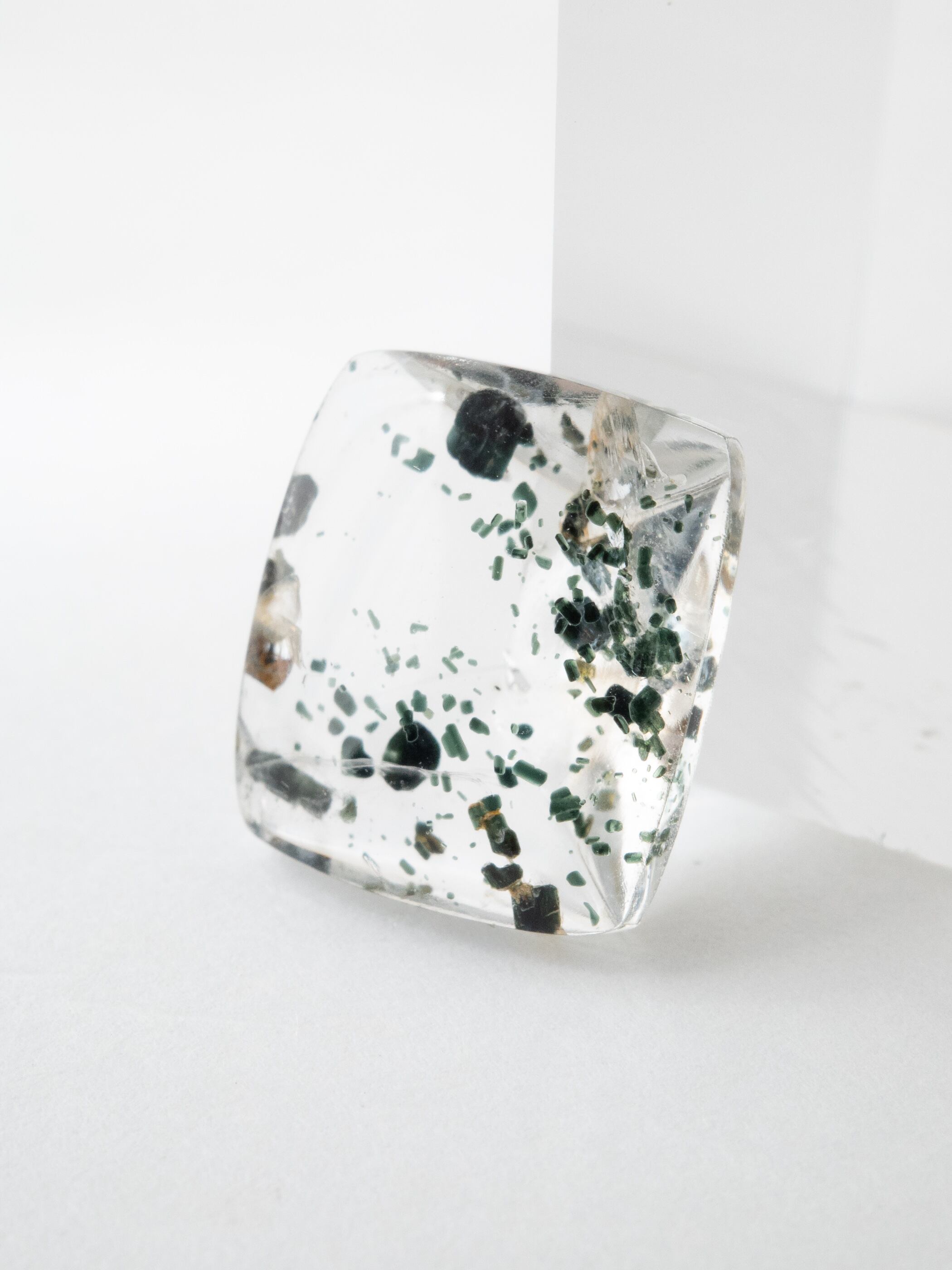 深いグリーンのインクルージョンが魅力のトレモライトインクォーツです。