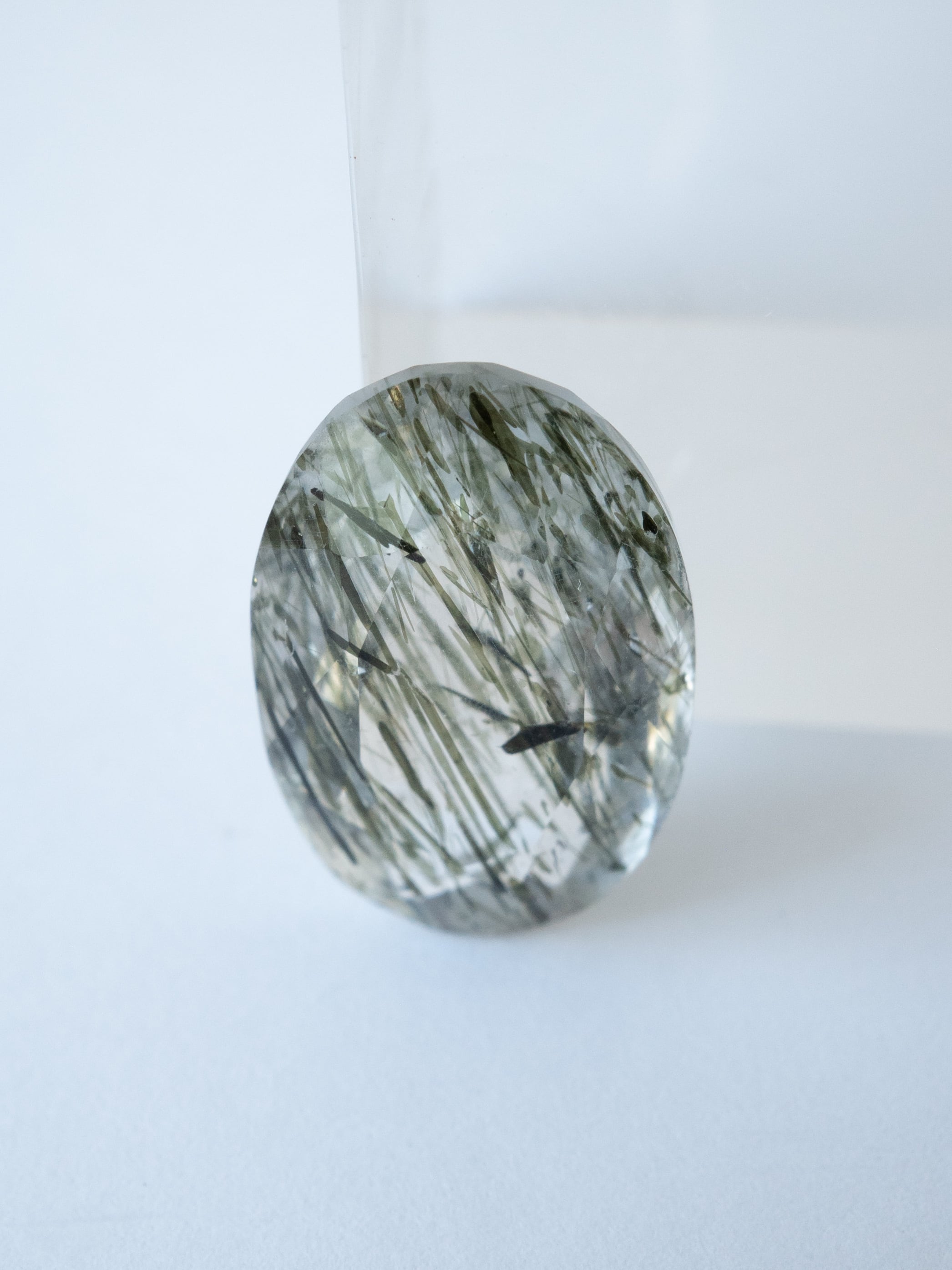 和名で緑簾石と呼ばれるエピドートを内包したエピドートインクォーツ。太い結晶が入ったものは竹のように見えたり、細い結晶が多く入ったものは、その見た目から別名『草入り水晶』とも呼ばれています。