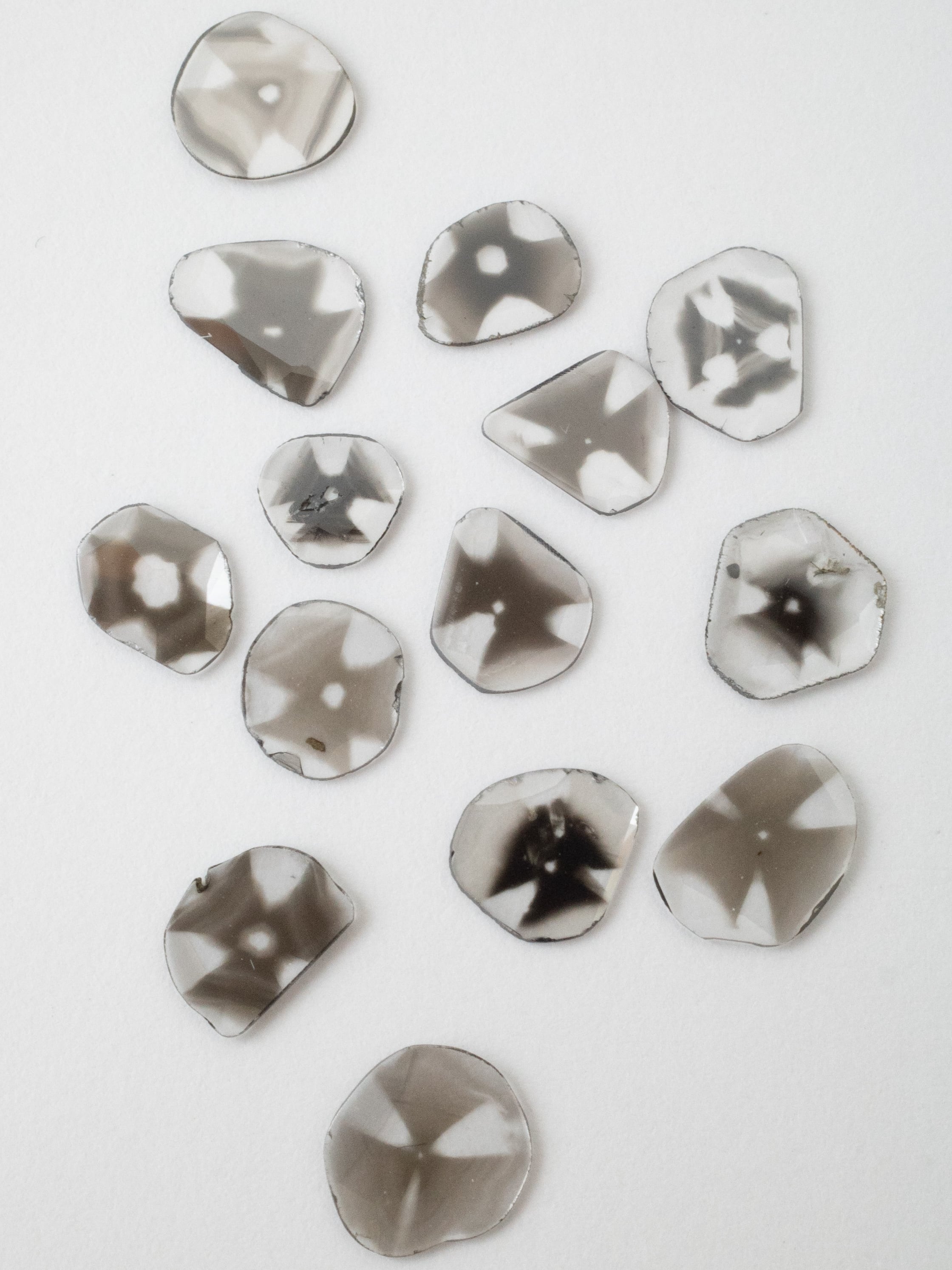 「スライスダイヤモンド」は天然ダイヤモンドを非常に薄くスライスしたフラットなルースで、ファセットカットではないものの、ダイヤモンド特有の強い光沢と透明感、そして自然に作り上げられた特徴的な模様を楽しめる宝石です。