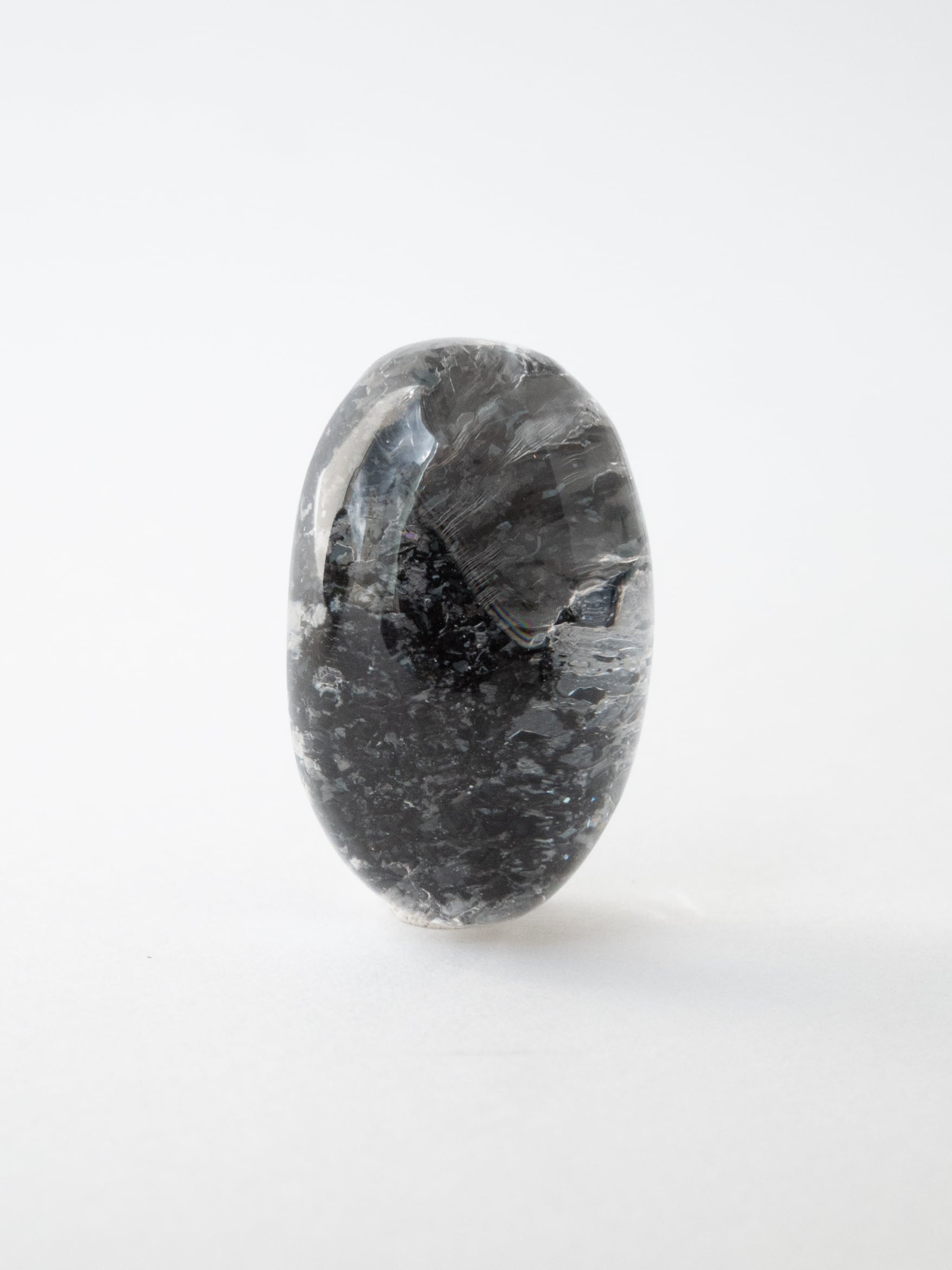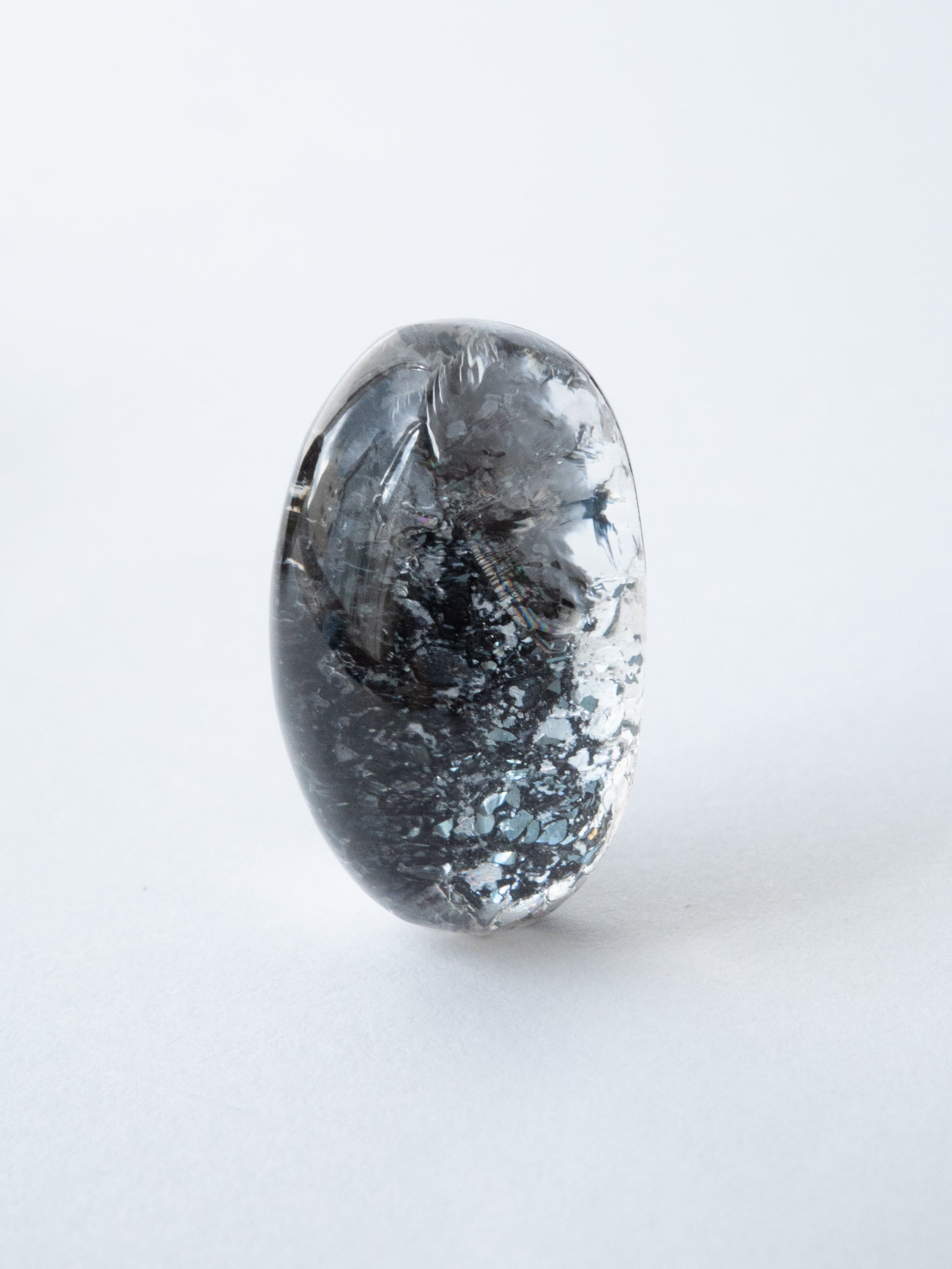 A type of Hematite-in-Quartz densely packed with fine hematite, sparkling like a jet-black universe. Its brilliance is truly captivating. At SELSHA, we distinguish it from the larger crystal type and call it “Galaxy Hematite-in-Quartz.”
