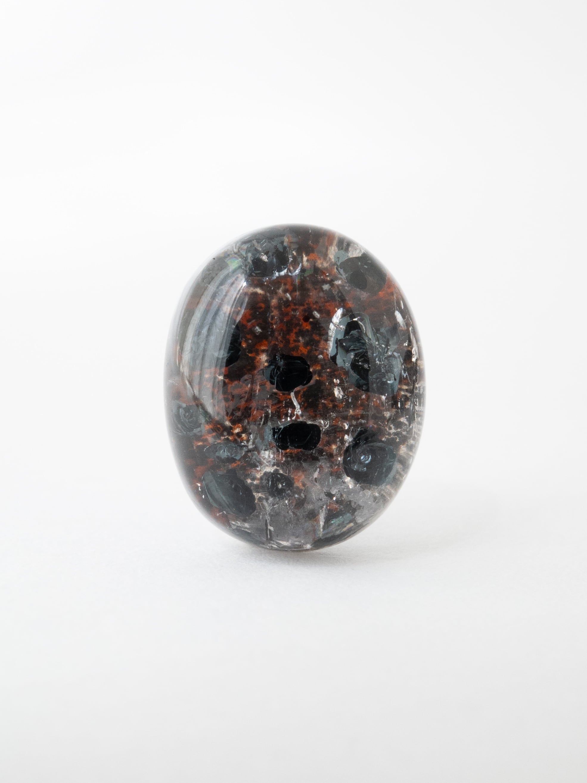 こちらは黒いヘマタイトの結晶が水晶の中に散りばめられ、まるでダルメシアンの模様のように見えるヘマタイトインクォーツです。
