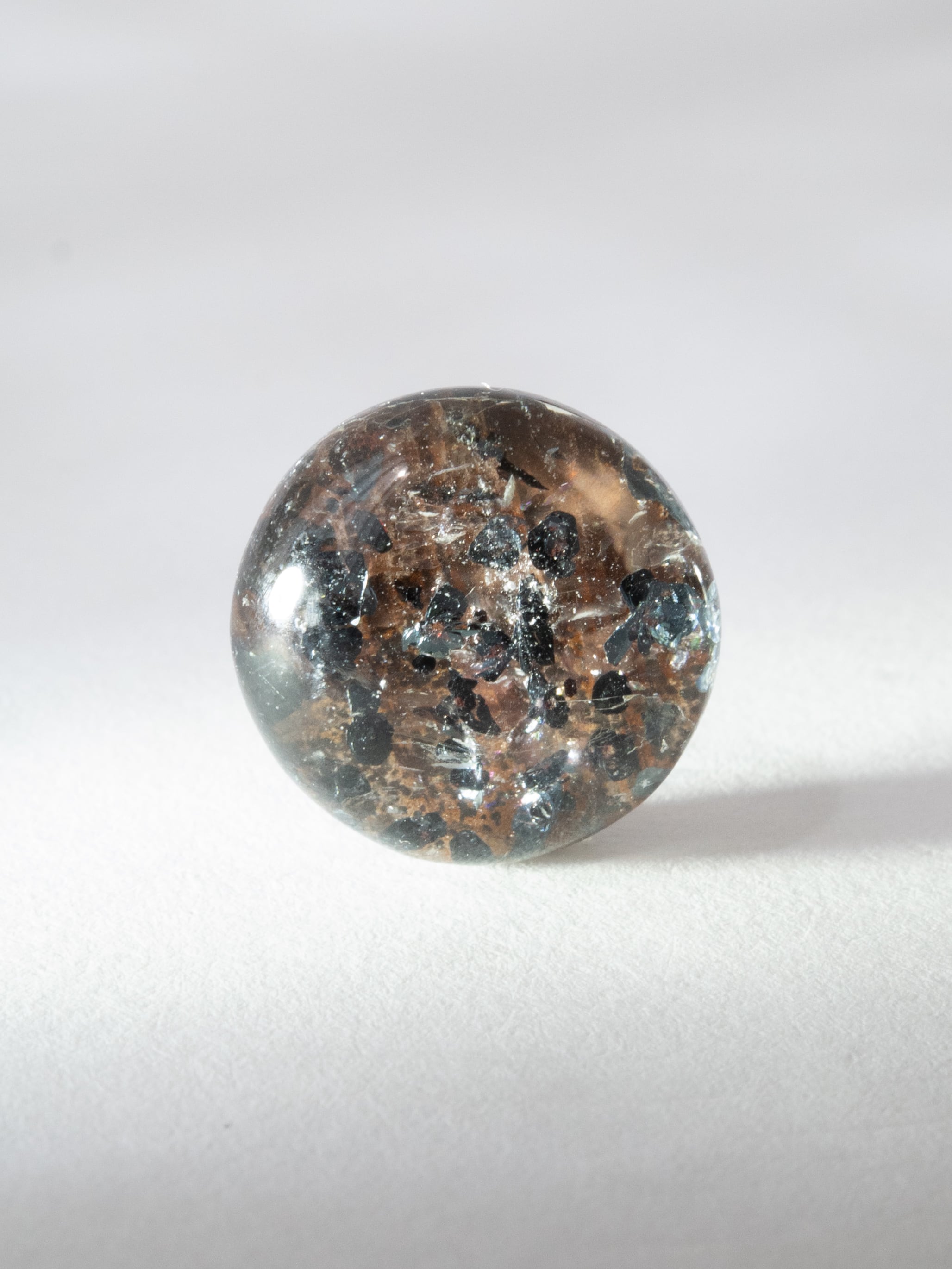 こちらは黒いヘマタイトの結晶が水晶の中に散りばめられ、まるでダルメシアンの模様のように見えるヘマタイトインクォーツです。