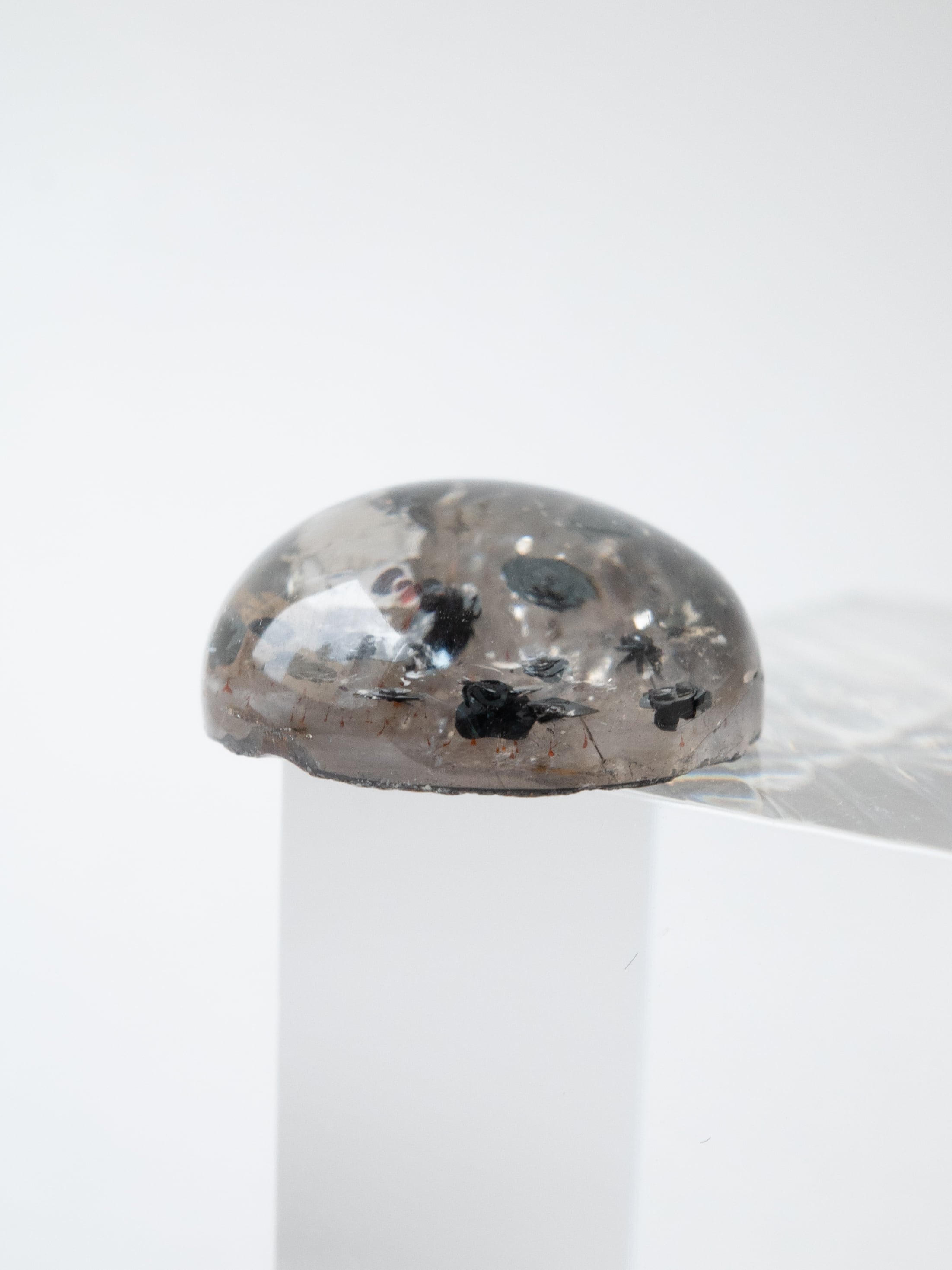 こちらは黒いヘマタイトの結晶が水晶の中に散りばめられ、まるでダルメシアンの模様のように見えるヘマタイトインクォーツです。