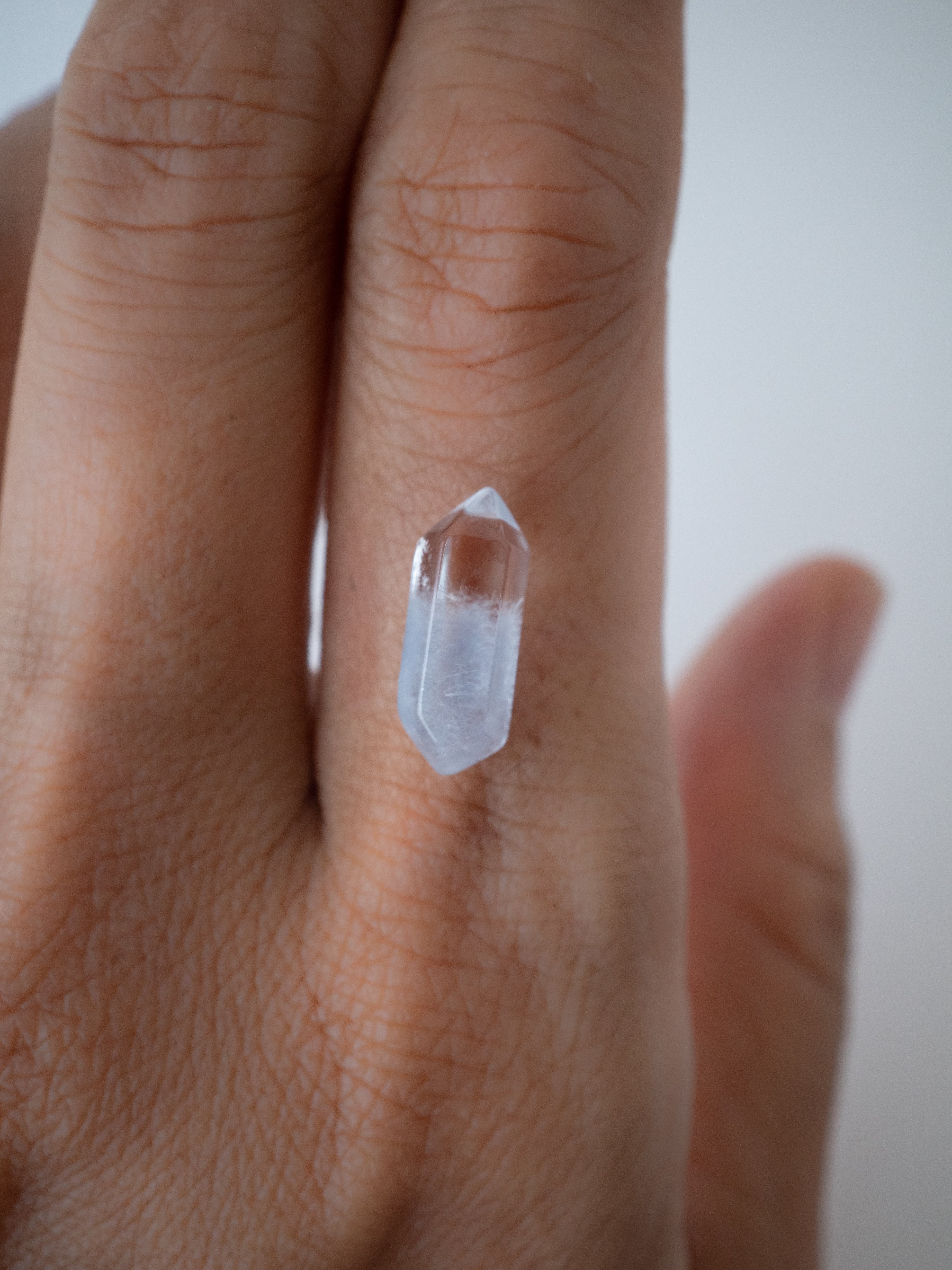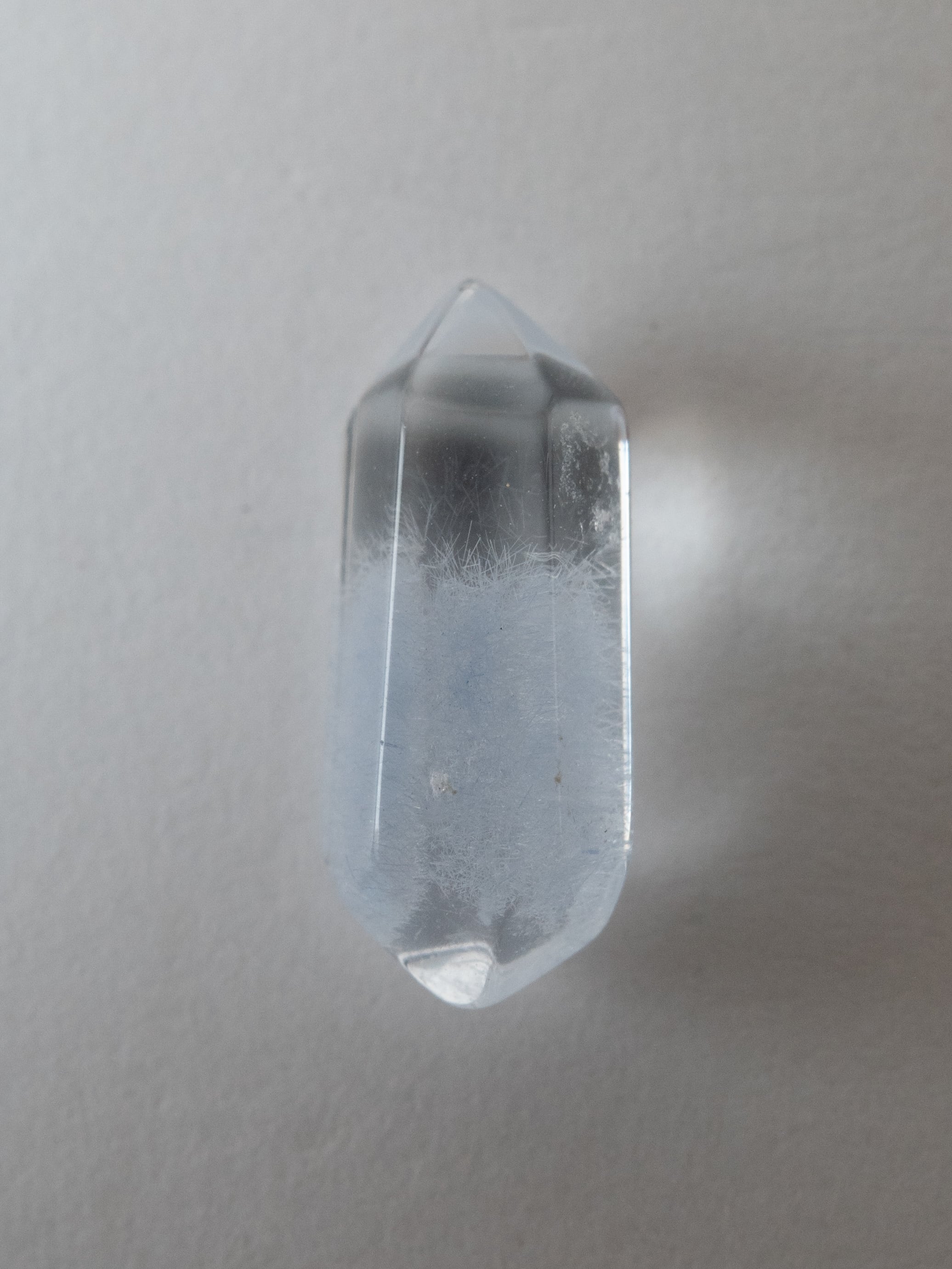 透明感のある涼しげなデュモルチェライトインクォーツ。淡いブルーの花が咲いたようなインクルージョンは唯一無二の美しさです。