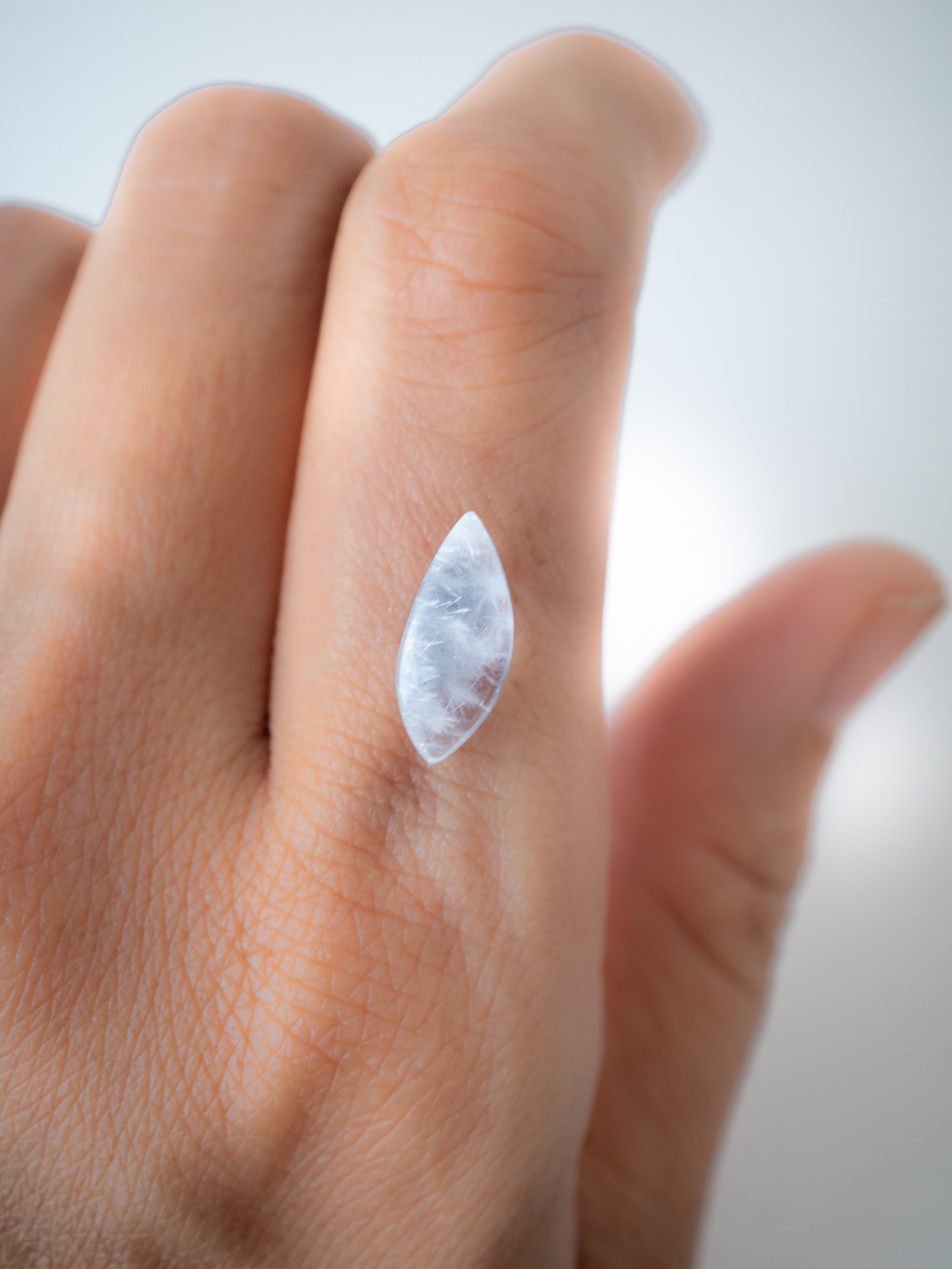 A transparent and refreshing Dumortierite-in-Quartz. The pale blue inclusions resemble delicate blooming flowers, creating a one-of-a-kind beauty.