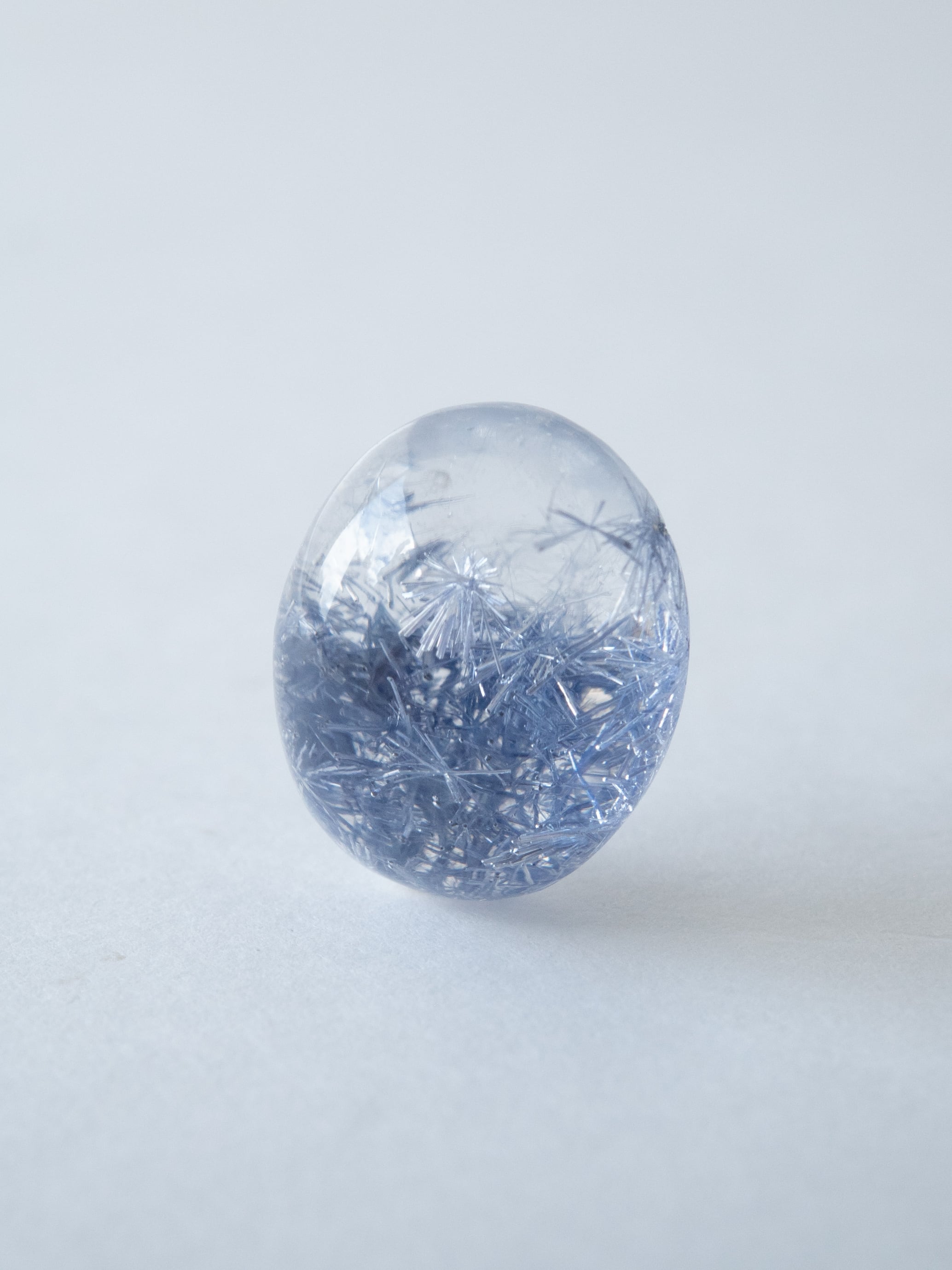 透明感のある涼しげなデュモルチェライトインクォーツ。淡いブルーの花が咲いたようなインクルージョンは唯一無二の美しさです。