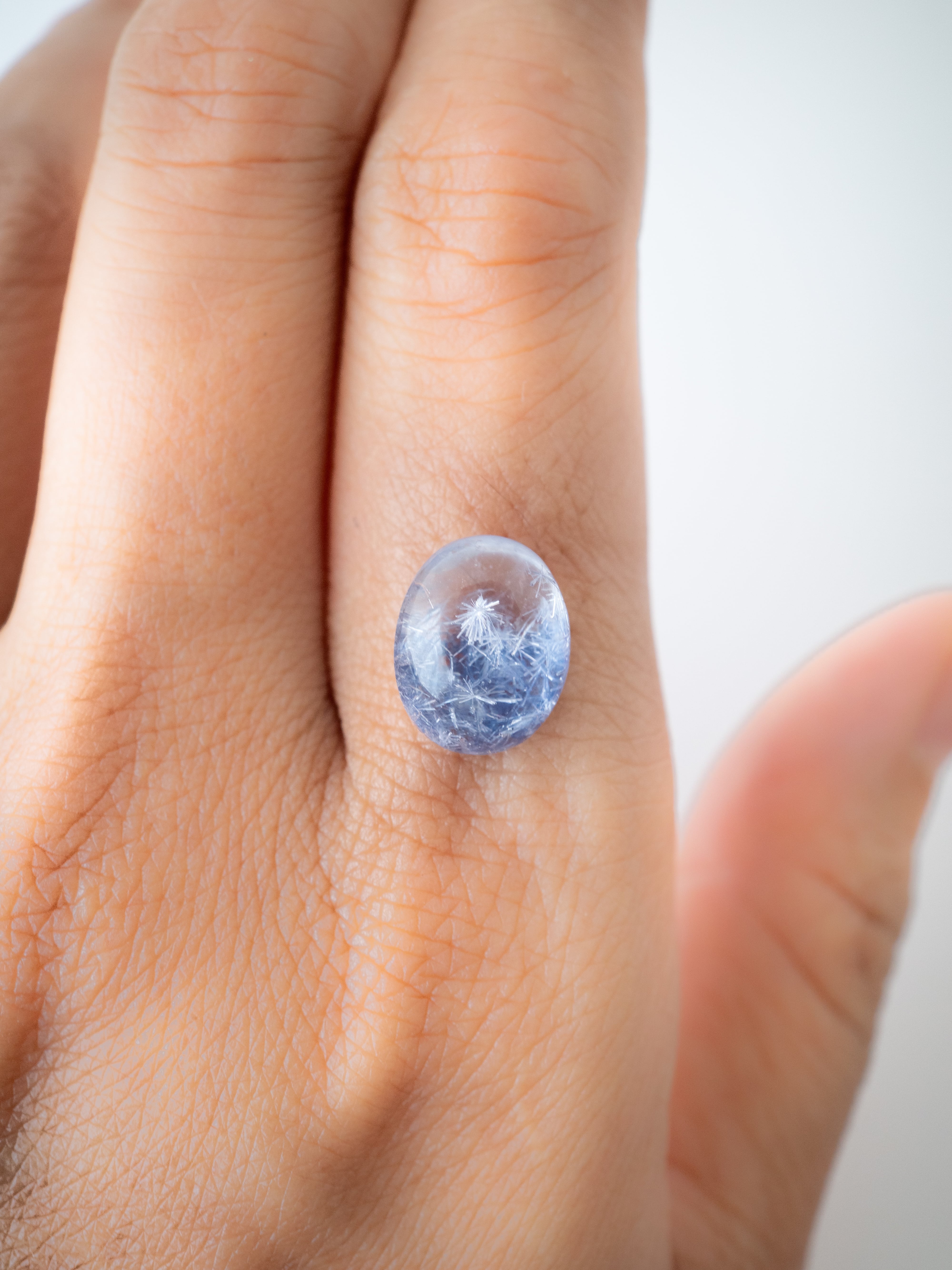 A transparent and refreshing Dumortierite-in-Quartz. The pale blue inclusions resemble delicate blooming flowers, creating a one-of-a-kind beauty.