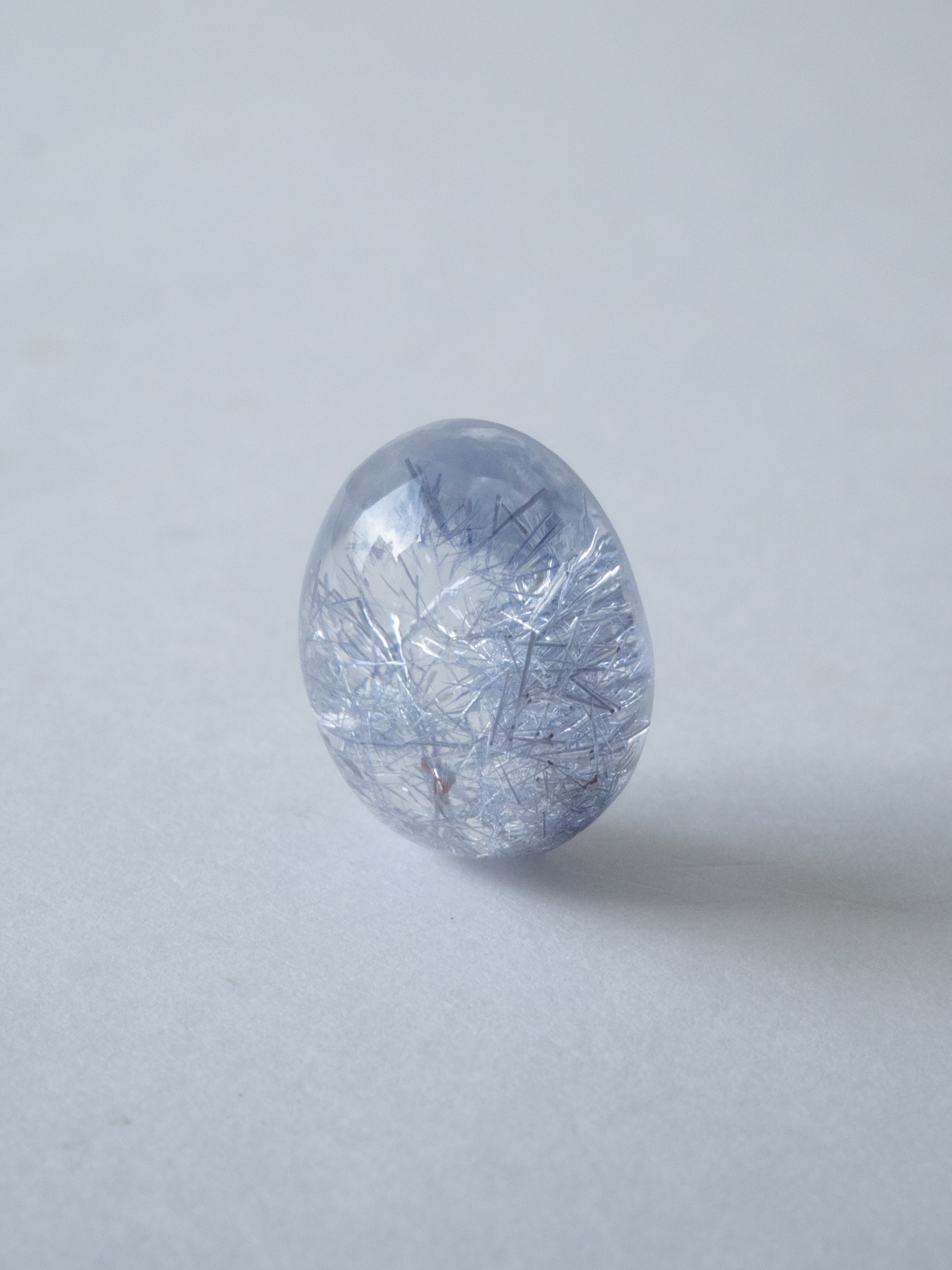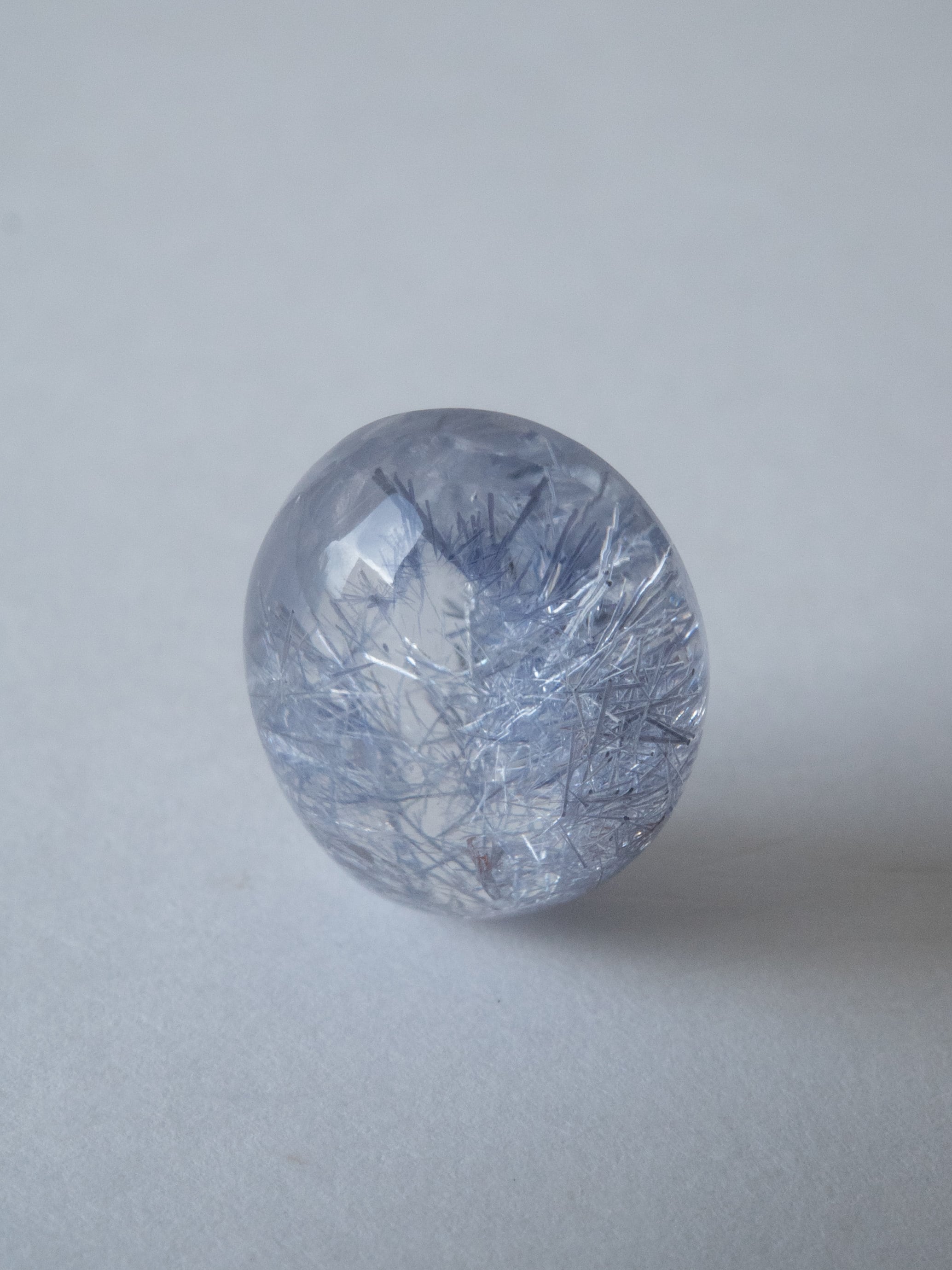 透明感のある涼しげなデュモルチェライトインクォーツ。淡いブルーの花が咲いたようなインクルージョンは唯一無二の美しさです。