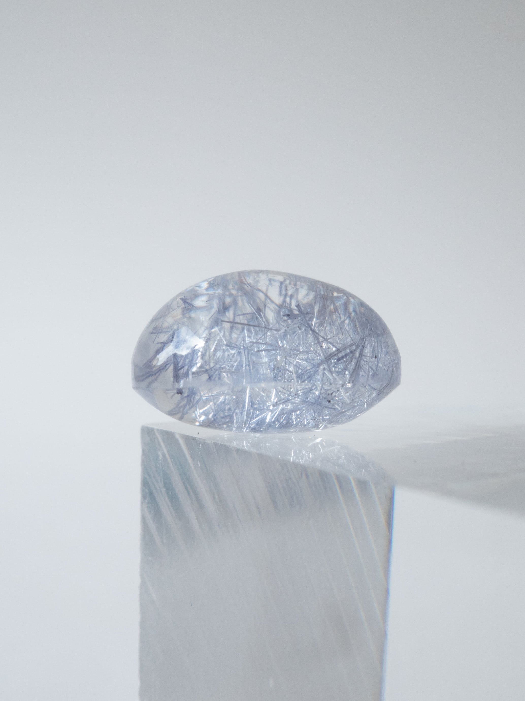 A transparent and refreshing Dumortierite-in-Quartz. The pale blue inclusions resemble delicate blooming flowers, creating a one-of-a-kind beauty.