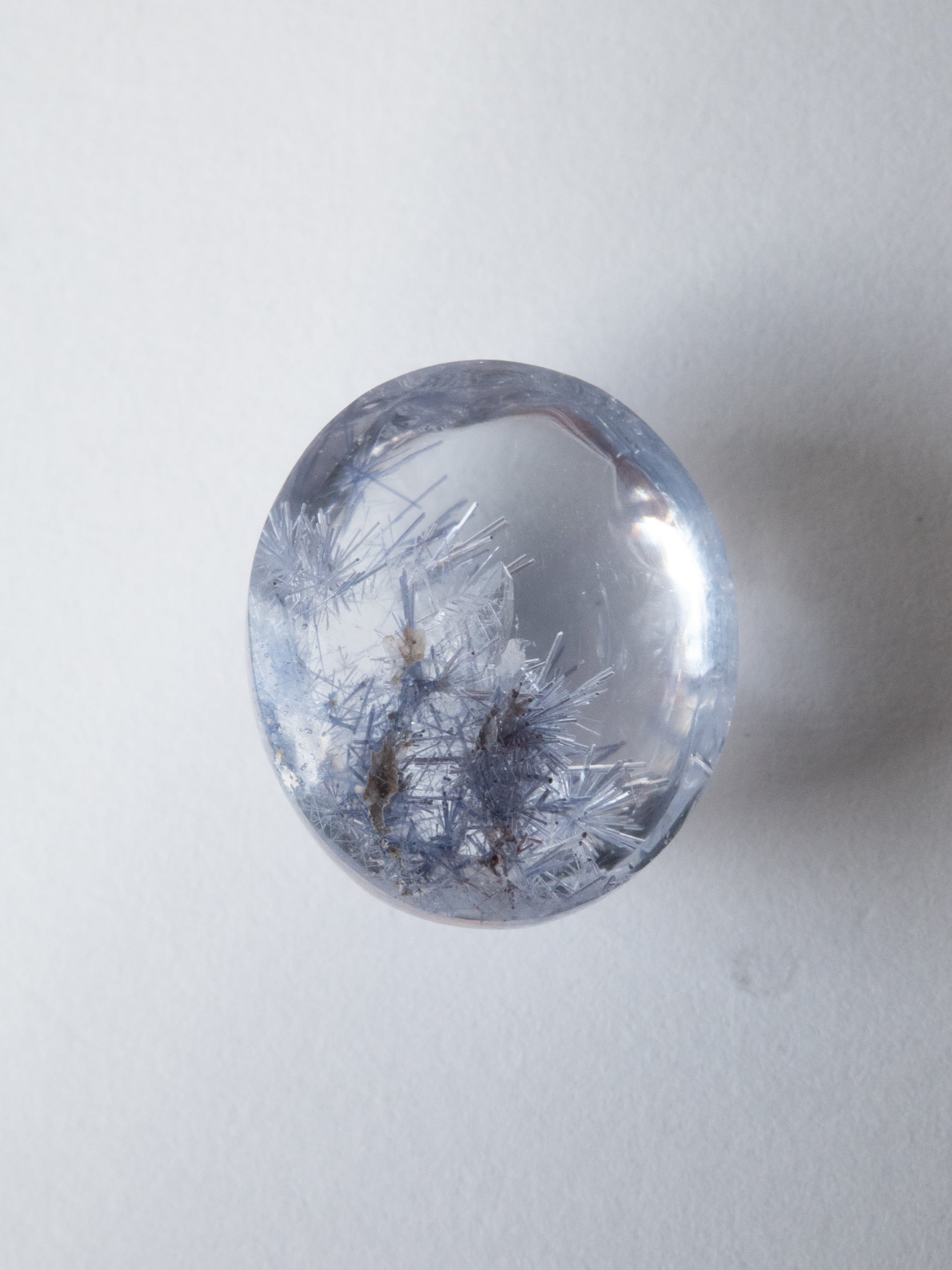 A transparent and refreshing Dumortierite-in-Quartz. The pale blue inclusions resemble delicate blooming flowers, creating a one-of-a-kind beauty.