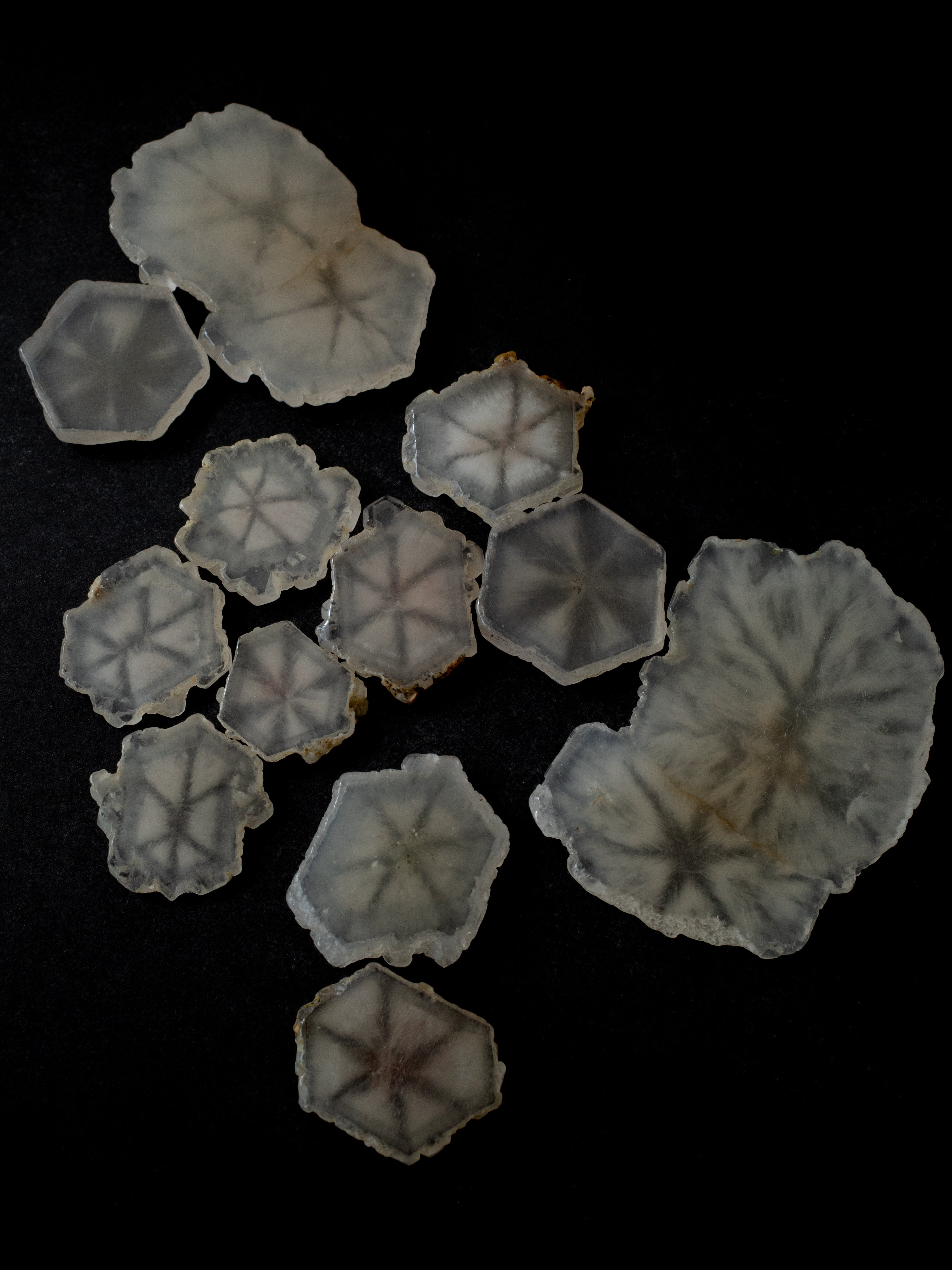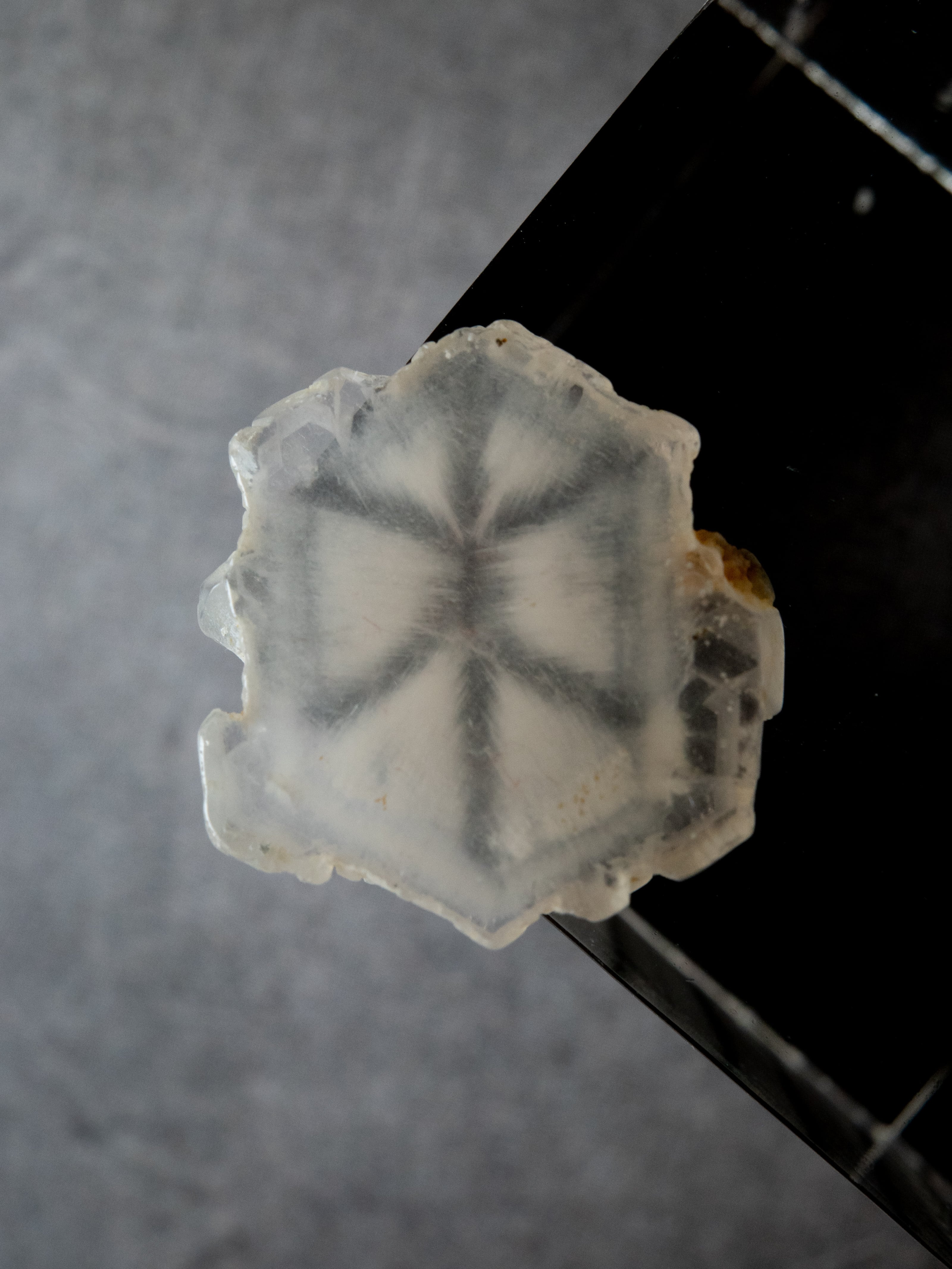 “Trapiche Quartz” refers to quartz crystals that display a six-rayed radial pattern, sliced in the direction that reveals this distinctive motif. The term “trapiche” comes from the Spanish word for a sugar-cane mill, and was originally used to describe emeralds with gear-like radial patterns. Although the internal structure of quartz is different from that of trapiche emeralds, quartz showing a similar appearance came to be known as “Trapiche Quartz” due to its visual resemblance.