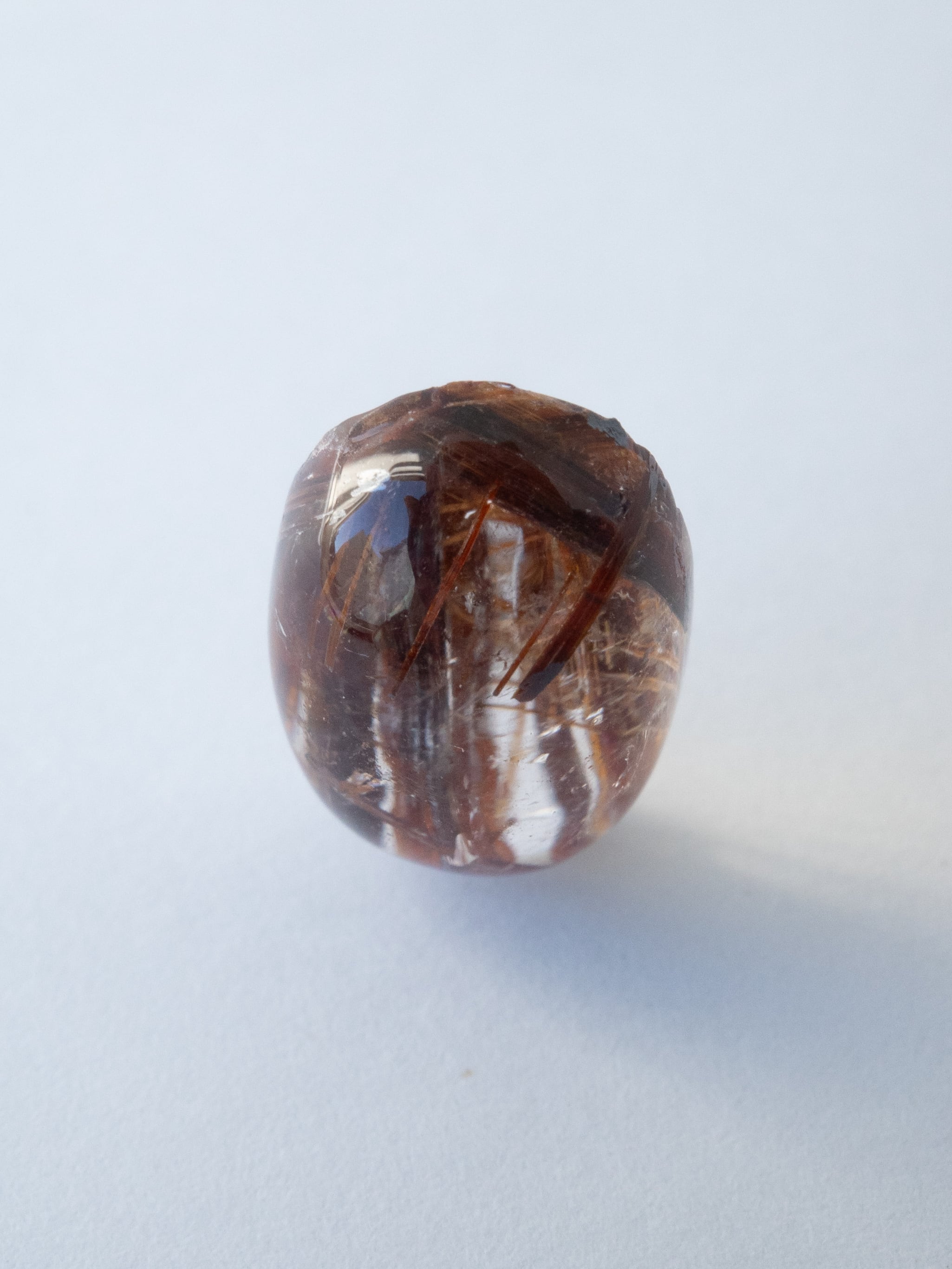 『レッドルチルクォーツ』は、一般的に知られるゴールドのルチルとは違い、鉄を微量含まれることによって酸素と反応し、赤い色に見えるルチルクォーツです。チタン鉱物特有の金属光沢があり、透明度の高いクォーツの中で反射して輝く姿はとても魅力的です。金色や褐色よりもはるかに産出量が少ないため、数がご用意できない天然石でもあります。