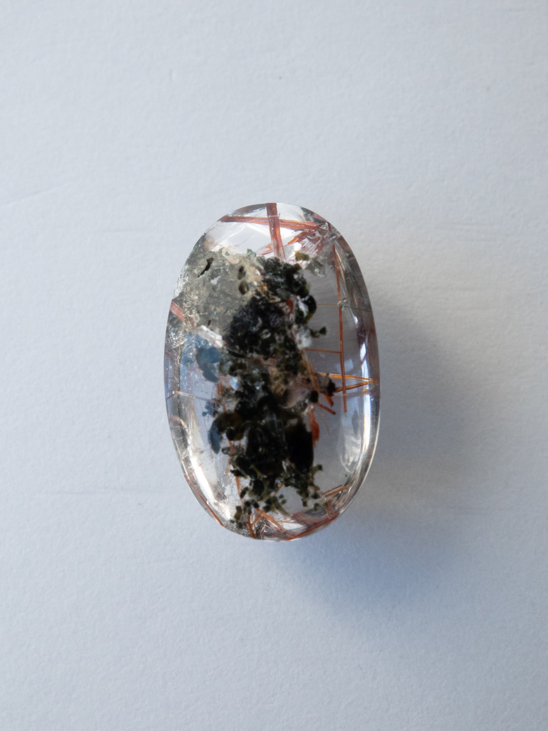 『レッドルチルクォーツ』は、一般的に知られるゴールドのルチルとは違い、鉄を微量含まれることによって酸素と反応し、赤い色に見えるルチルクォーツです。チタン鉱物特有の金属光沢があり、透明度の高いクォーツの中で反射して輝く姿はとても魅力的です。金色や褐色よりもはるかに産出量が少ないため、数がご用意できない天然石でもあります。
