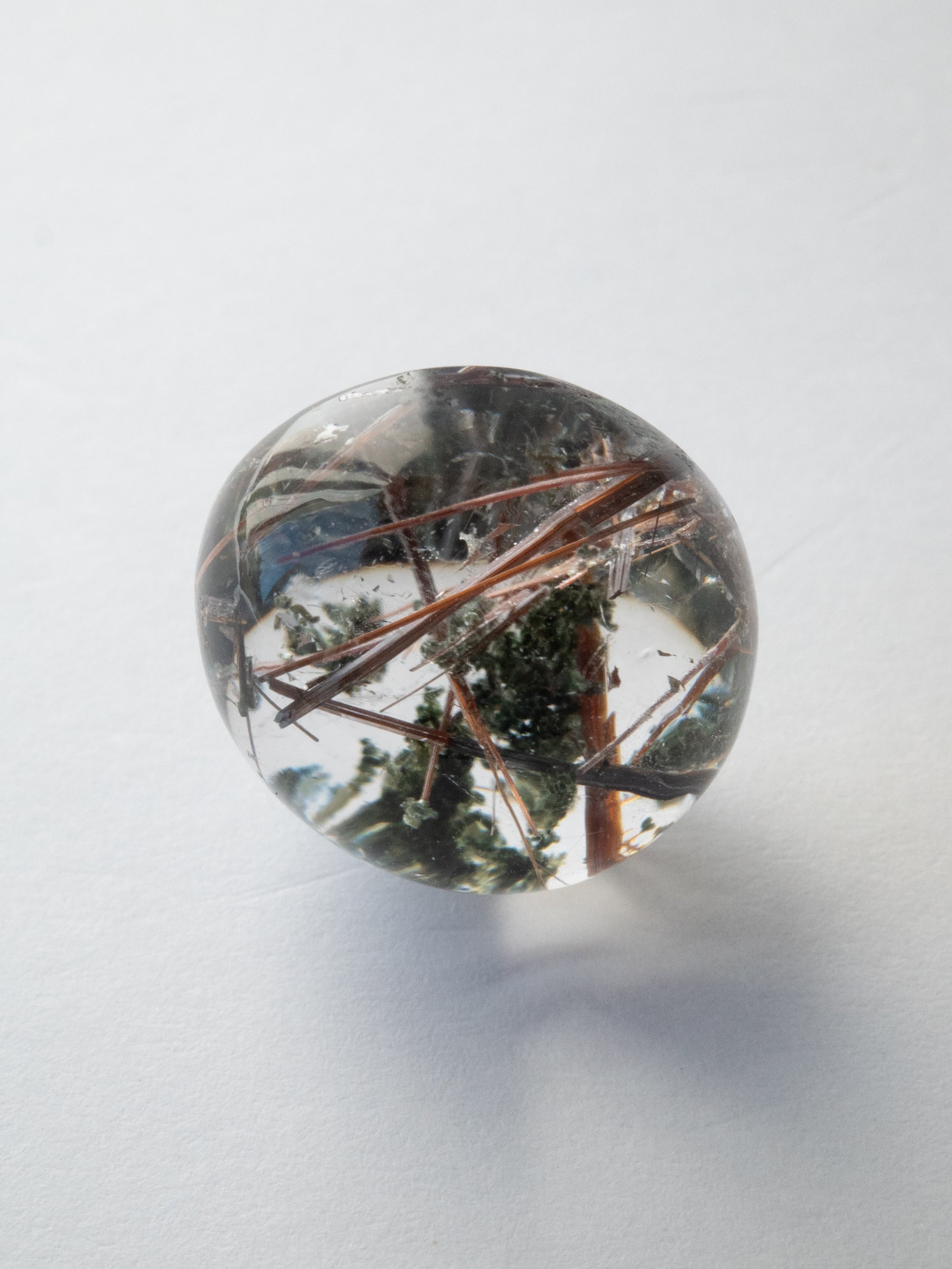 『レッドルチルクォーツ』は、一般的に知られるゴールドのルチルとは違い、鉄を微量含まれることによって酸素と反応し、赤い色に見えるルチルクォーツです。チタン鉱物特有の金属光沢があり、透明度の高いクォーツの中で反射して輝く姿はとても魅力的です。金色や褐色よりもはるかに産出量が少ないため、数がご用意できない天然石でもあります。
