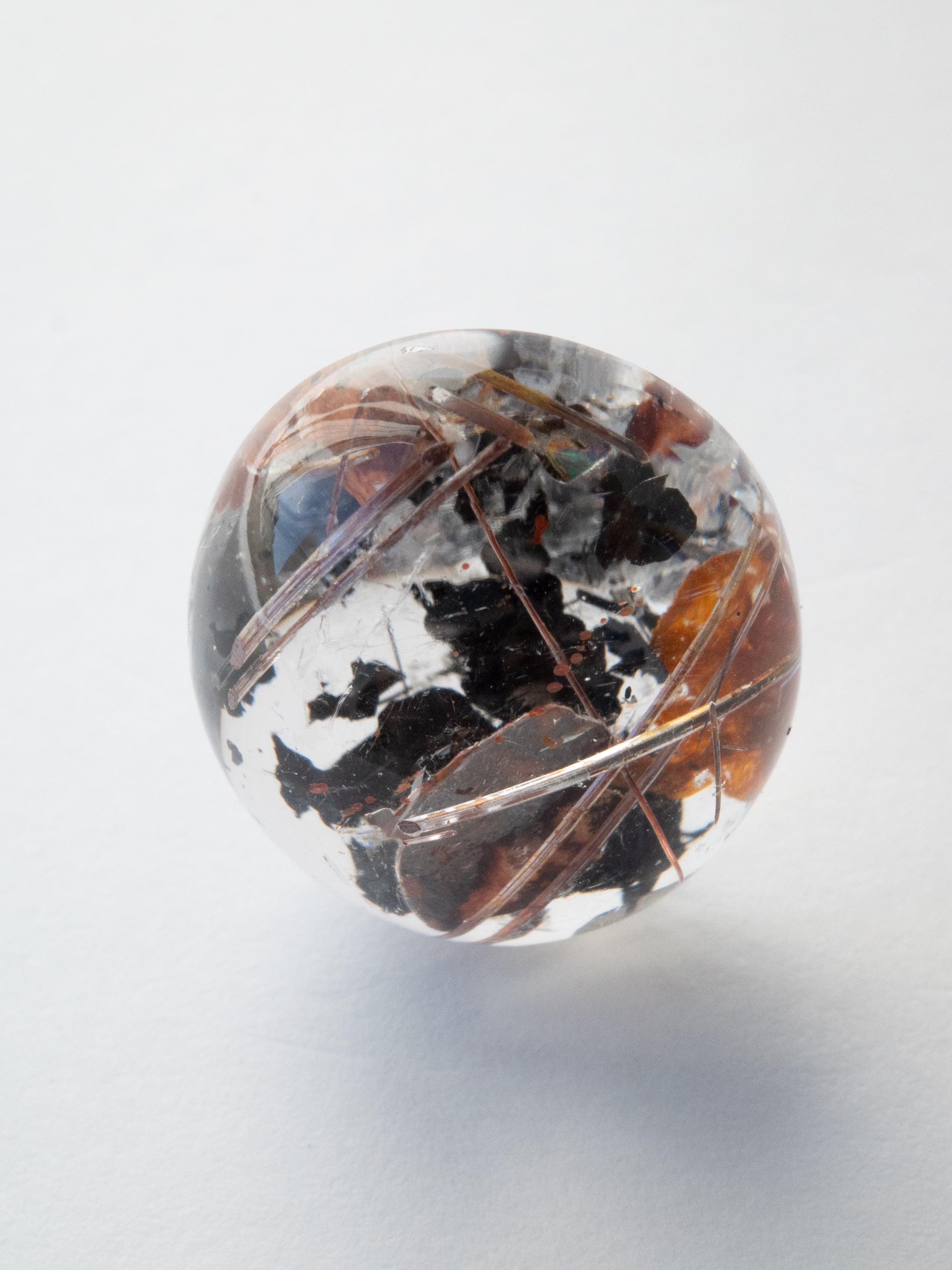『レッドルチルクォーツ』は、一般的に知られるゴールドのルチルとは違い、鉄を微量含まれることによって酸素と反応し、赤い色に見えるルチルクォーツです。チタン鉱物特有の金属光沢があり、透明度の高いクォーツの中で反射して輝く姿はとても魅力的です。金色や褐色よりもはるかに産出量が少ないため、数がご用意できない天然石でもあります。