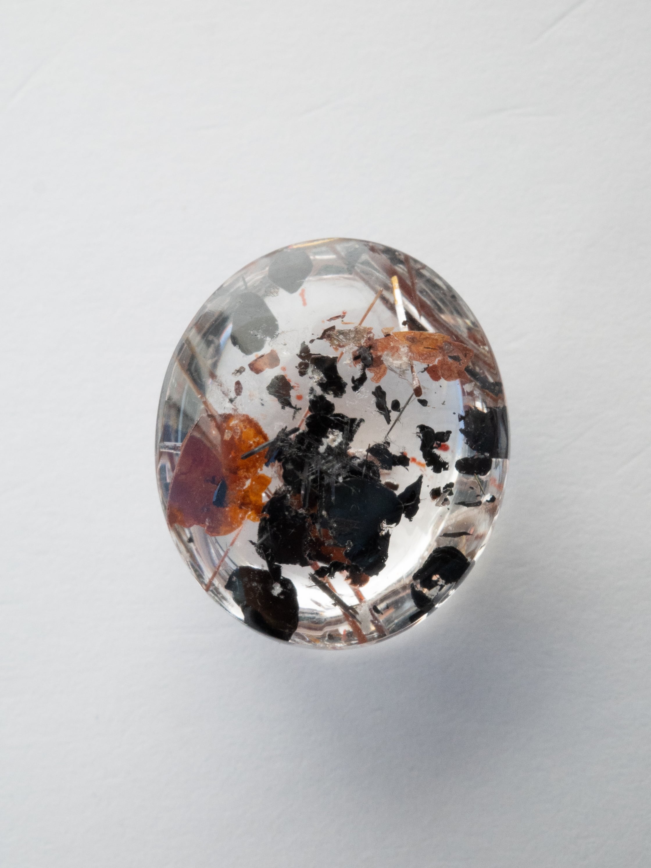 Red rutilated quartz differs from the commonly known golden rutile quartz. Its red color comes from trace amounts of iron reacting with oxygen. With the metallic luster characteristic of titanium minerals, the rutile needles reflect light beautifully within the highly transparent quartz. Because it is produced in far smaller quantities than the golden or brown varieties, it is a natural stone that is often difficult to source in large numbers.