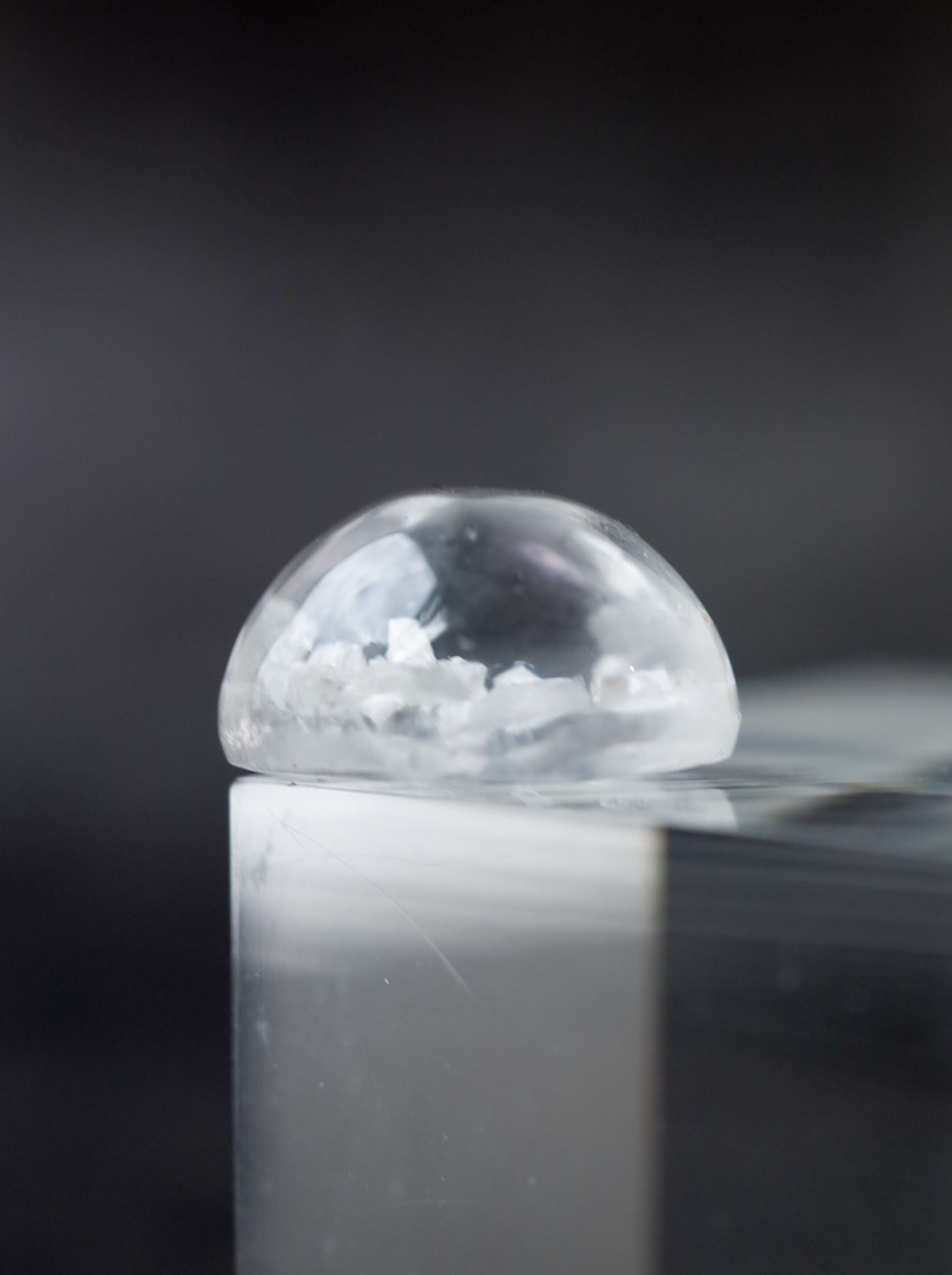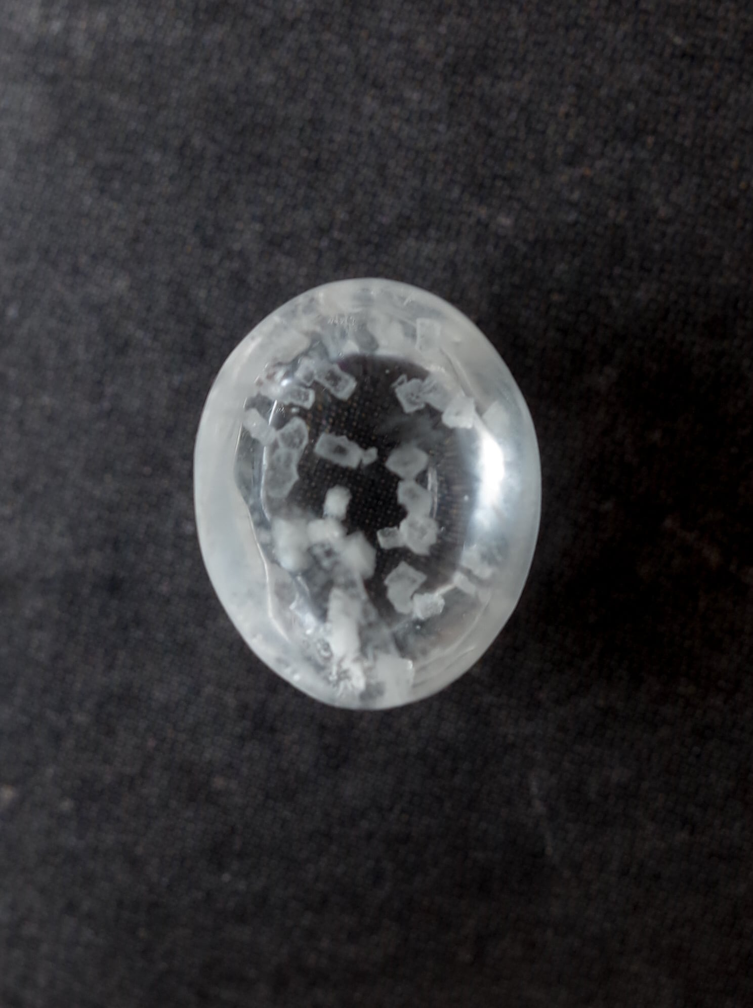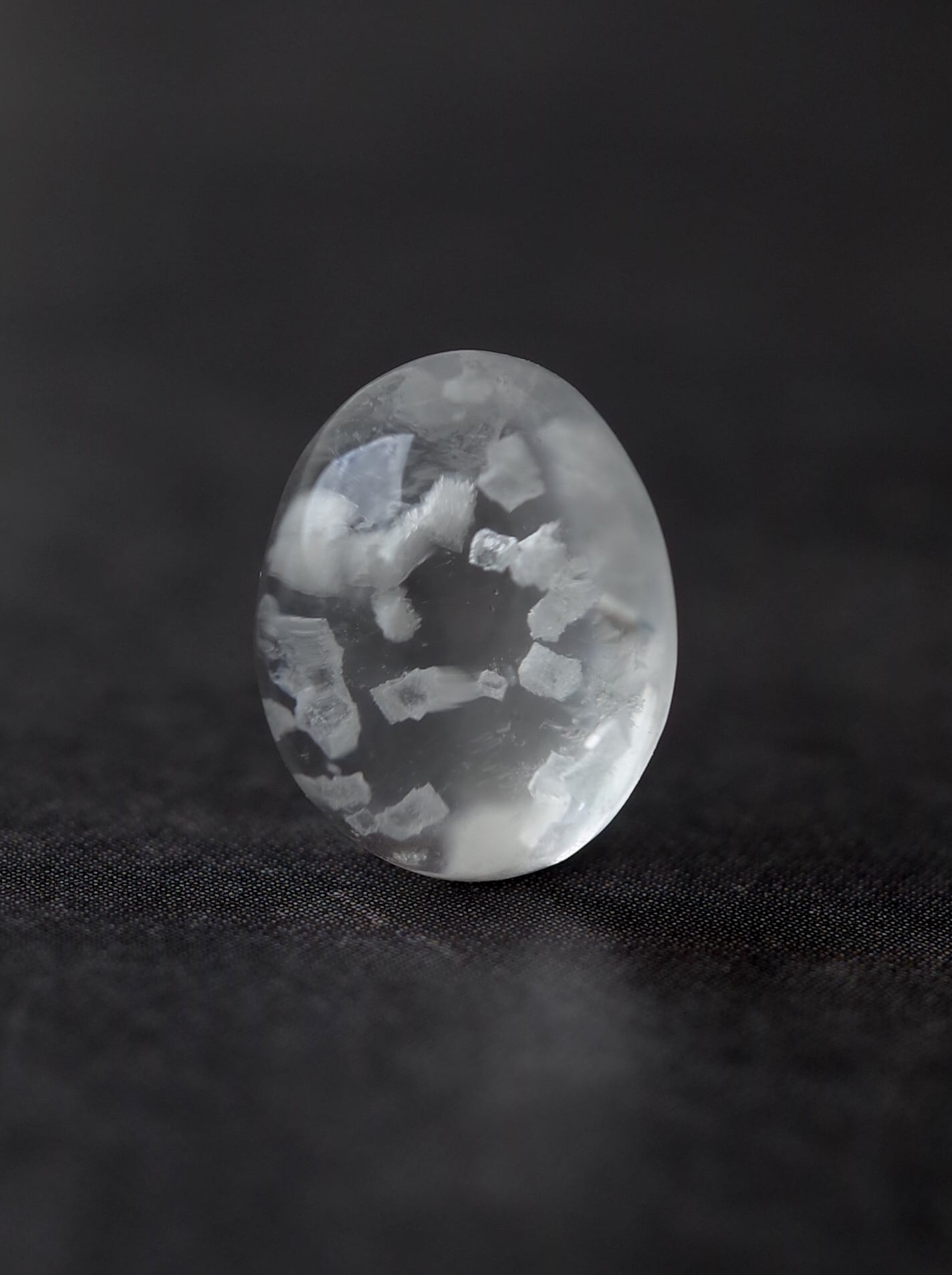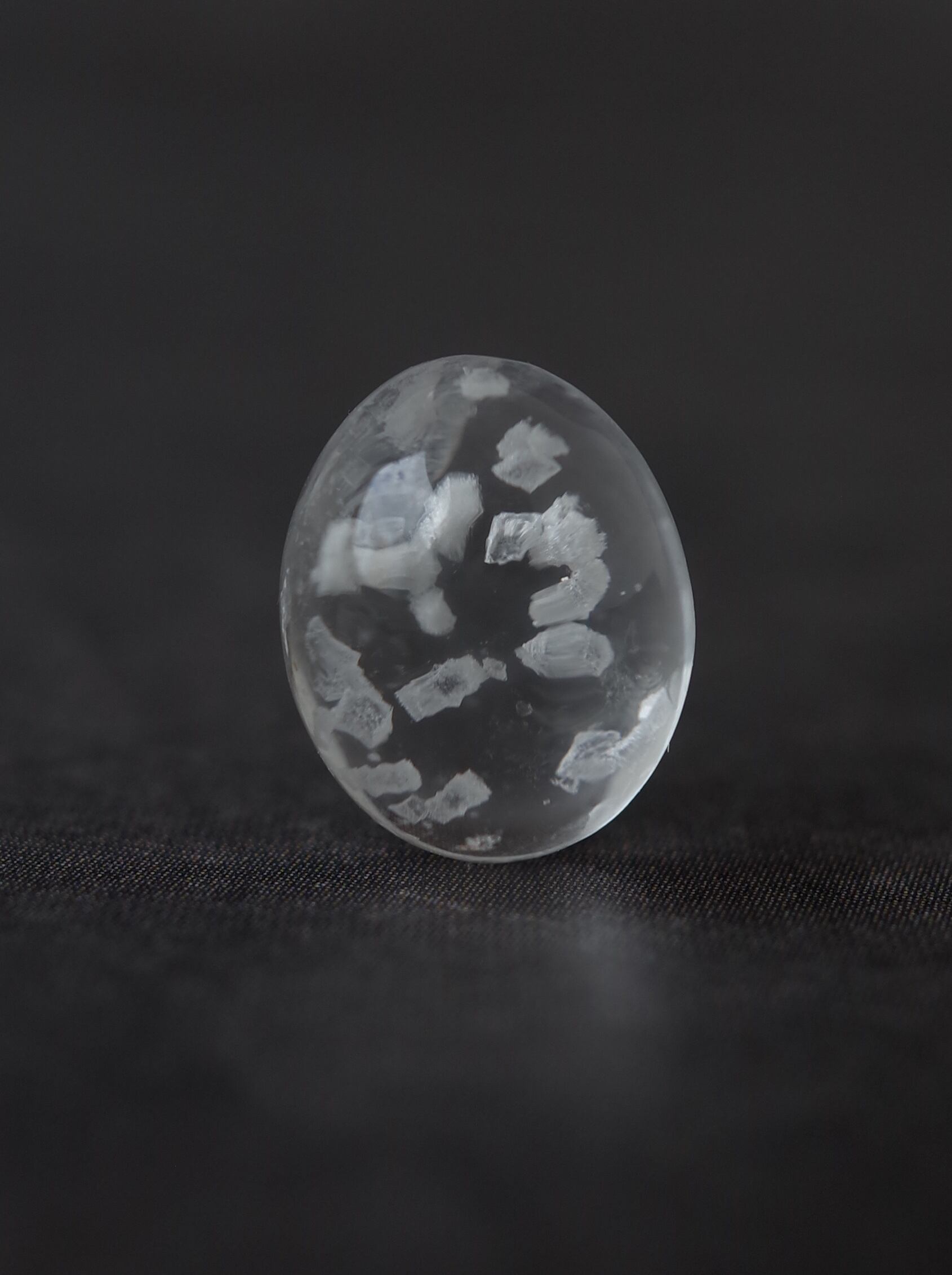 This is a Calcite-in-Quartz that feels perfect for winter, evoking the image of snow gently and endlessly falling through tiny calcite crystals. While calcite is often included as solid, three-dimensional crystals, in this piece the crystals are exceptionally thin and translucent, giving the stone a soft, delicate, and ephemeral beauty.