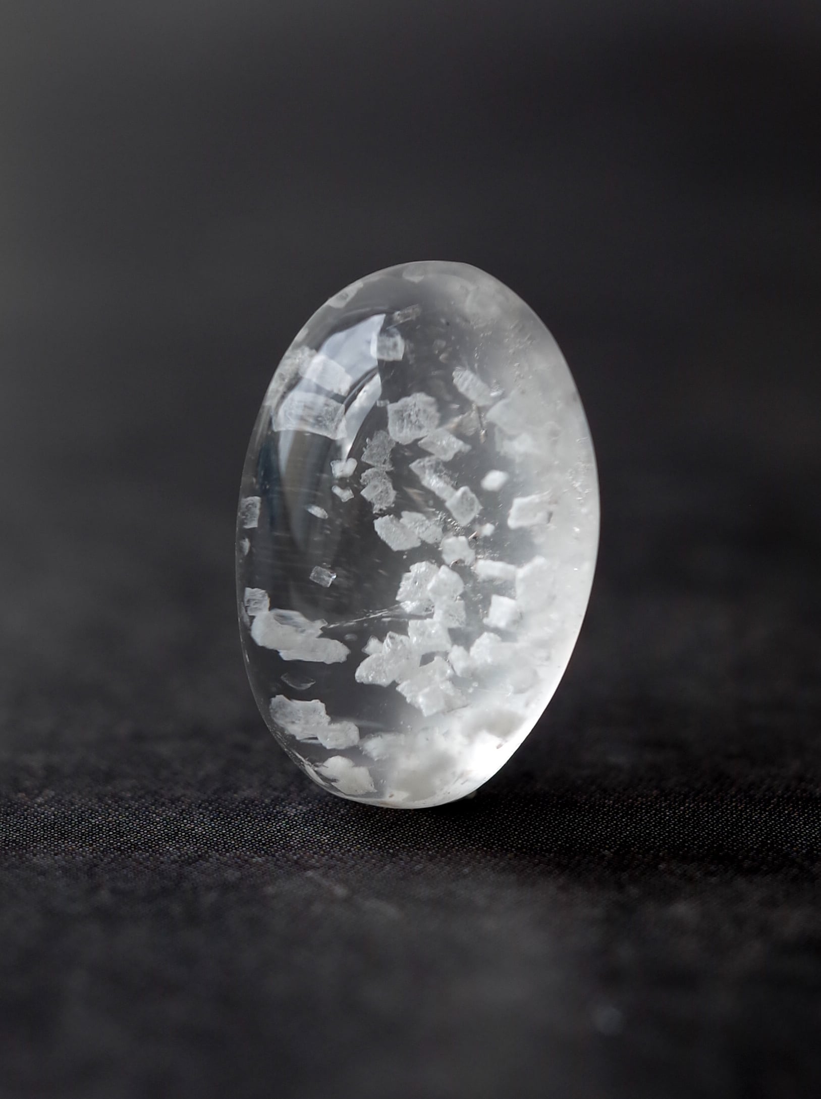 こちらは小さなカルサイトの結晶が、雪が深々と降るような景色を連想させる、冬にぴったりのカルサイトインクォーツです。立体的な結晶で内包されることが多いカルサイトですが、こちらは結晶そのものが透け感があるほど薄く、優しく儚い印象魅力です。