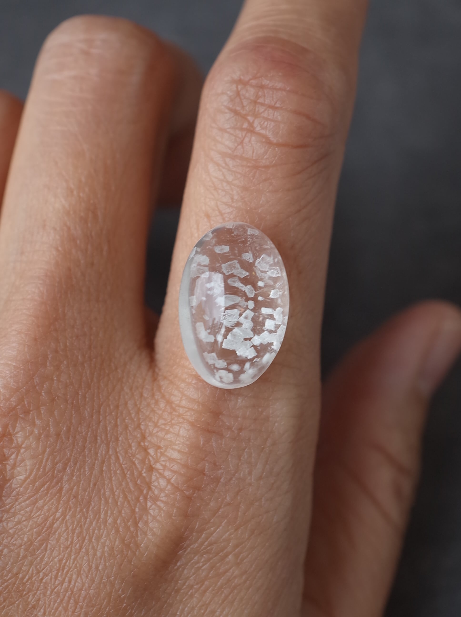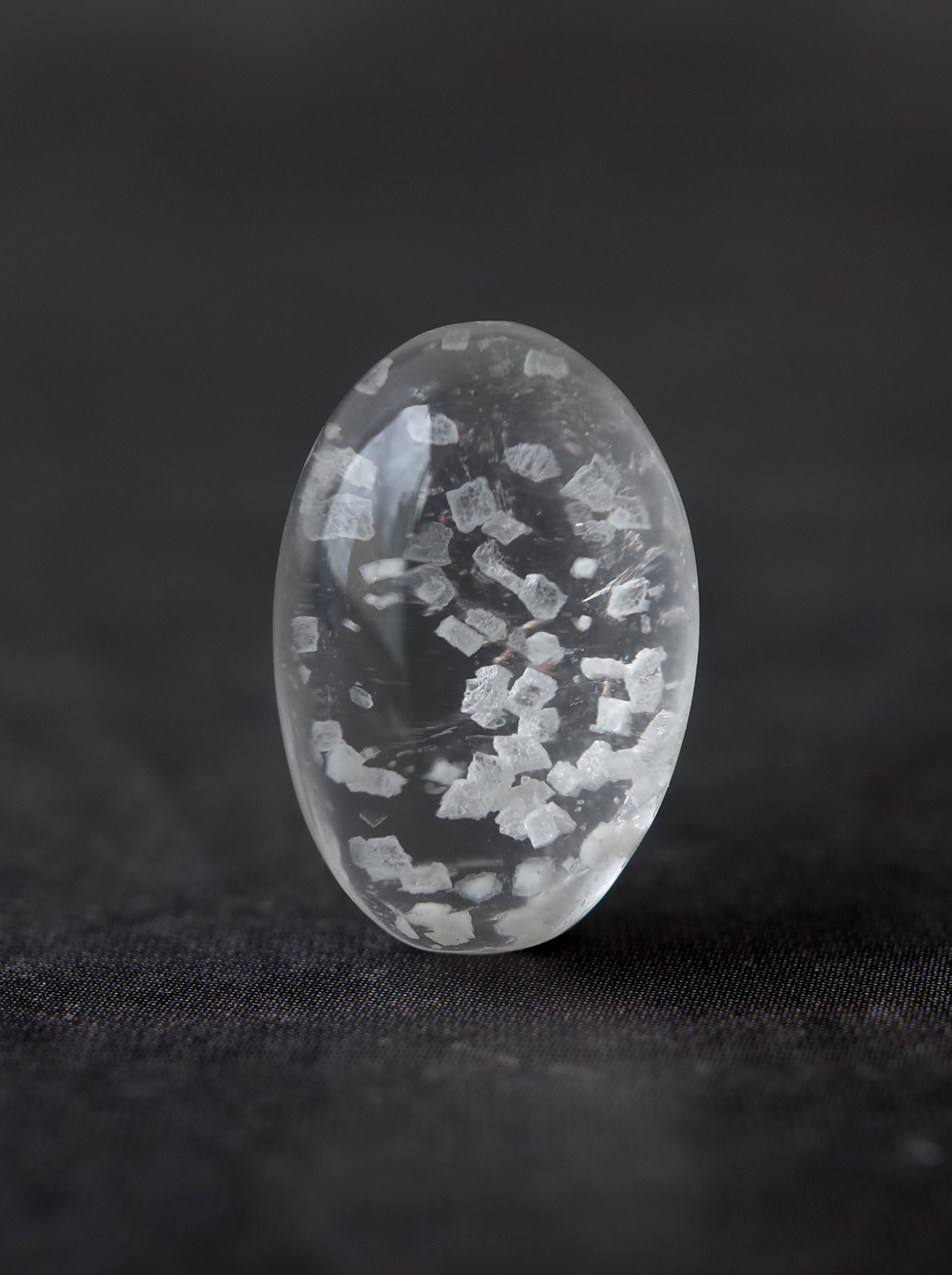 This is a Calcite-in-Quartz that feels perfect for winter, evoking the image of snow gently and endlessly falling through tiny calcite crystals. While calcite is often included as solid, three-dimensional crystals, in this piece the crystals are exceptionally thin and translucent, giving the stone a soft, delicate, and ephemeral beauty.
