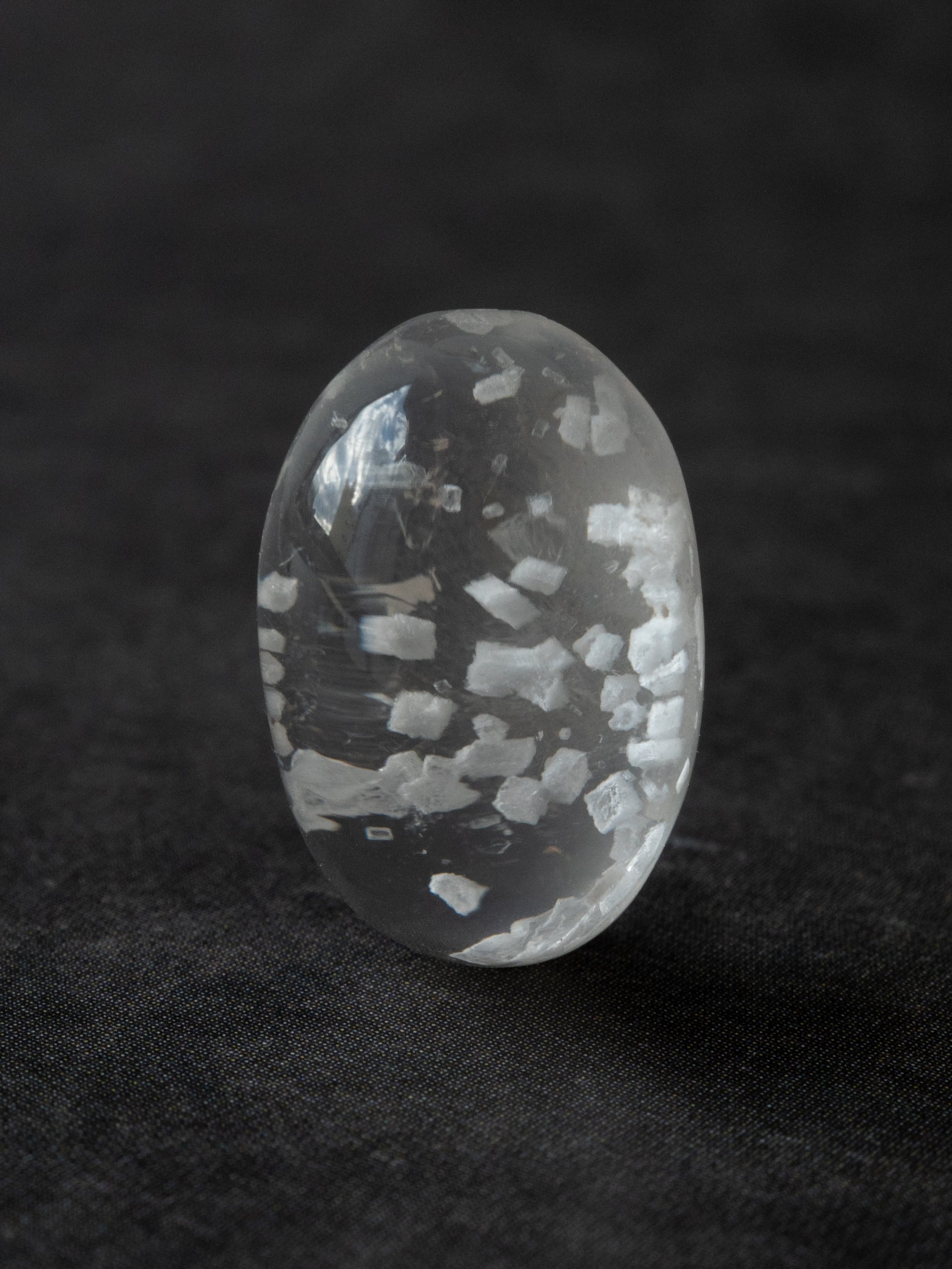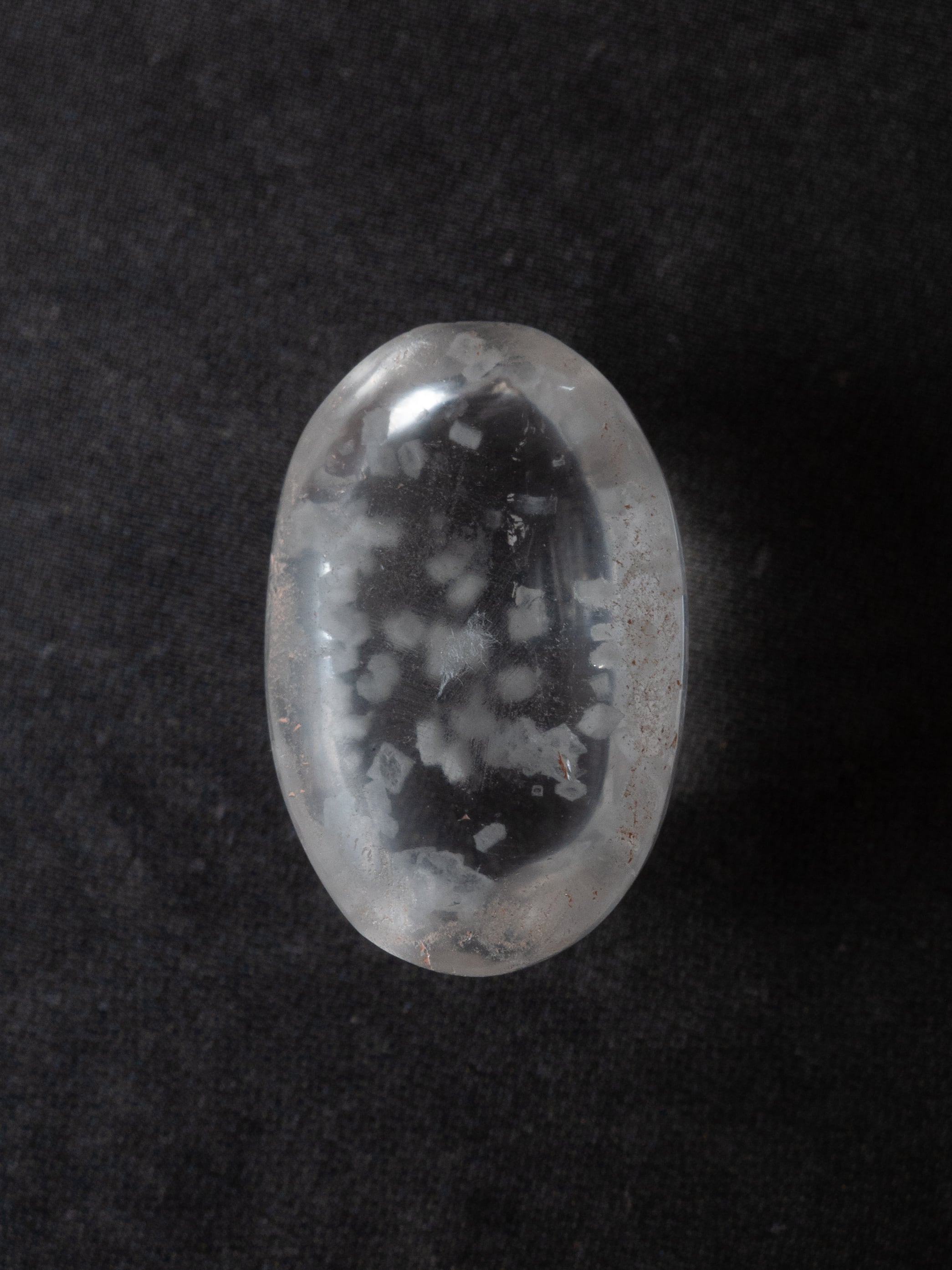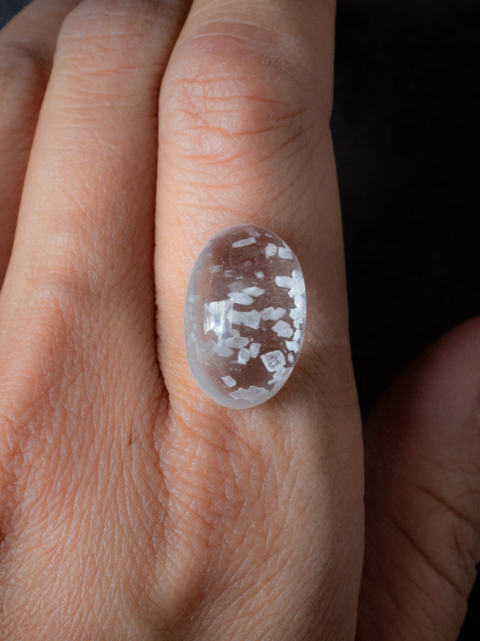 This is a Calcite-in-Quartz that feels perfect for winter, evoking the image of snow gently and endlessly falling through tiny calcite crystals. While calcite is often included as solid, three-dimensional crystals, in this piece the crystals are exceptionally thin and translucent, giving the stone a soft, delicate, and ephemeral beauty.