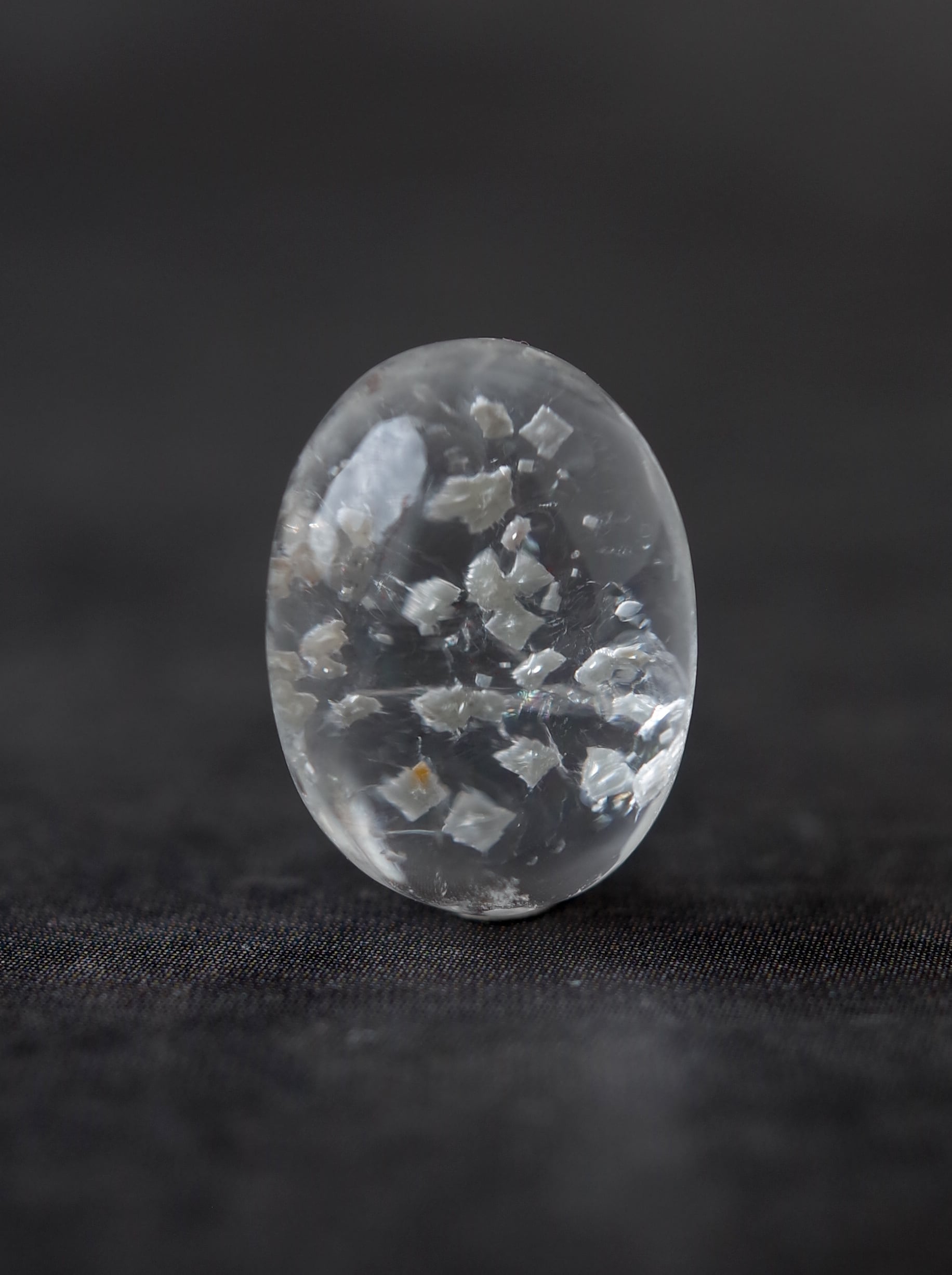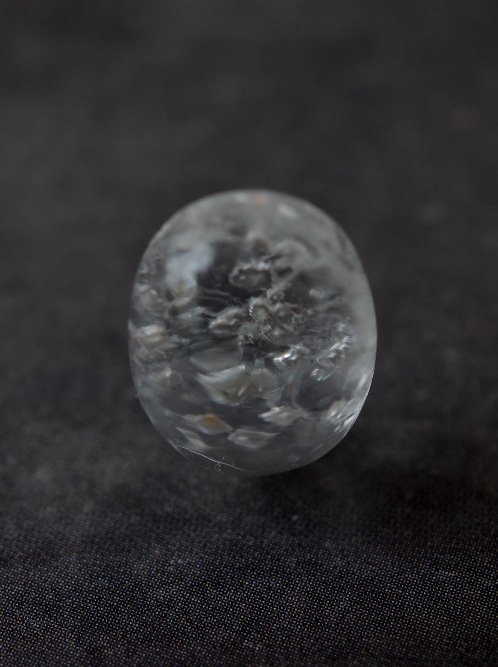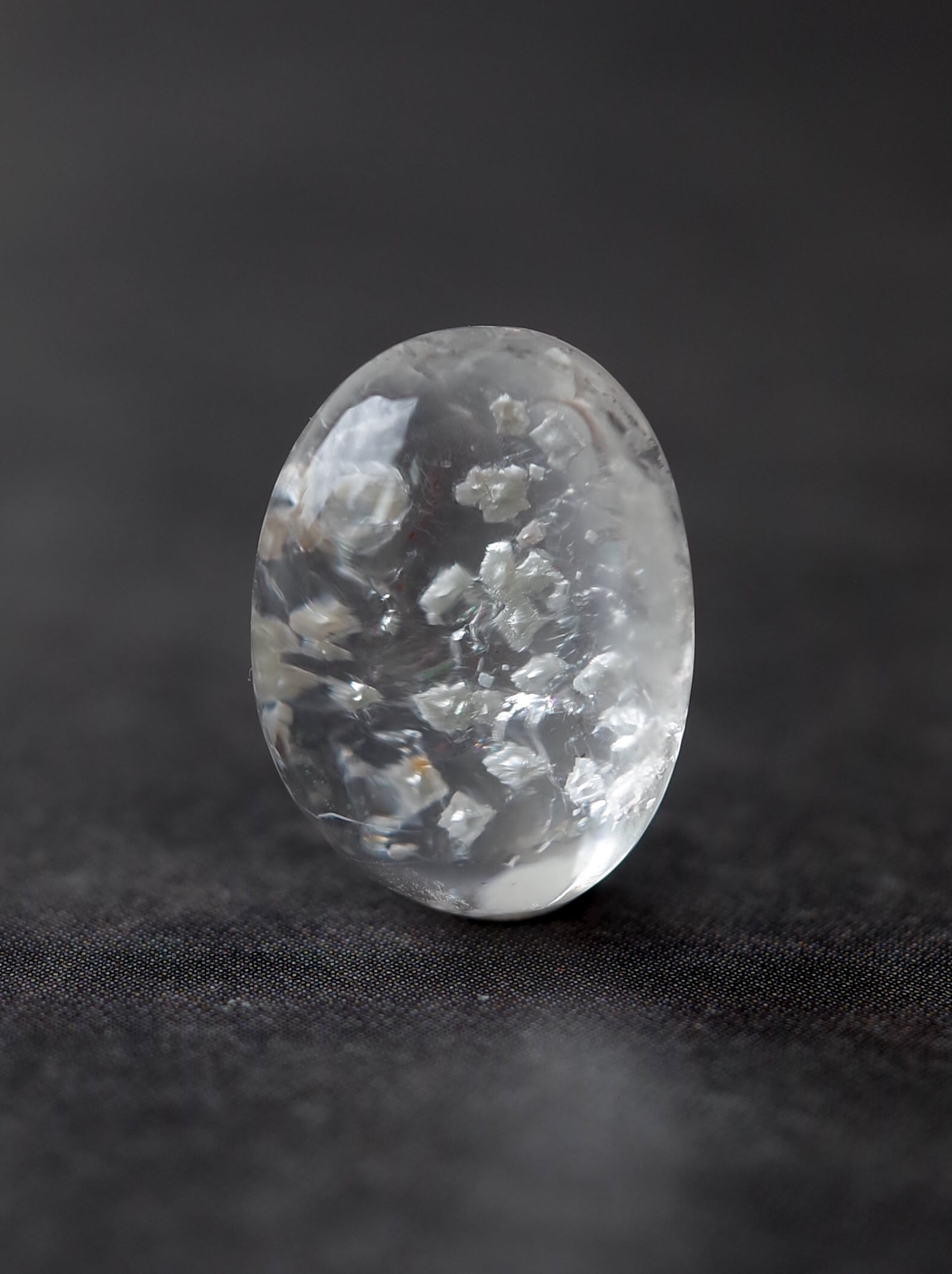 This is a Calcite-in-Quartz that feels perfect for winter, evoking the image of snow gently and endlessly falling through tiny calcite crystals. While calcite is often included as solid, three-dimensional crystals, in this piece the crystals are exceptionally thin and translucent, giving the stone a soft, delicate, and ephemeral beauty.