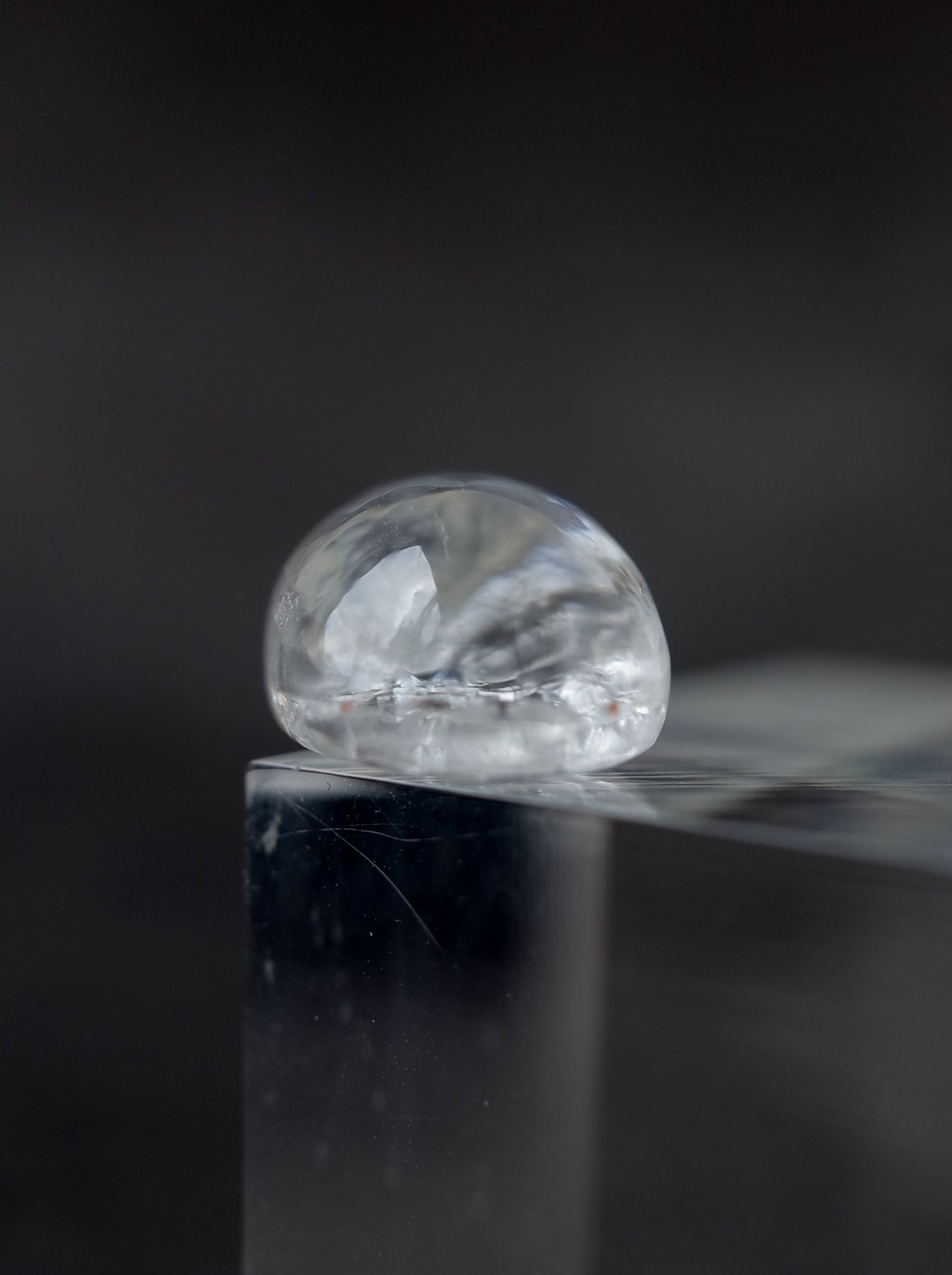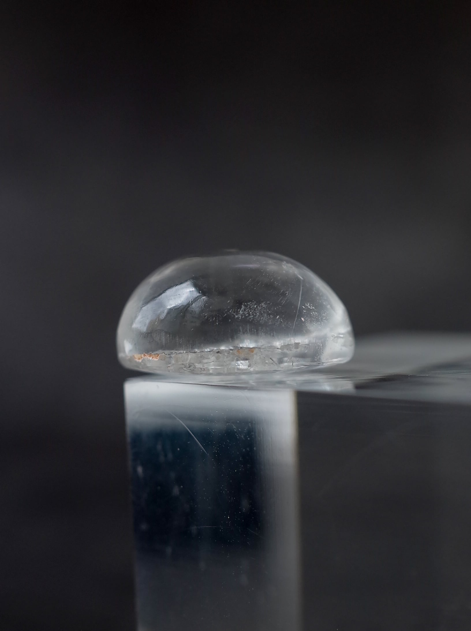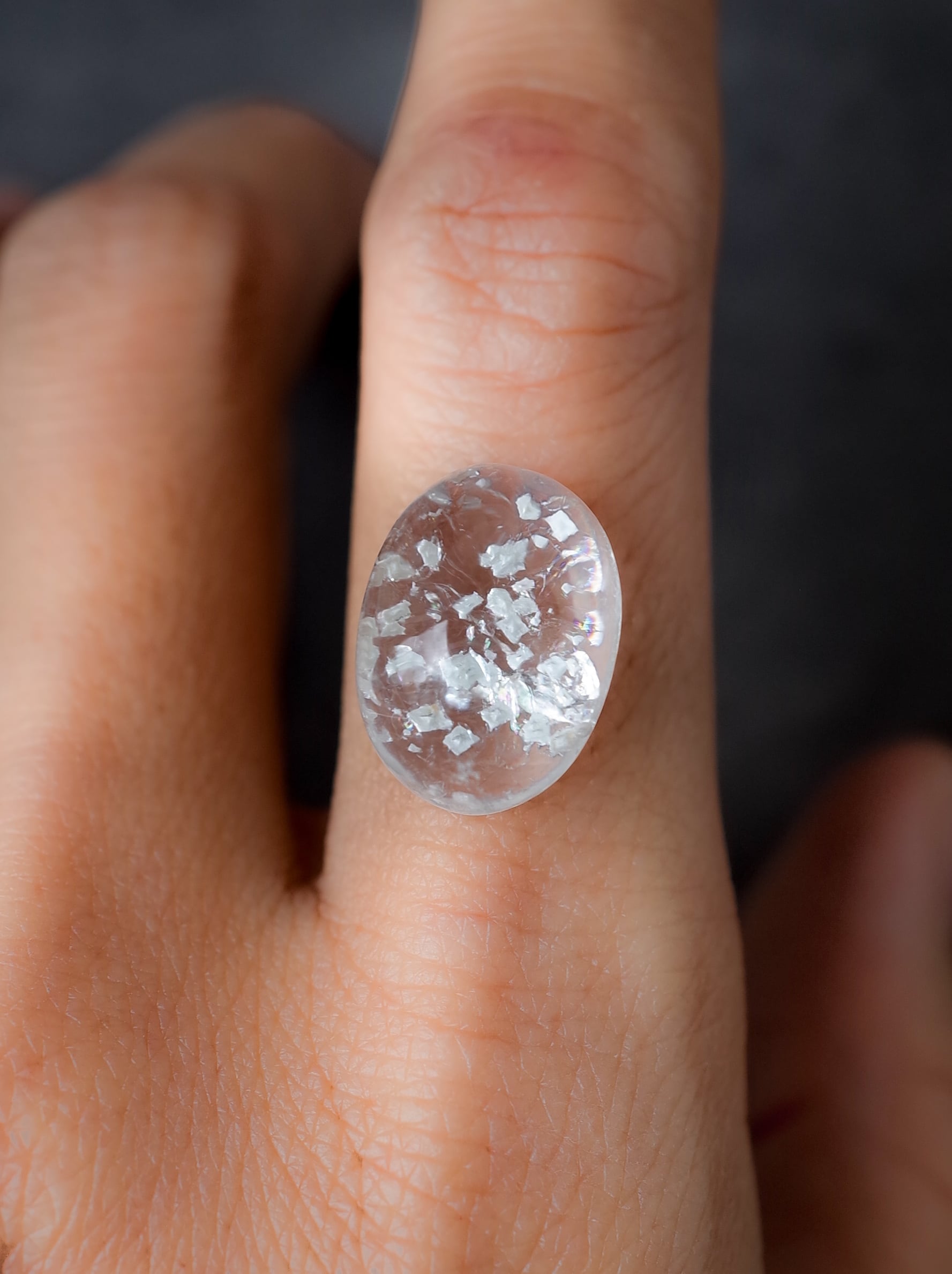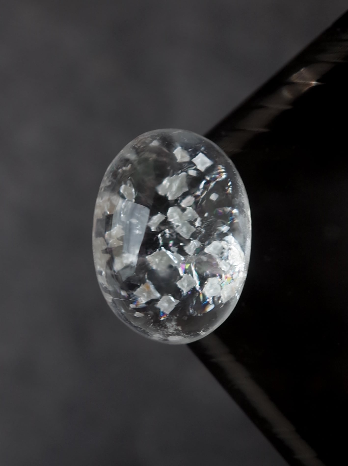 This is a Calcite-in-Quartz that feels perfect for winter, evoking the image of snow gently and endlessly falling through tiny calcite crystals. While calcite is often included as solid, three-dimensional crystals, in this piece the crystals are exceptionally thin and translucent, giving the stone a soft, delicate, and ephemeral beauty.
